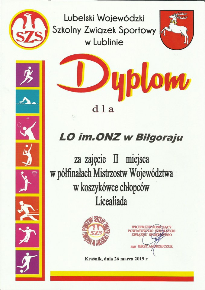 W dniu 28 marca uczniowie I LO im. ONZ uczestniczyli jako mistrzowie Powiatu biłgorajskiego w półfinałach Mistrzostw Województwa w koszykówce chłopców w kategorii Licealiada. Szkołę reprezentowali: Kleban Michał, Dmucha Maciej, Sławkowski Jakub, Kupiec Damian, Gajór Michał, Poznański Dawid, Majcher Wojciech, Selak Piotr, Bondyra Michał, oraz w rozgrywkach powiatowych Ciepłowski Maciej.