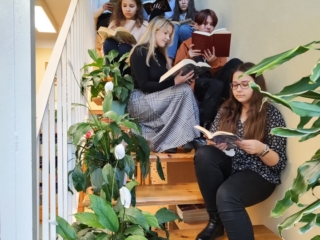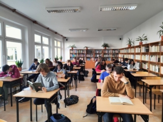 W ramach Międzynarodowego Miesiąca Bibliotek Szkolnych oraz kampanii społecznej „Cała Polska czyta dzieciom” 26 października uczniowie naszej szkoły uczestniczyli w akcji „Przerwa na czytanie – bicie rekordu w czytaniu na przerwie”. Licealiści czytali swoją ulubioną literaturę w różnych zakątkach szkoły oraz w plenerze. Głównym celem akcji była promocja czytelnictwa oraz pokazanie młodzieży, że czytanie w życiu człowieka jest bardzo ważne i  w każdej sytuacji warto sięgać po książkę.