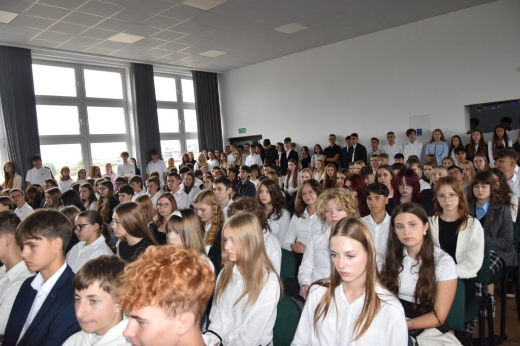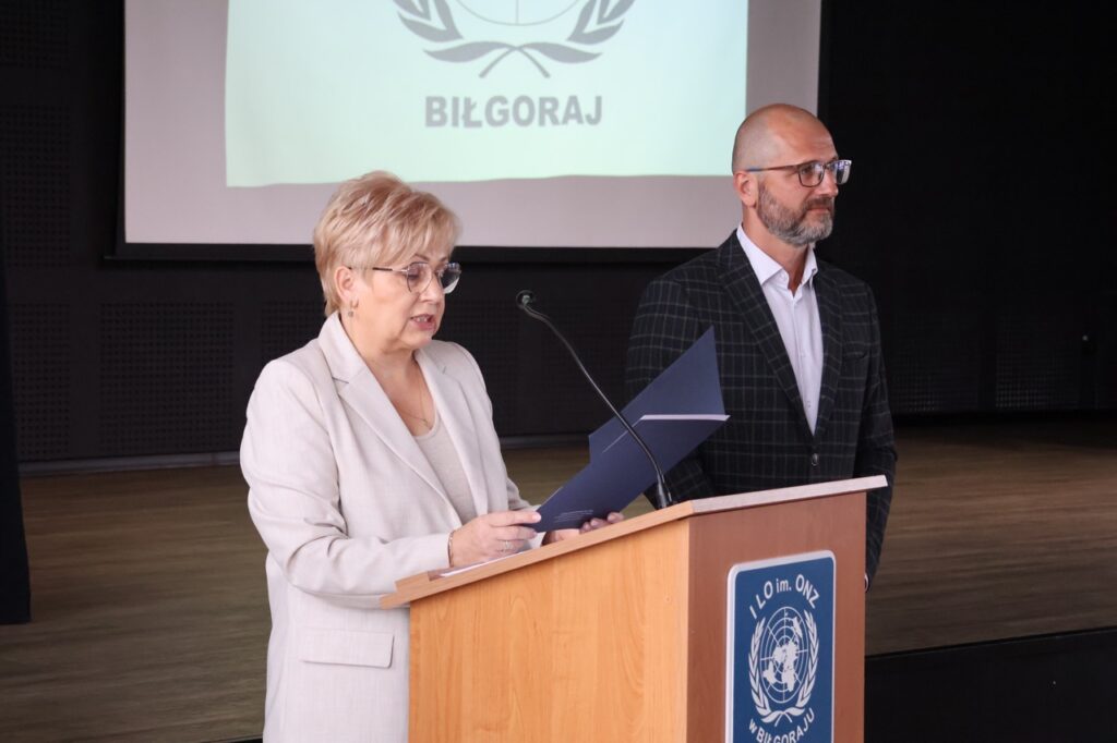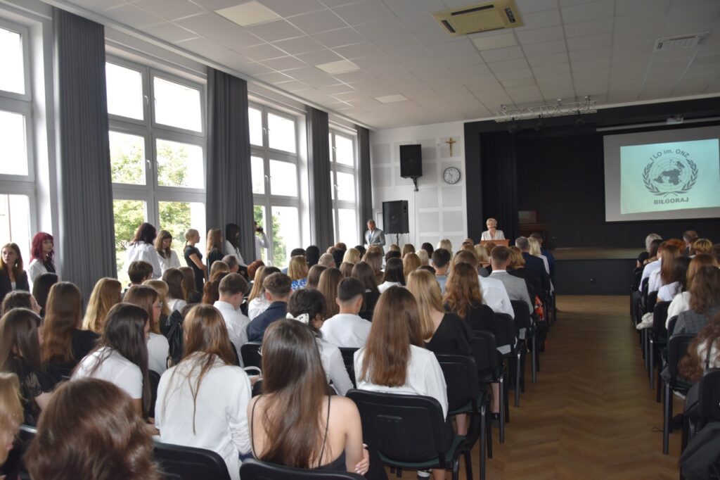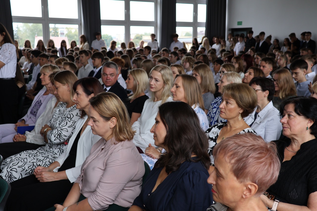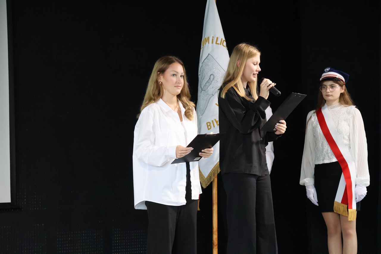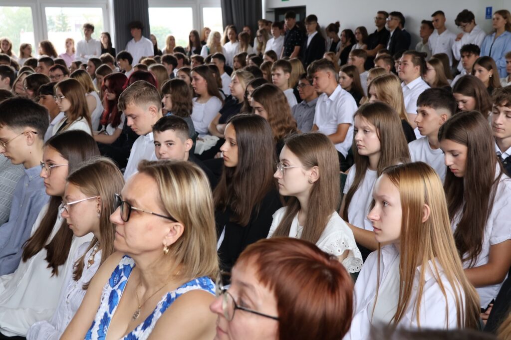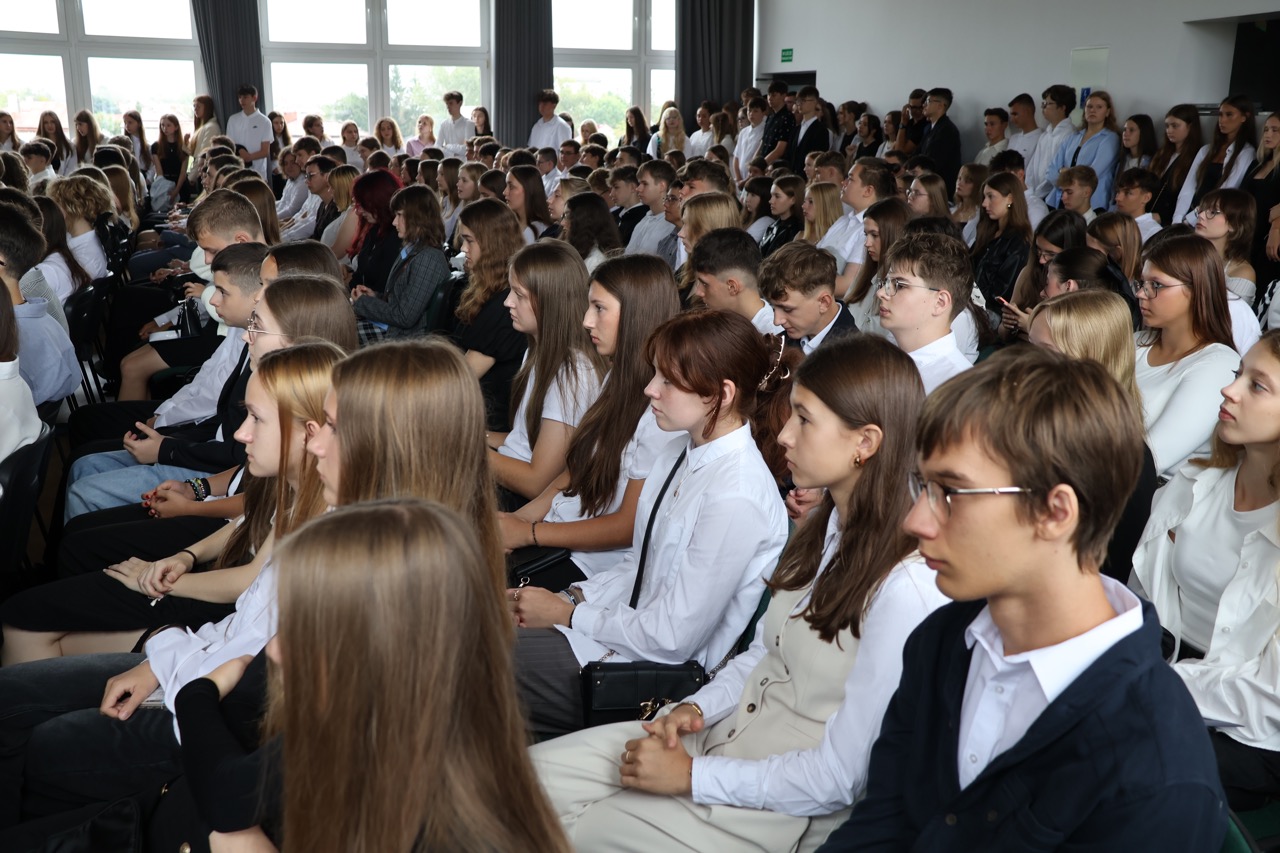 admin 7 miesięcy temu Organizacyjne , UroczystościNowy rok szkolny 2025/2026 społeczność naszego liceum 1 września zainaugurowała mszą świętą w kościele św. Jerzego i spotkaniem w auli, gdzie uczniowie zostali powitani przez dyrekcję szkoły, nauczycieli i rodziców. W uroczystości wzięli udział zaproszeni goście: etatowy członek Zarządu Powiatu Biłgorajskiego Bartłomiej Świtała, przewodniczący Rady Rodziców Jarosław Świtała oraz Katarzyna Kobel z Biura Komunikacji Medialnej, Informacji i Promocji Starostwa Powiatowego. Podczas wystąpienia Dyrektor Jolanta Rycyk szczególnie ciepłe słowa skierowała do młodzieży rozpoczynającej naukę w liceum, maturzystom z kolei życzyła jak najwyższych wyników na egzaminie maturalnym. Pani Dyrektor laureatom konkursów organizowanych przez Lubelskiego Kuratora Oświaty wręczyła stypendia ufundowane przez Uczniowski Fundusz Oświaty oraz legitymacje szkolne, a listami gratulacyjnymi uhonorowała uczniów, którzy reprezentowali szkołę w poczcie sztandarowym podczas wakacji. W rozpoczynającym się roku szkolnym życzyła wszystkim dużo zdrowia, entuzjazmu i sukcesów w podejmowanych działaniach. Do życzeń dołączyli się goście i przedstawiciele Samorządu Uczniowskiego.