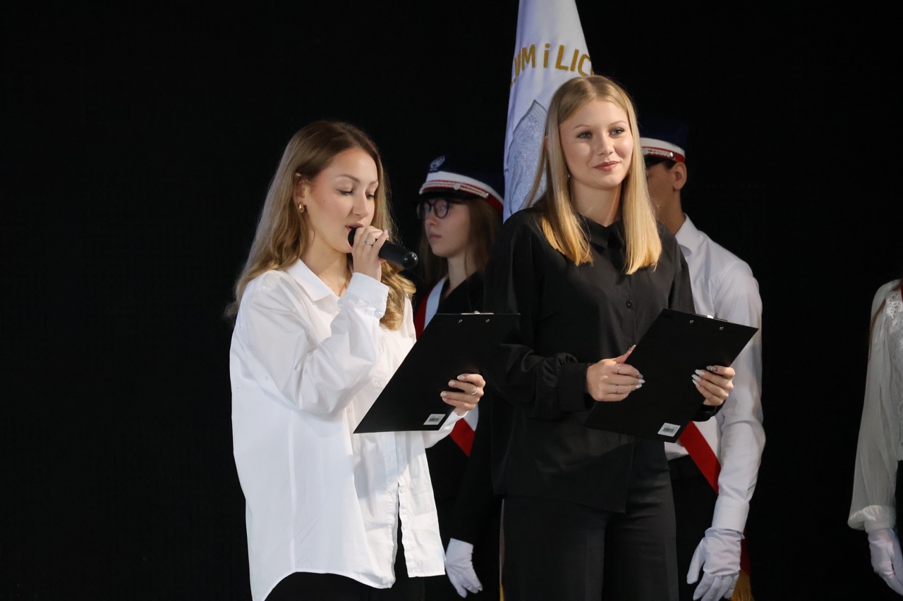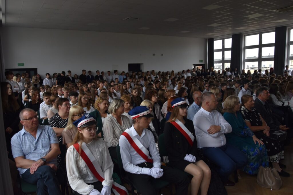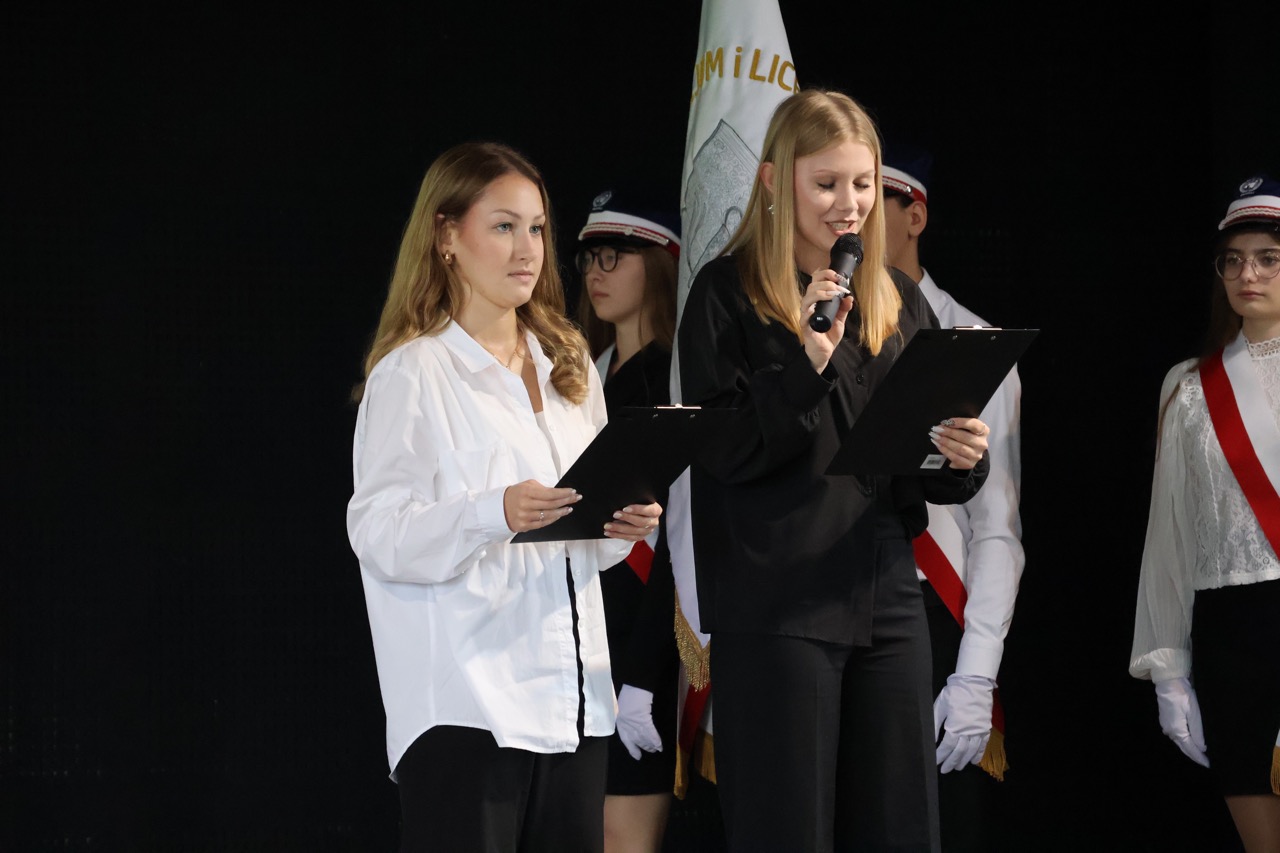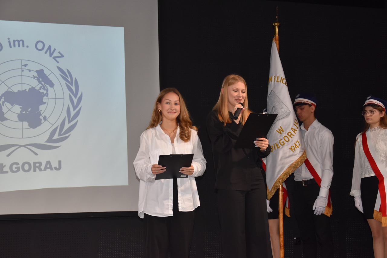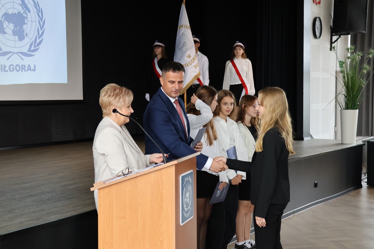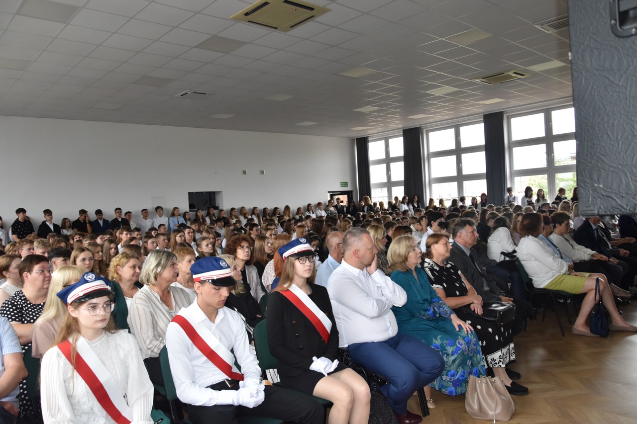 admin 7 miesięcy temu Organizacyjne , UroczystościNowy rok szkolny 2025/2026 społeczność naszego liceum 1 września zainaugurowała mszą świętą w kościele św. Jerzego i spotkaniem w auli, gdzie uczniowie zostali powitani przez dyrekcję szkoły, nauczycieli i rodziców. W uroczystości wzięli udział zaproszeni goście: etatowy członek Zarządu Powiatu Biłgorajskiego Bartłomiej Świtała, przewodniczący Rady Rodziców Jarosław Świtała oraz Katarzyna Kobel z Biura Komunikacji Medialnej, Informacji i Promocji Starostwa Powiatowego. Podczas wystąpienia Dyrektor Jolanta Rycyk szczególnie ciepłe słowa skierowała do młodzieży rozpoczynającej naukę w liceum, maturzystom z kolei życzyła jak najwyższych wyników na egzaminie maturalnym. Pani Dyrektor laureatom konkursów organizowanych przez Lubelskiego Kuratora Oświaty wręczyła stypendia ufundowane przez Uczniowski Fundusz Oświaty oraz legitymacje szkolne, a listami gratulacyjnymi uhonorowała uczniów, którzy reprezentowali szkołę w poczcie sztandarowym podczas wakacji. W rozpoczynającym się roku szkolnym życzyła wszystkim dużo zdrowia, entuzjazmu i sukcesów w podejmowanych działaniach. Do życzeń dołączyli się goście i przedstawiciele Samorządu Uczniowskiego.
