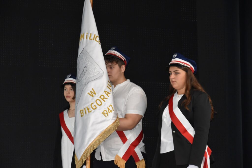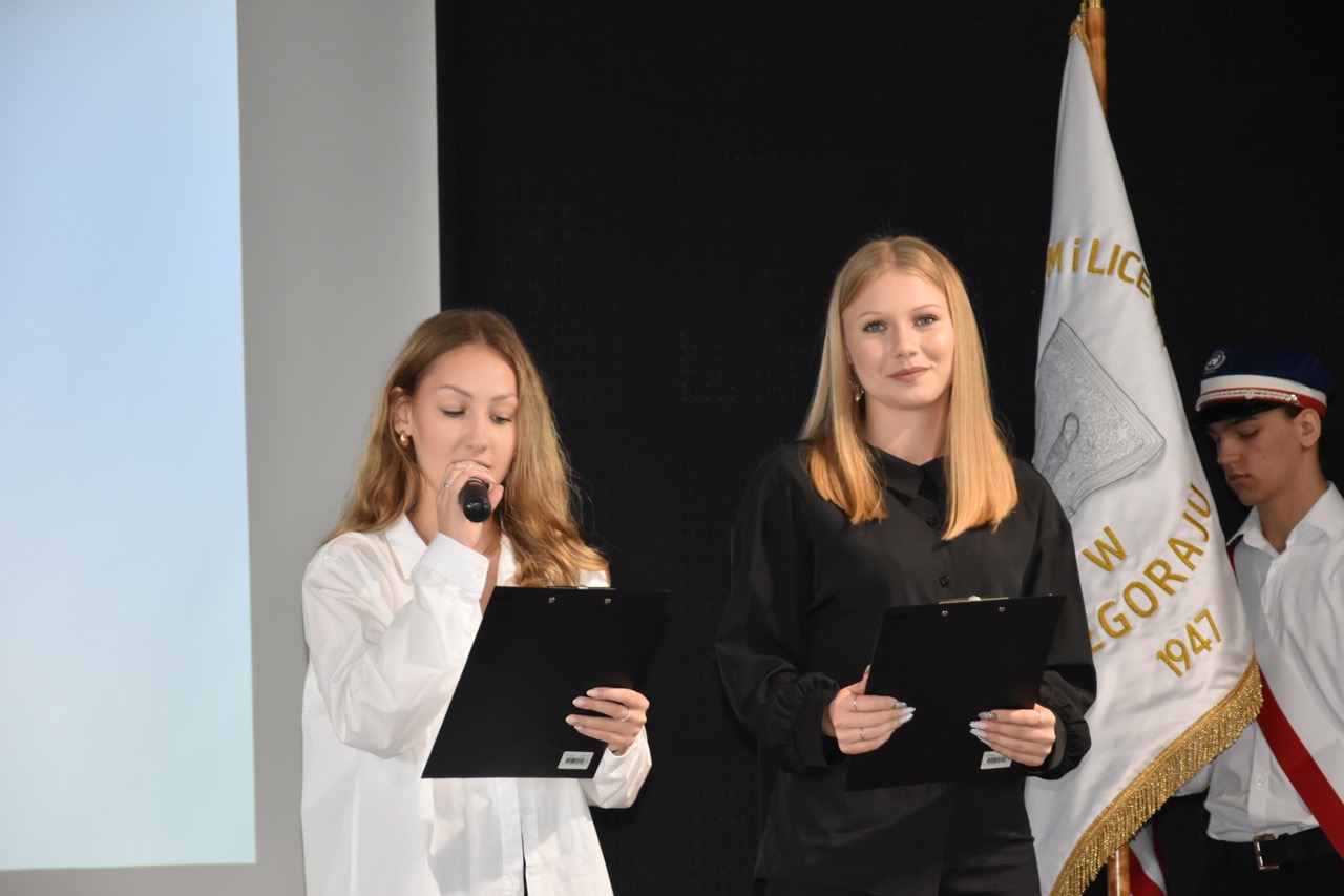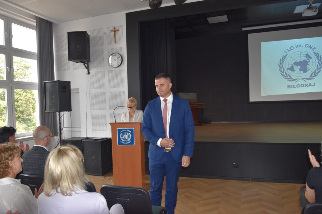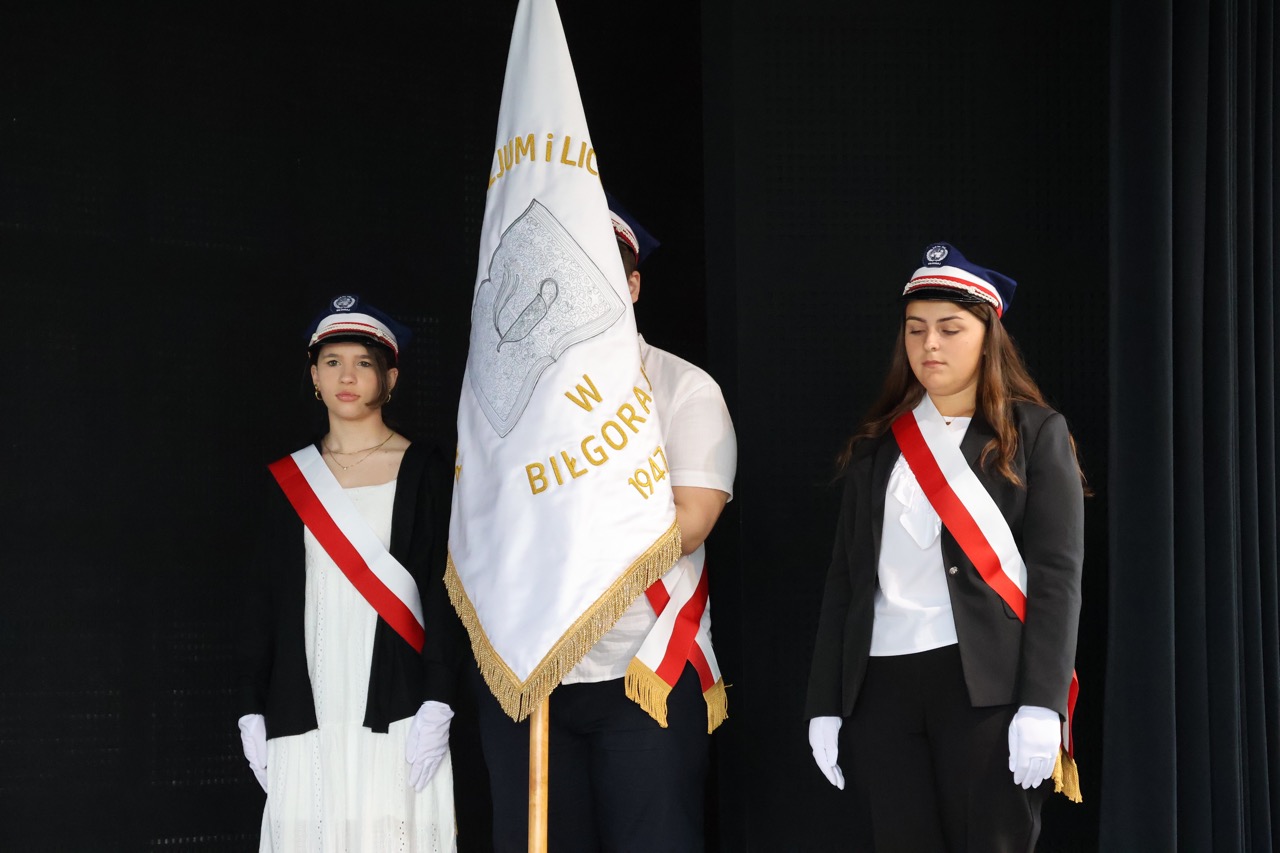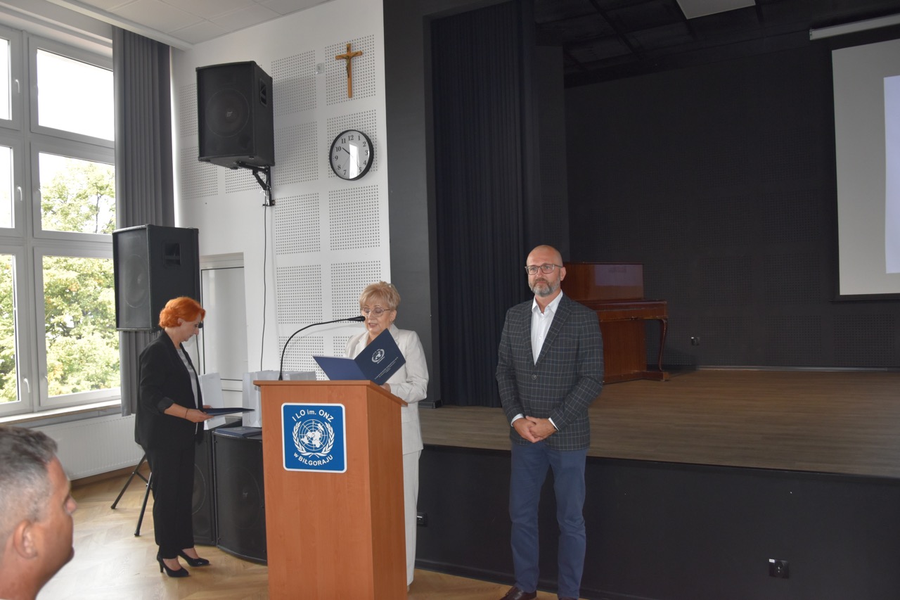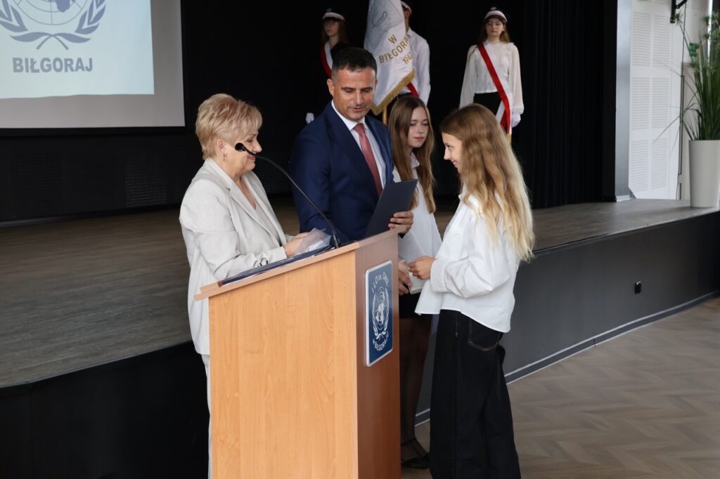 admin 7 miesięcy temu Organizacyjne , UroczystościNowy rok szkolny 2025/2026 społeczność naszego liceum 1 września zainaugurowała mszą świętą w kościele św. Jerzego i spotkaniem w auli, gdzie uczniowie zostali powitani przez dyrekcję szkoły, nauczycieli i rodziców. W uroczystości wzięli udział zaproszeni goście: etatowy członek Zarządu Powiatu Biłgorajskiego Bartłomiej Świtała, przewodniczący Rady Rodziców Jarosław Świtała oraz Katarzyna Kobel z Biura Komunikacji Medialnej, Informacji i Promocji Starostwa Powiatowego. Podczas wystąpienia Dyrektor Jolanta Rycyk szczególnie ciepłe słowa skierowała do młodzieży rozpoczynającej naukę w liceum, maturzystom z kolei życzyła jak najwyższych wyników na egzaminie maturalnym. Pani Dyrektor laureatom konkursów organizowanych przez Lubelskiego Kuratora Oświaty wręczyła stypendia ufundowane przez Uczniowski Fundusz Oświaty oraz legitymacje szkolne, a listami gratulacyjnymi uhonorowała uczniów, którzy reprezentowali szkołę w poczcie sztandarowym podczas wakacji. W rozpoczynającym się roku szkolnym życzyła wszystkim dużo zdrowia, entuzjazmu i sukcesów w podejmowanych działaniach. Do życzeń dołączyli się goście i przedstawiciele Samorządu Uczniowskiego.