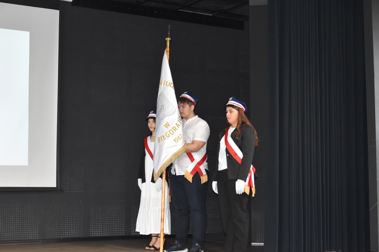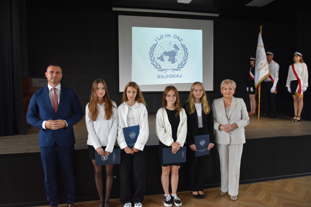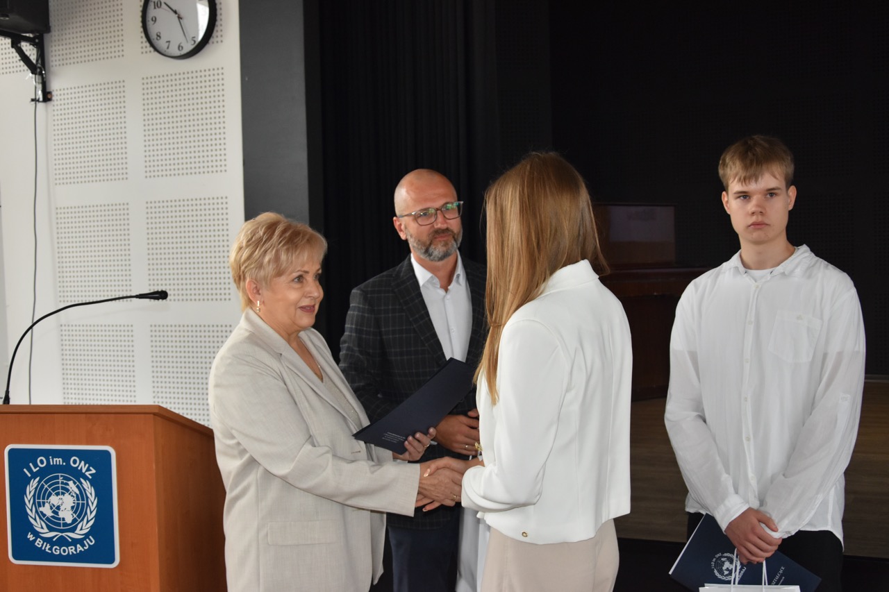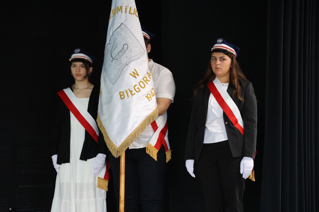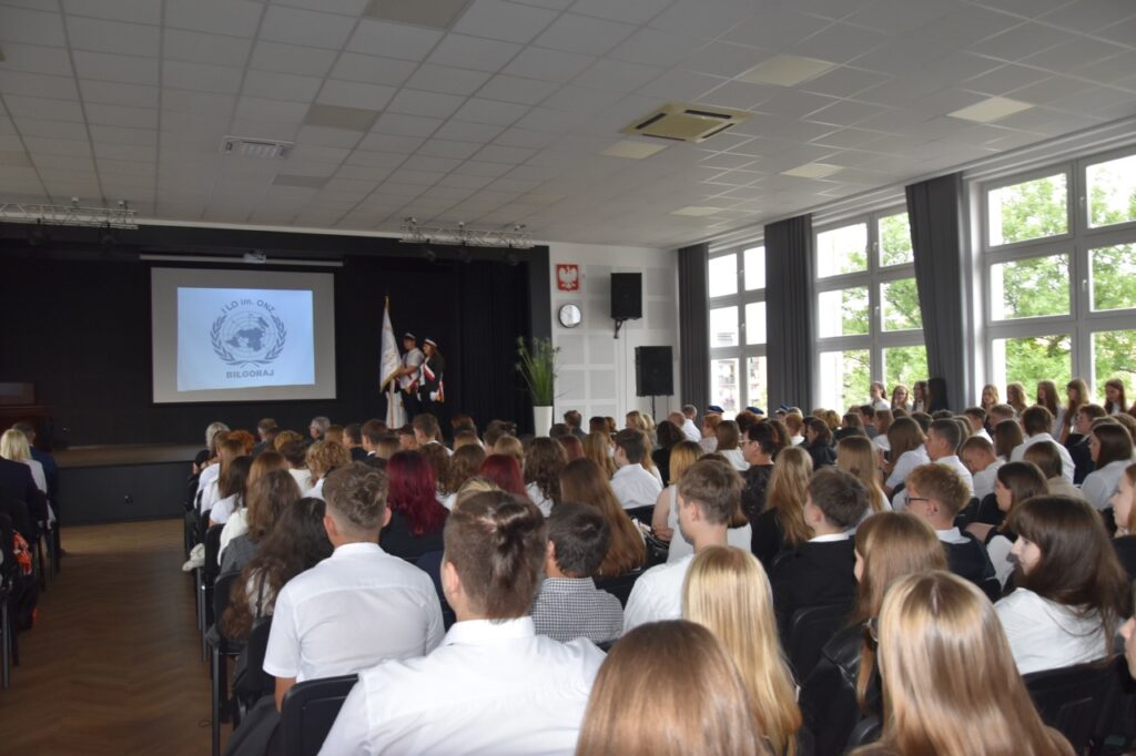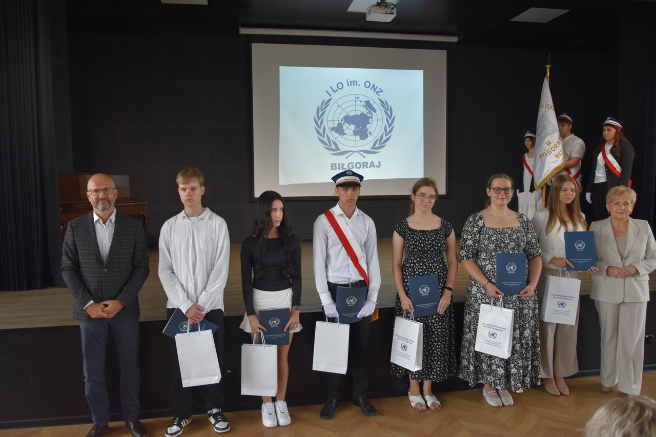 admin 7 miesięcy temu Organizacyjne , UroczystościNowy rok szkolny 2025/2026 społeczność naszego liceum 1 września zainaugurowała mszą świętą w kościele św. Jerzego i spotkaniem w auli, gdzie uczniowie zostali powitani przez dyrekcję szkoły, nauczycieli i rodziców. W uroczystości wzięli udział zaproszeni goście: etatowy członek Zarządu Powiatu Biłgorajskiego Bartłomiej Świtała, przewodniczący Rady Rodziców Jarosław Świtała oraz Katarzyna Kobel z Biura Komunikacji Medialnej, Informacji i Promocji Starostwa Powiatowego. Podczas wystąpienia Dyrektor Jolanta Rycyk szczególnie ciepłe słowa skierowała do młodzieży rozpoczynającej naukę w liceum, maturzystom z kolei życzyła jak najwyższych wyników na egzaminie maturalnym. Pani Dyrektor laureatom konkursów organizowanych przez Lubelskiego Kuratora Oświaty wręczyła stypendia ufundowane przez Uczniowski Fundusz Oświaty oraz legitymacje szkolne, a listami gratulacyjnymi uhonorowała uczniów, którzy reprezentowali szkołę w poczcie sztandarowym podczas wakacji. W rozpoczynającym się roku szkolnym życzyła wszystkim dużo zdrowia, entuzjazmu i sukcesów w podejmowanych działaniach. Do życzeń dołączyli się goście i przedstawiciele Samorządu Uczniowskiego.