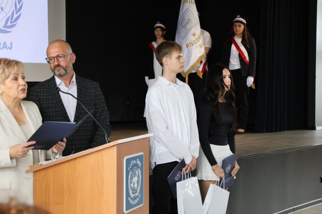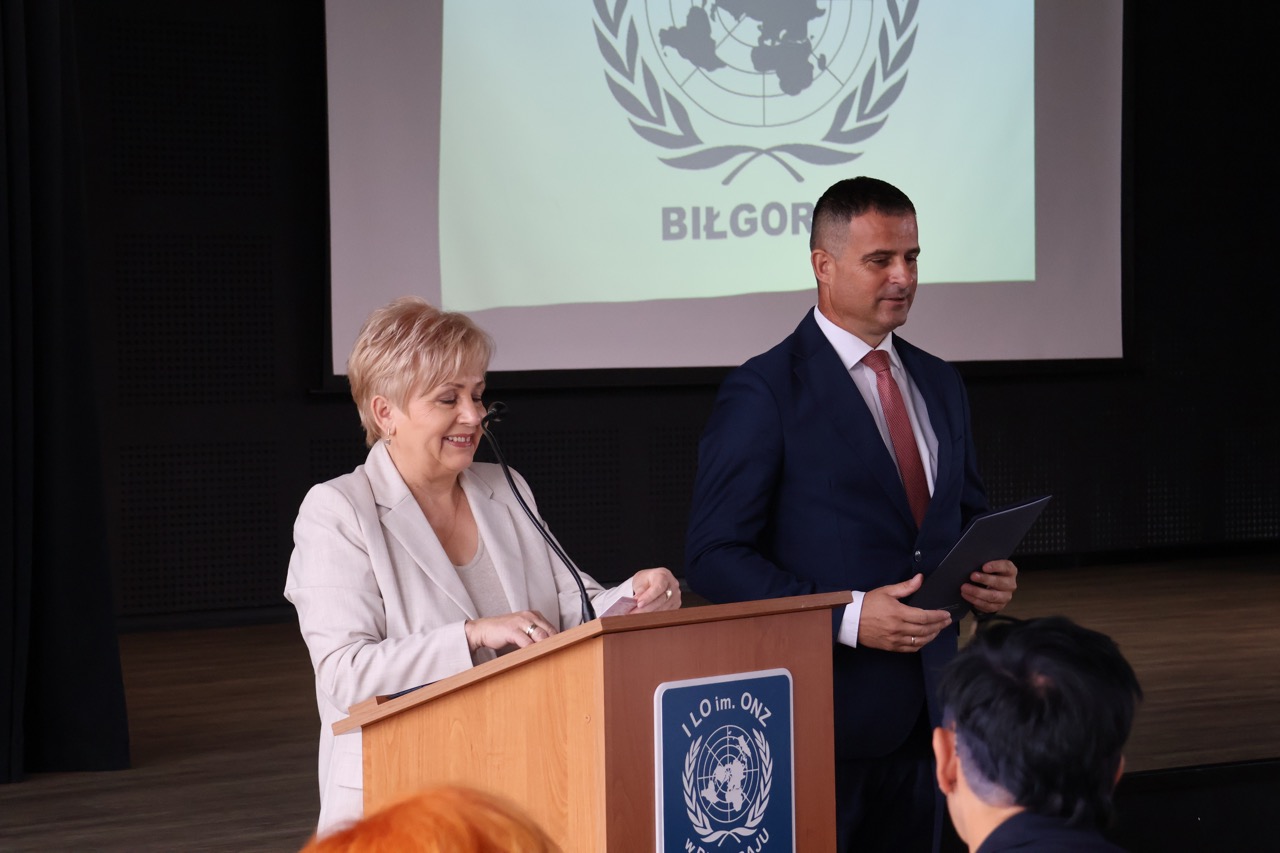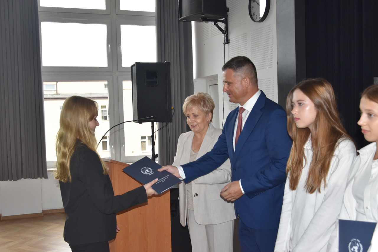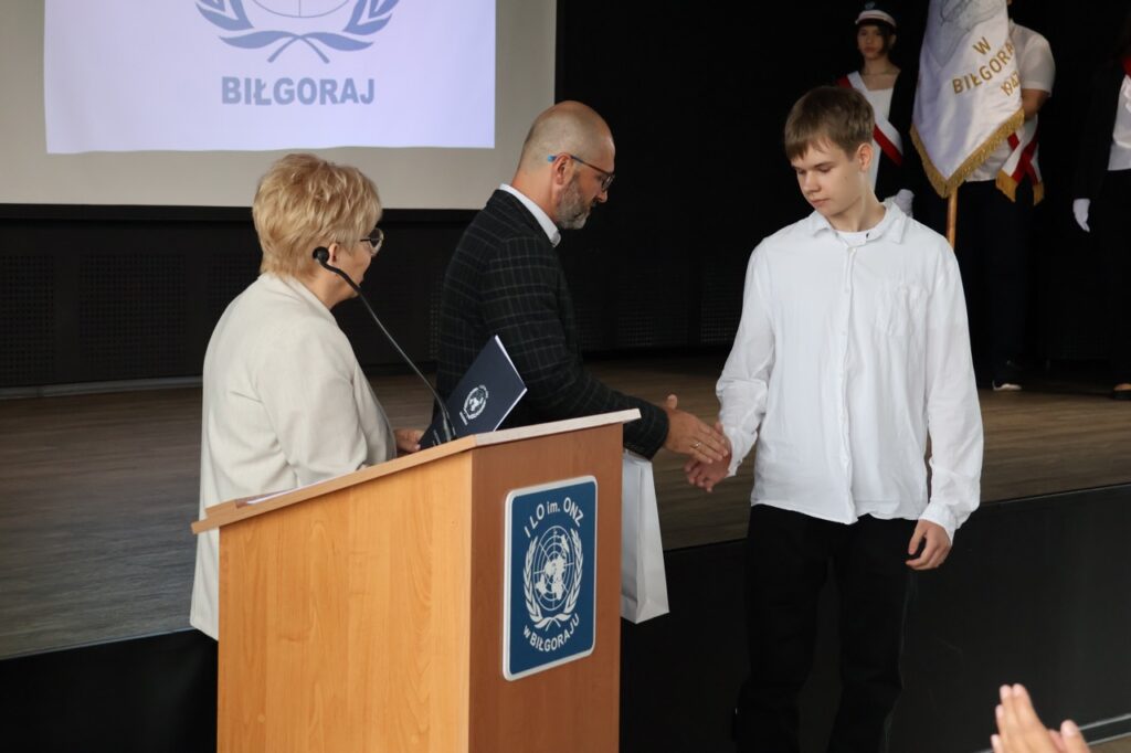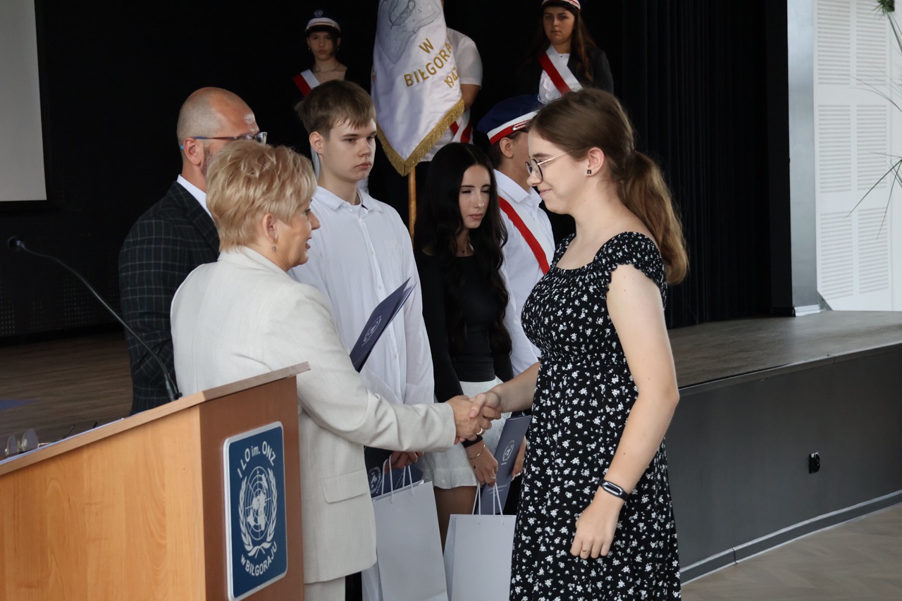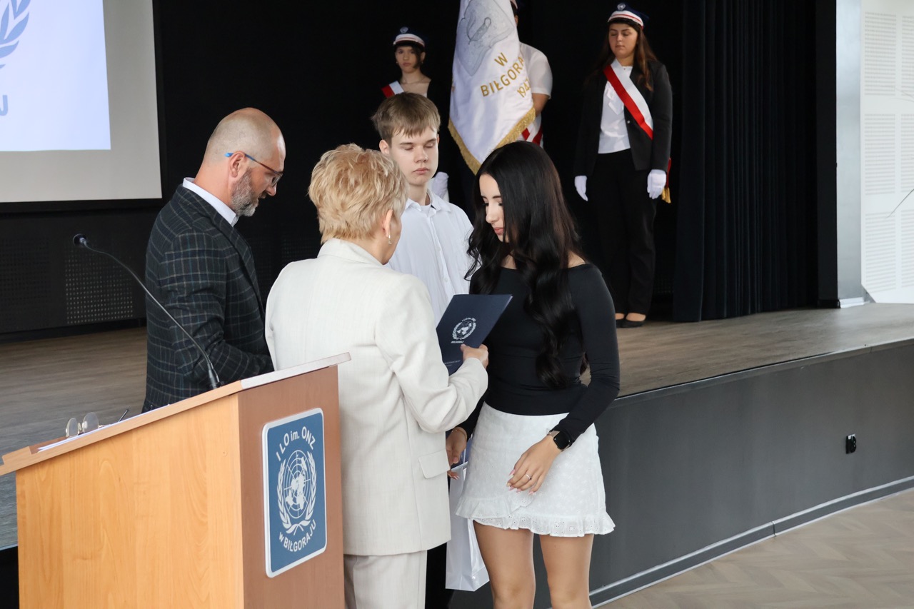 admin 7 miesięcy temu Organizacyjne , UroczystościNowy rok szkolny 2025/2026 społeczność naszego liceum 1 września zainaugurowała mszą świętą w kościele św. Jerzego i spotkaniem w auli, gdzie uczniowie zostali powitani przez dyrekcję szkoły, nauczycieli i rodziców. W uroczystości wzięli udział zaproszeni goście: etatowy członek Zarządu Powiatu Biłgorajskiego Bartłomiej Świtała, przewodniczący Rady Rodziców Jarosław Świtała oraz Katarzyna Kobel z Biura Komunikacji Medialnej, Informacji i Promocji Starostwa Powiatowego. Podczas wystąpienia Dyrektor Jolanta Rycyk szczególnie ciepłe słowa skierowała do młodzieży rozpoczynającej naukę w liceum, maturzystom z kolei życzyła jak najwyższych wyników na egzaminie maturalnym. Pani Dyrektor laureatom konkursów organizowanych przez Lubelskiego Kuratora Oświaty wręczyła stypendia ufundowane przez Uczniowski Fundusz Oświaty oraz legitymacje szkolne, a listami gratulacyjnymi uhonorowała uczniów, którzy reprezentowali szkołę w poczcie sztandarowym podczas wakacji. W rozpoczynającym się roku szkolnym życzyła wszystkim dużo zdrowia, entuzjazmu i sukcesów w podejmowanych działaniach. Do życzeń dołączyli się goście i przedstawiciele Samorządu Uczniowskiego.