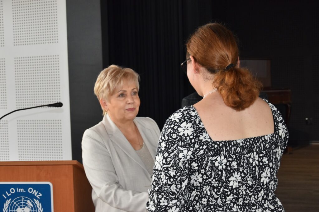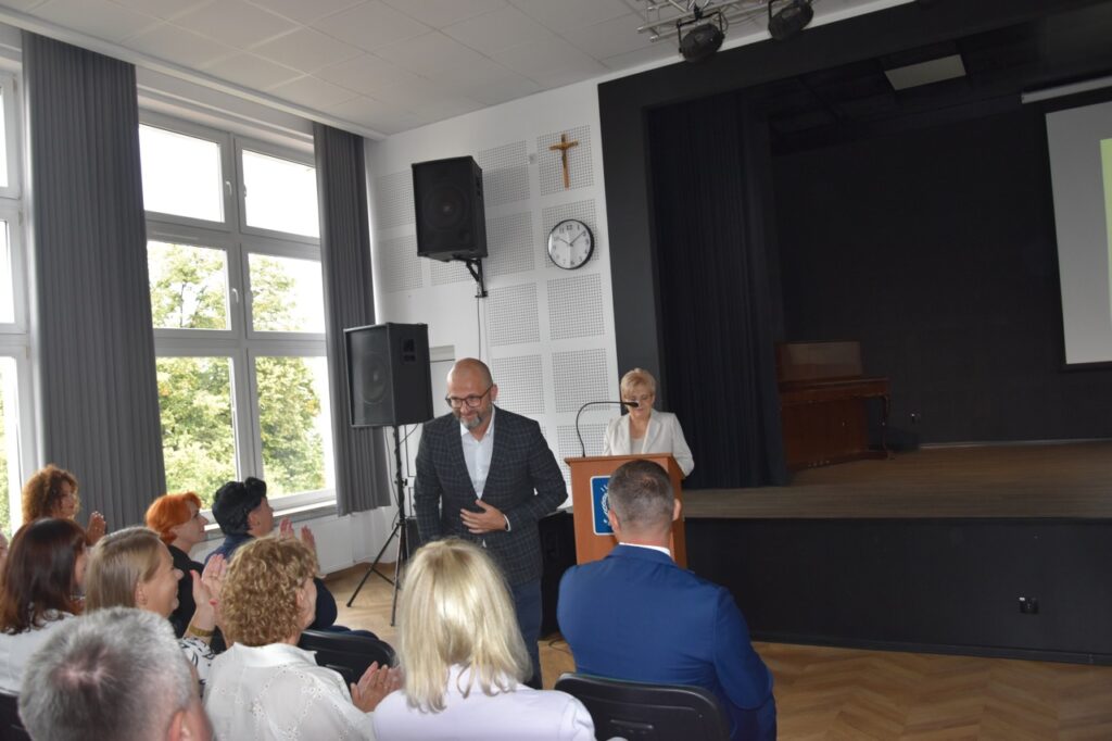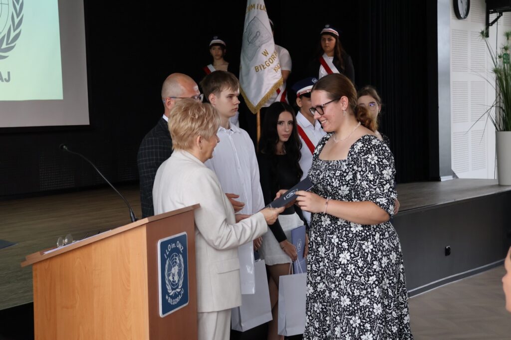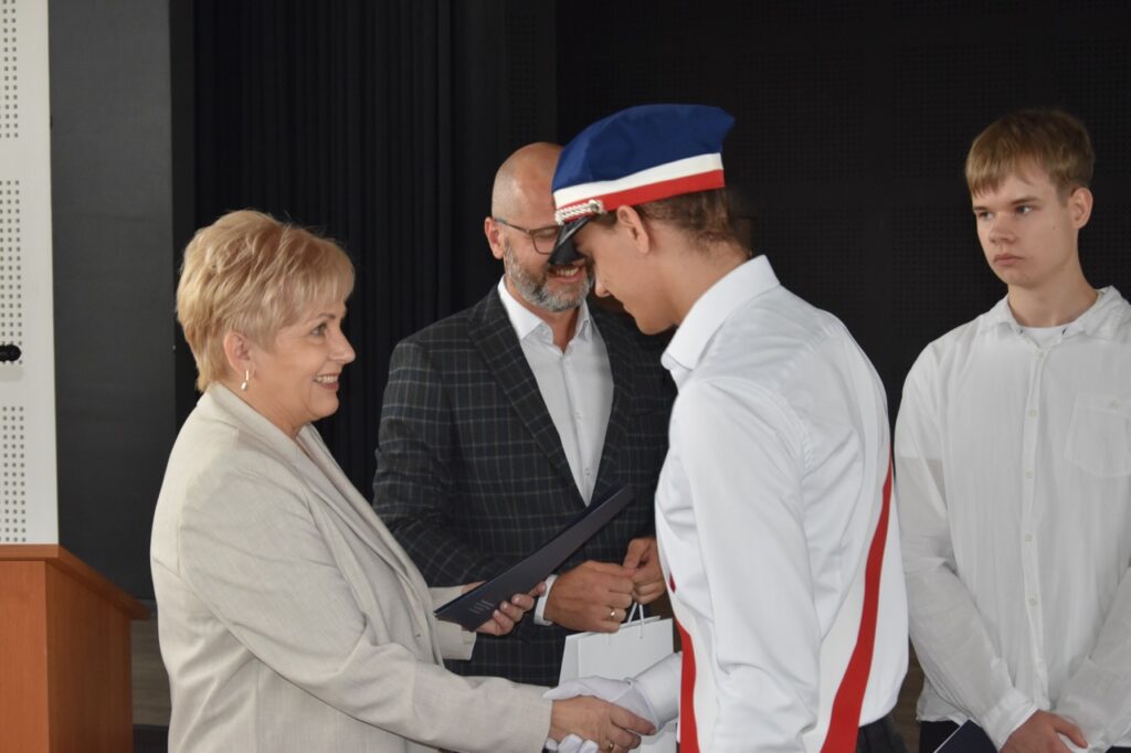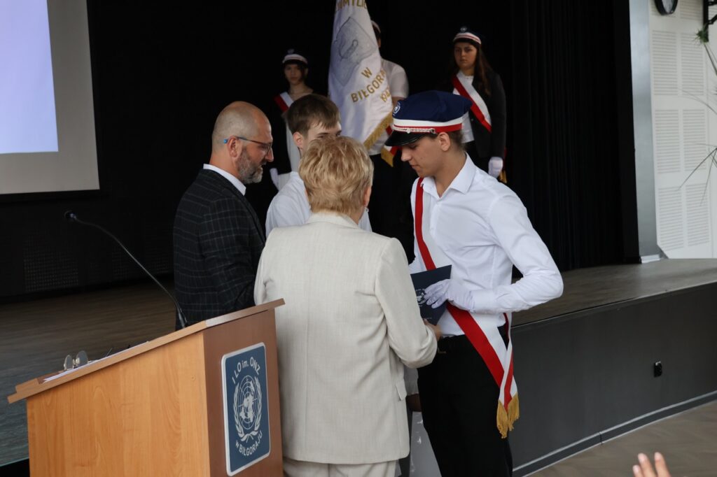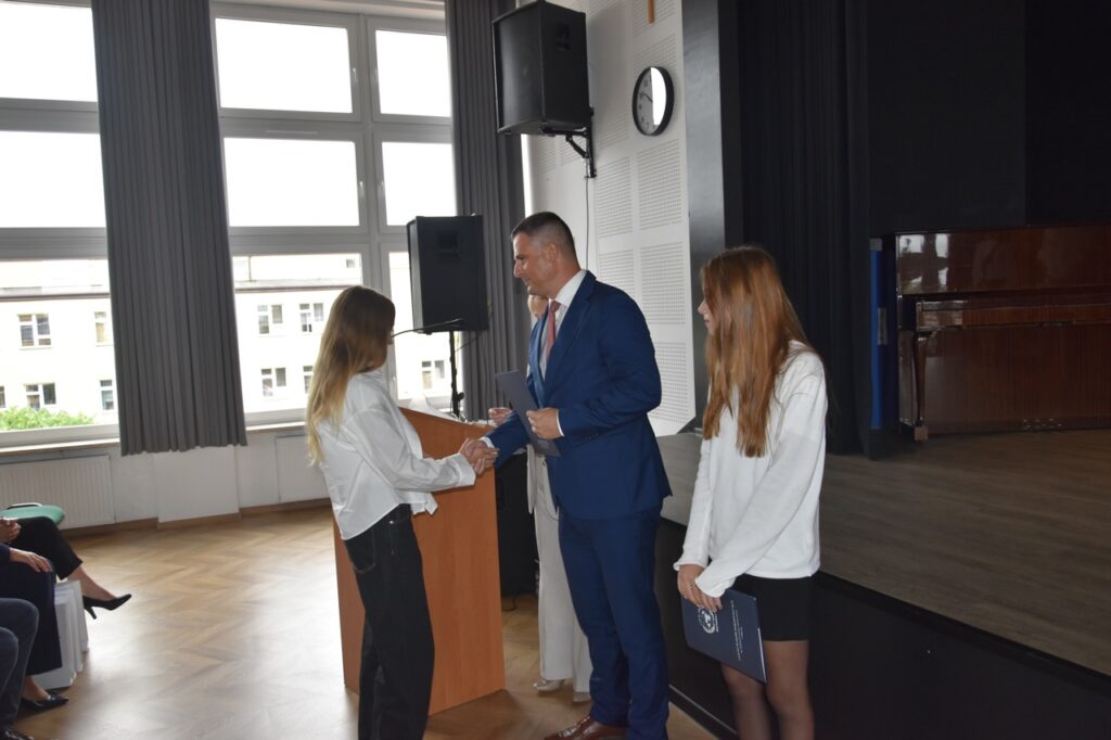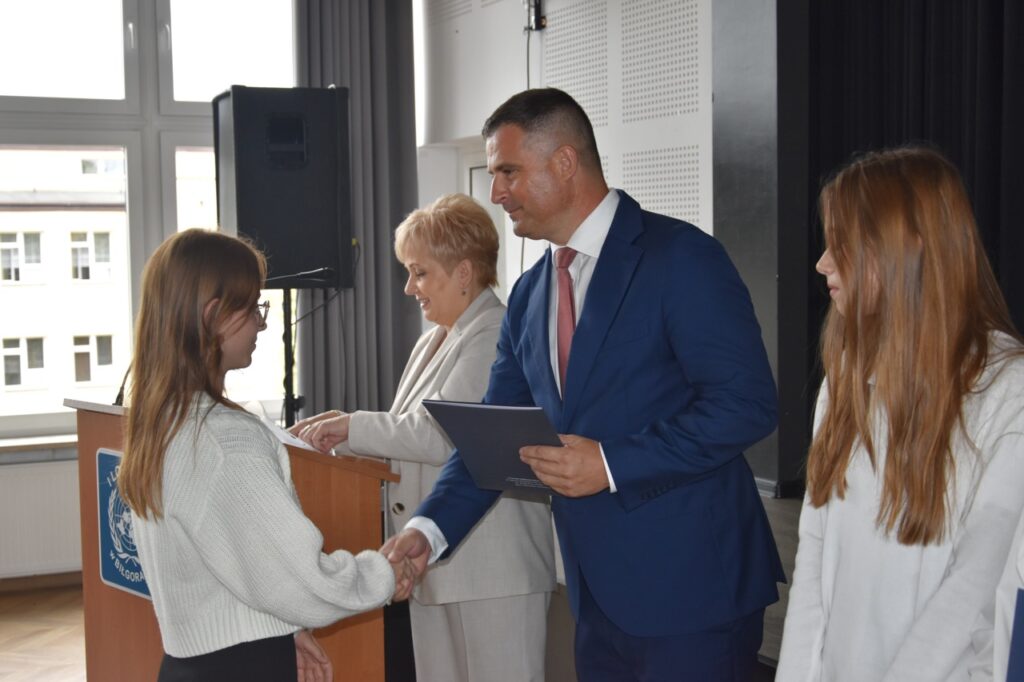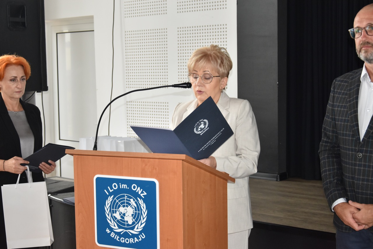 admin 7 miesięcy temu Organizacyjne , UroczystościNowy rok szkolny 2025/2026 społeczność naszego liceum 1 września zainaugurowała mszą świętą w kościele św. Jerzego i spotkaniem w auli, gdzie uczniowie zostali powitani przez dyrekcję szkoły, nauczycieli i rodziców. W uroczystości wzięli udział zaproszeni goście: etatowy członek Zarządu Powiatu Biłgorajskiego Bartłomiej Świtała, przewodniczący Rady Rodziców Jarosław Świtała oraz Katarzyna Kobel z Biura Komunikacji Medialnej, Informacji i Promocji Starostwa Powiatowego. Podczas wystąpienia Dyrektor Jolanta Rycyk szczególnie ciepłe słowa skierowała do młodzieży rozpoczynającej naukę w liceum, maturzystom z kolei życzyła jak najwyższych wyników na egzaminie maturalnym. Pani Dyrektor laureatom konkursów organizowanych przez Lubelskiego Kuratora Oświaty wręczyła stypendia ufundowane przez Uczniowski Fundusz Oświaty oraz legitymacje szkolne, a listami gratulacyjnymi uhonorowała uczniów, którzy reprezentowali szkołę w poczcie sztandarowym podczas wakacji. W rozpoczynającym się roku szkolnym życzyła wszystkim dużo zdrowia, entuzjazmu i sukcesów w podejmowanych działaniach. Do życzeń dołączyli się goście i przedstawiciele Samorządu Uczniowskiego.
