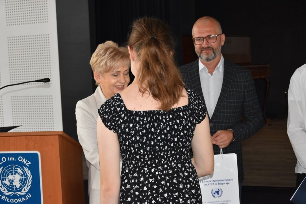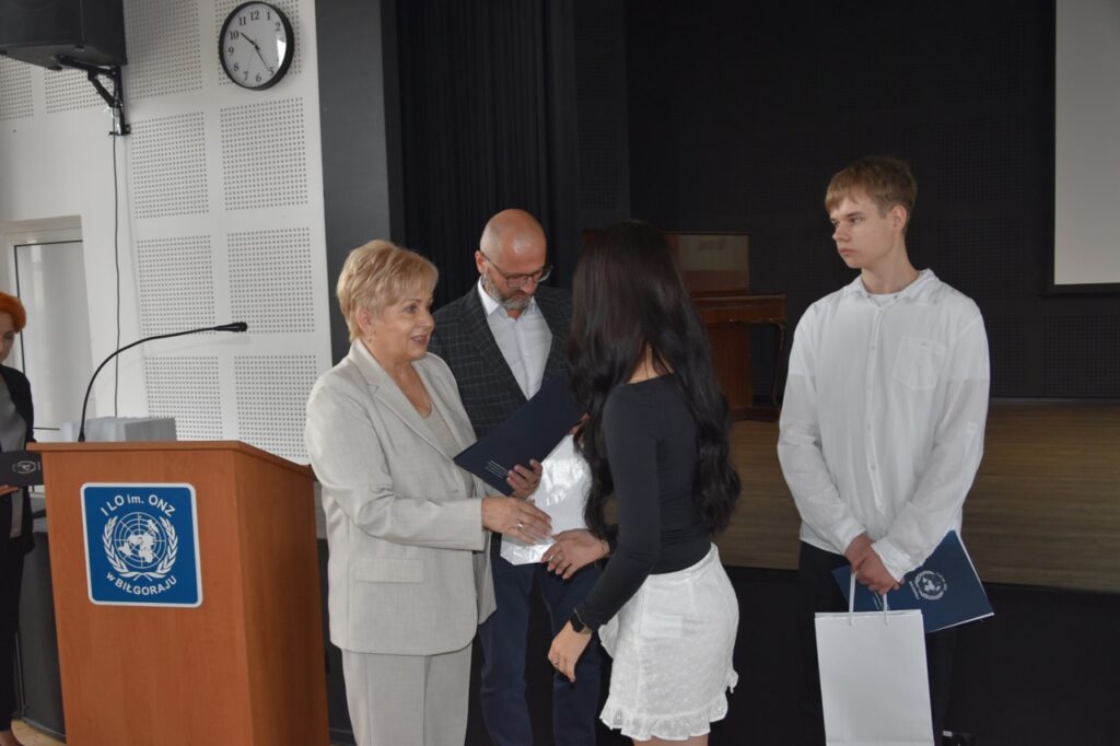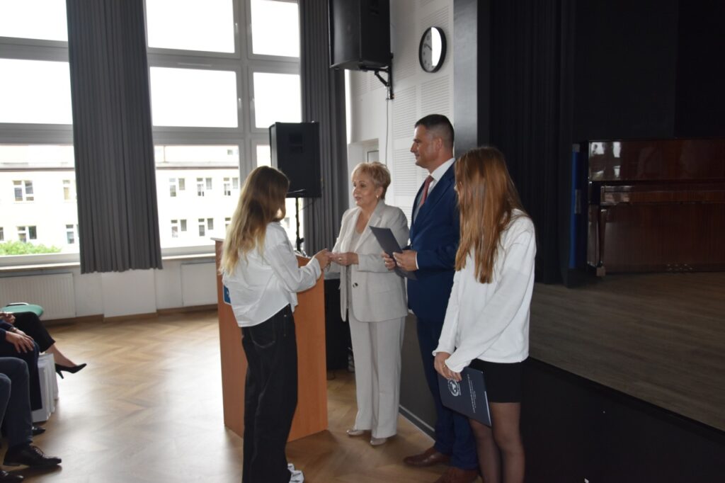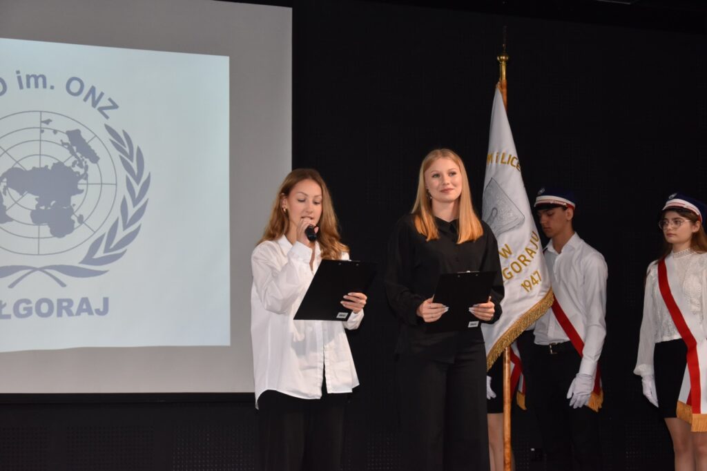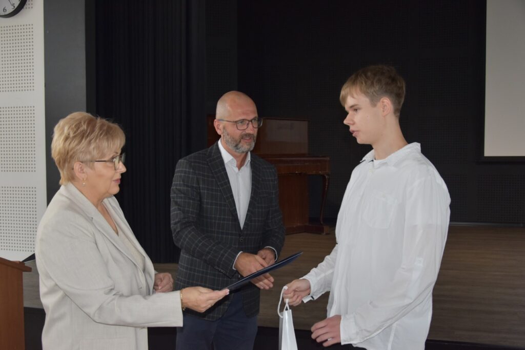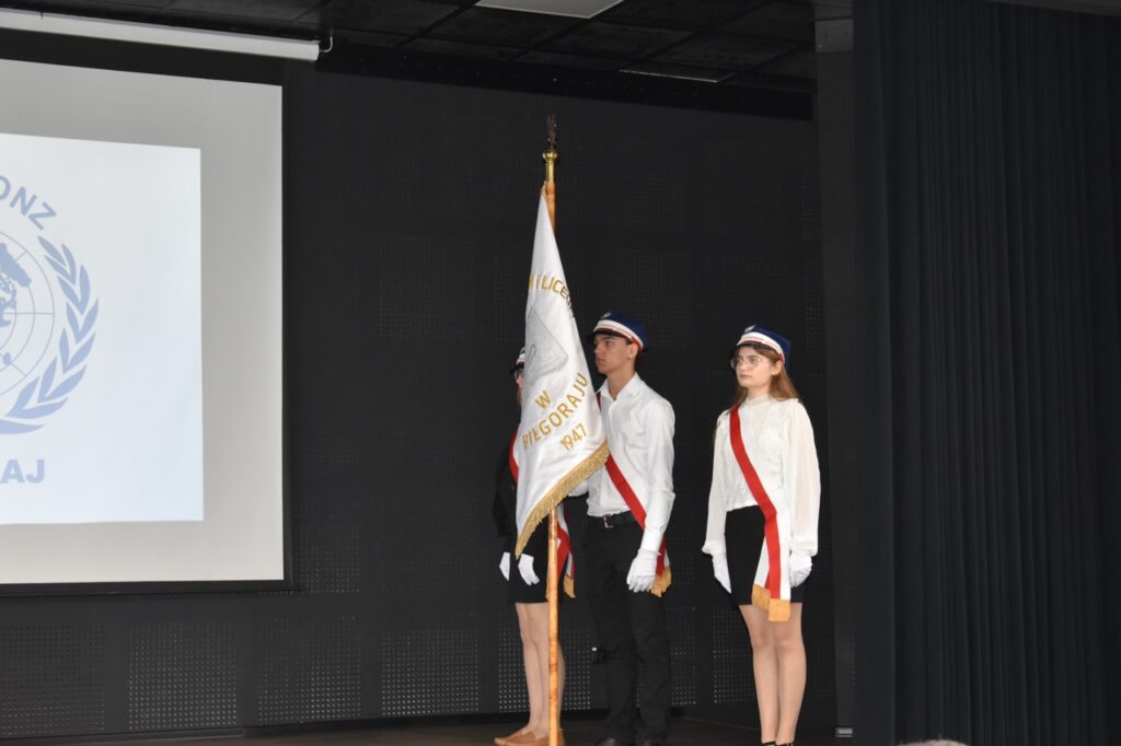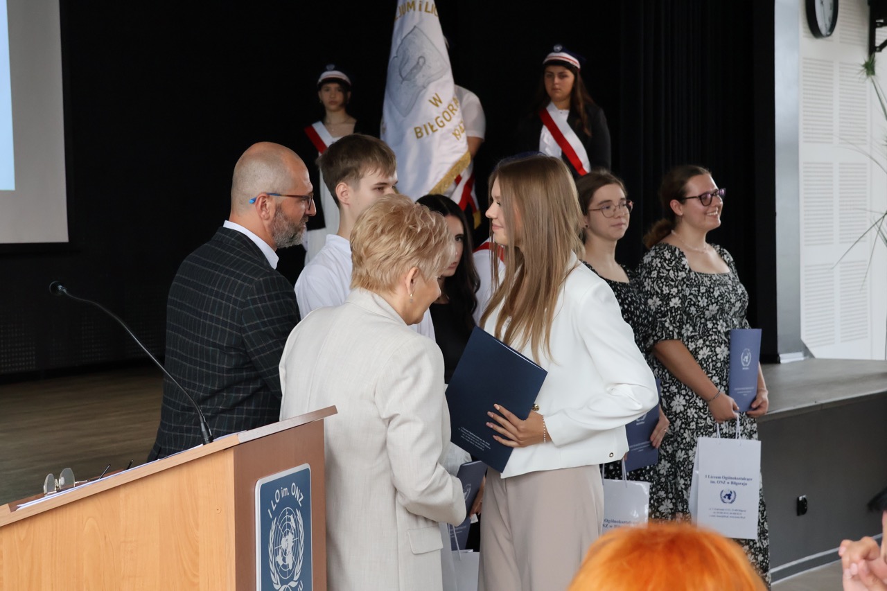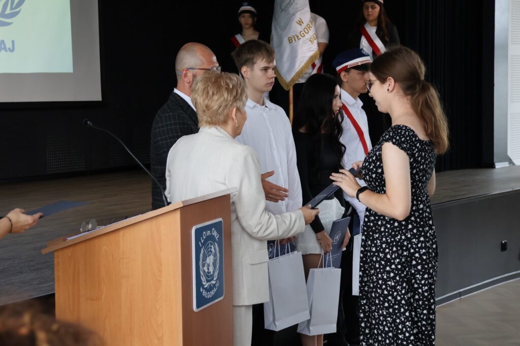 admin 7 miesięcy temu Organizacyjne , UroczystościNowy rok szkolny 2025/2026 społeczność naszego liceum 1 września zainaugurowała mszą świętą w kościele św. Jerzego i spotkaniem w auli, gdzie uczniowie zostali powitani przez dyrekcję szkoły, nauczycieli i rodziców. W uroczystości wzięli udział zaproszeni goście: etatowy członek Zarządu Powiatu Biłgorajskiego Bartłomiej Świtała, przewodniczący Rady Rodziców Jarosław Świtała oraz Katarzyna Kobel z Biura Komunikacji Medialnej, Informacji i Promocji Starostwa Powiatowego. Podczas wystąpienia Dyrektor Jolanta Rycyk szczególnie ciepłe słowa skierowała do młodzieży rozpoczynającej naukę w liceum, maturzystom z kolei życzyła jak najwyższych wyników na egzaminie maturalnym. Pani Dyrektor laureatom konkursów organizowanych przez Lubelskiego Kuratora Oświaty wręczyła stypendia ufundowane przez Uczniowski Fundusz Oświaty oraz legitymacje szkolne, a listami gratulacyjnymi uhonorowała uczniów, którzy reprezentowali szkołę w poczcie sztandarowym podczas wakacji. W rozpoczynającym się roku szkolnym życzyła wszystkim dużo zdrowia, entuzjazmu i sukcesów w podejmowanych działaniach. Do życzeń dołączyli się goście i przedstawiciele Samorządu Uczniowskiego.