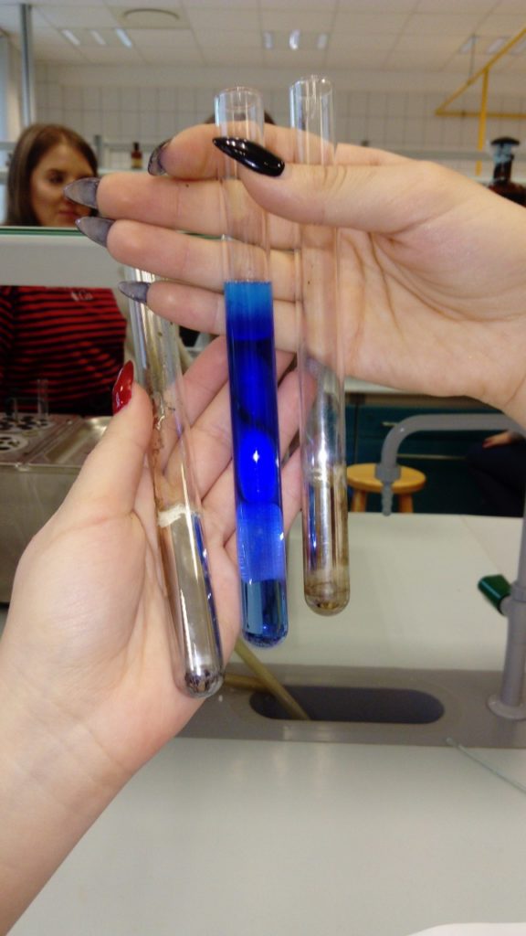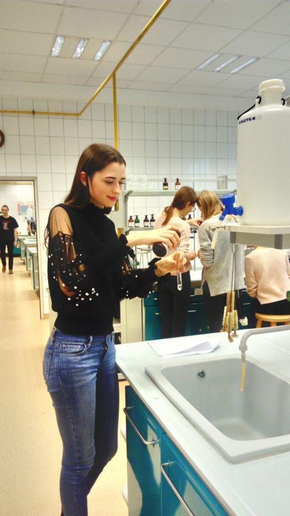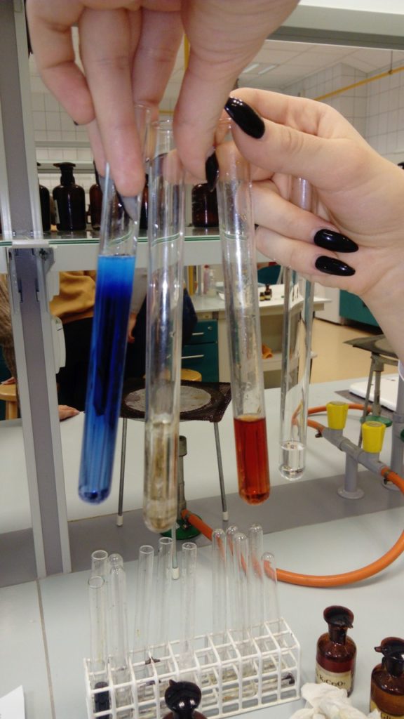 Zajęcia dedykowane uczniom klas trzecich nt. „Grupy funkcyjne” obejmowały podstawowe reakcje z zakresu chemii organicznej. Uczniowie samodzielnie wykonywali reakcje charakterystyczne dla grup funkcyjnych (hydroksylowej, karbonylowej, karboksylowej), poznając przy tym kolejne grupy związków organicznych: alkohole monowodorotlenowe, wielowodorotlenowe, fenole, aldehydy, ketony, estry, aminy, aminokwasy oraz węglowodany. Uczniowie byli bardzo zadowoleni z zajęć, a zdobyte umiejętności wykorzystają na egzaminie maturalnym.