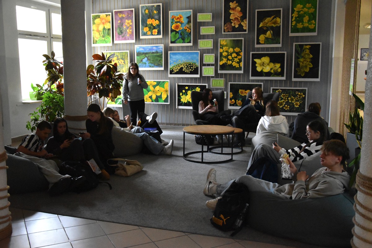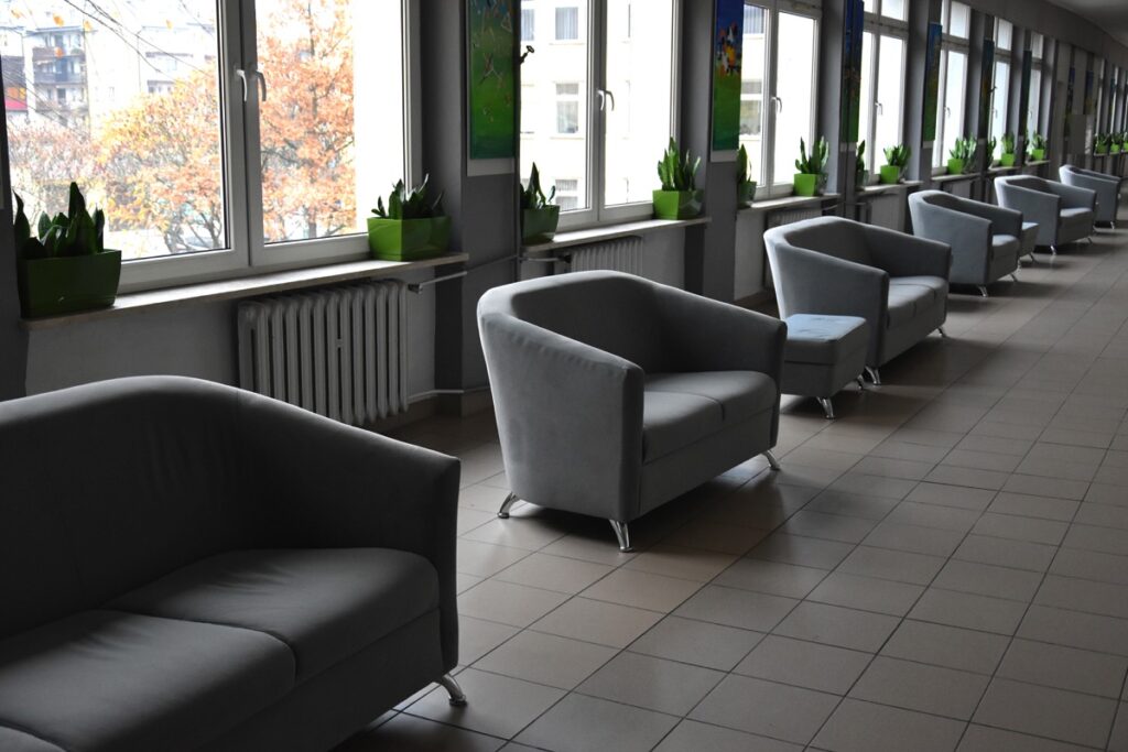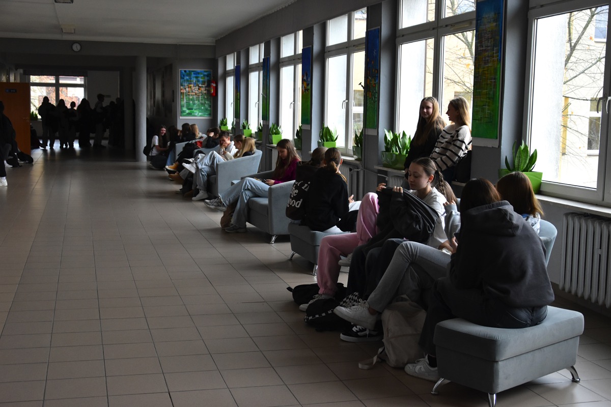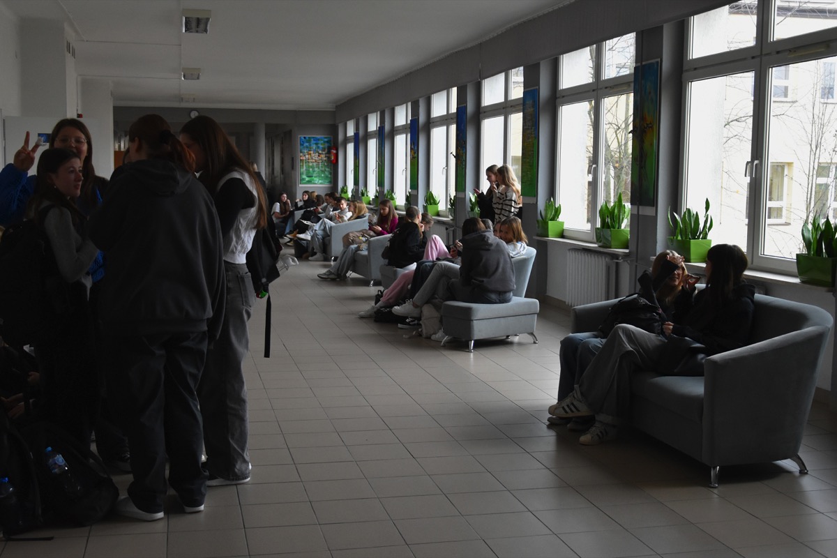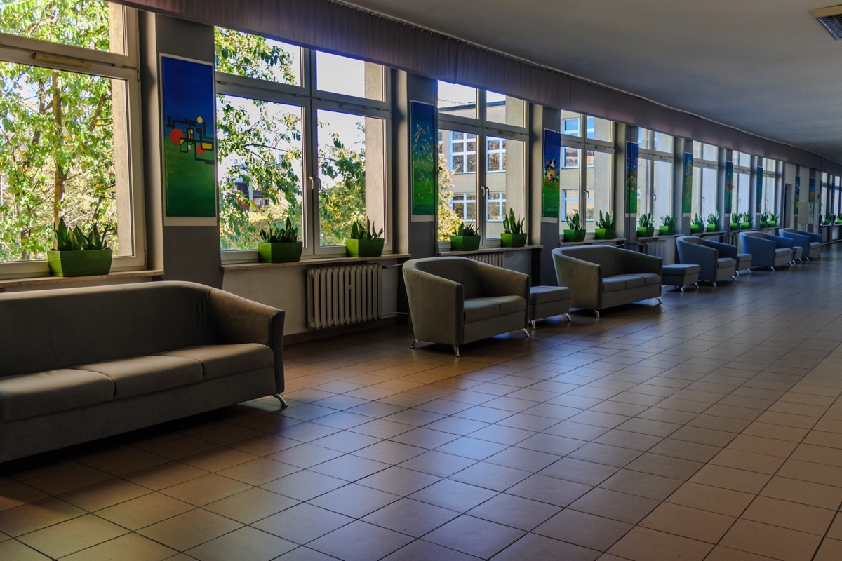 Nowe miejsce dla uczniów przeznaczone do odpoczynku utworzone zostało także na głównym korytarzu, gdzie ściany zdobią przyjemne dla oka dekoracje – kolejne prace malarskie uczniów. To duże, niebiesko–zielone abstrakcyjne i oryginalne kompozycje, które tworzą jedną całość i ożywiają przestrzeń. Na ich tle obecnie można wygodnie usiąść na zakupionych szarych kanapach (dwu- i trzyosobowych) oraz na rozmieszczonych pomiędzy nimi pufach.