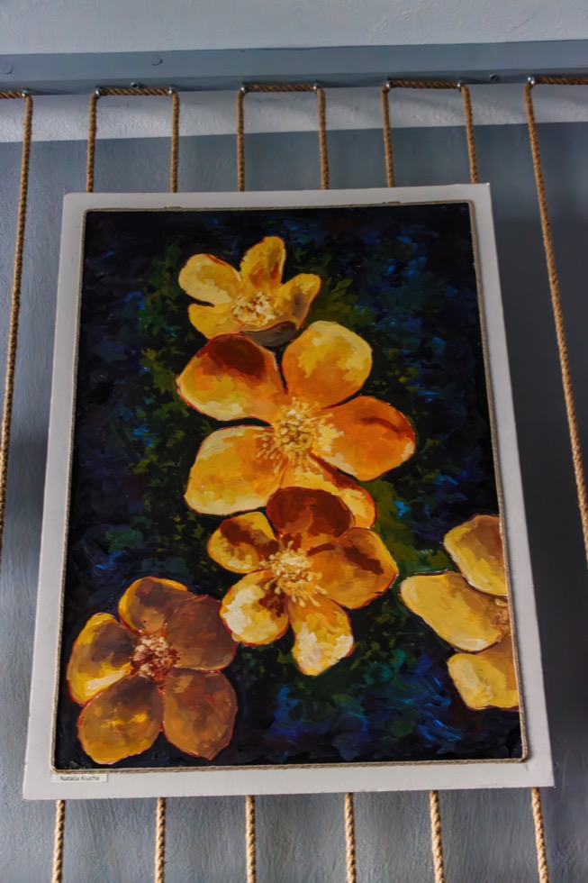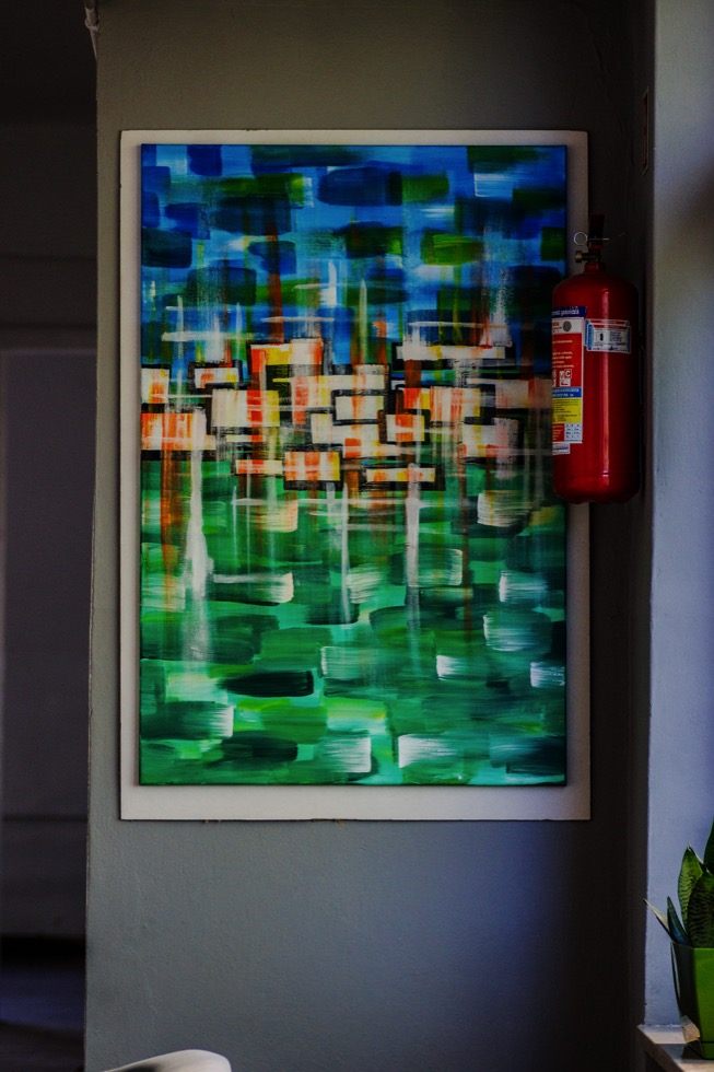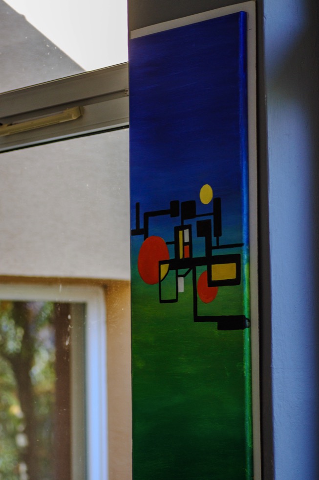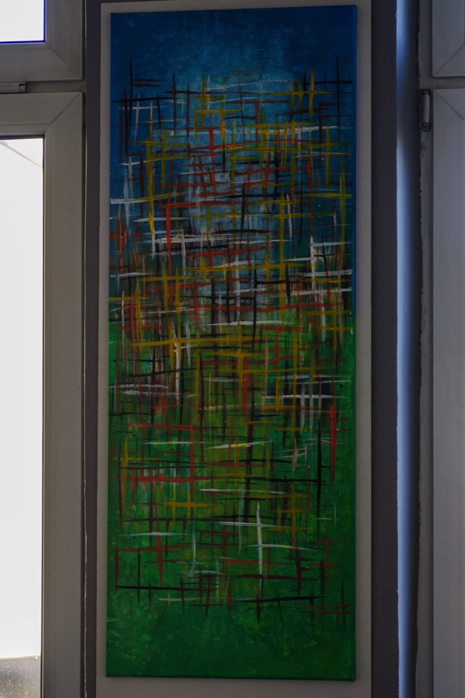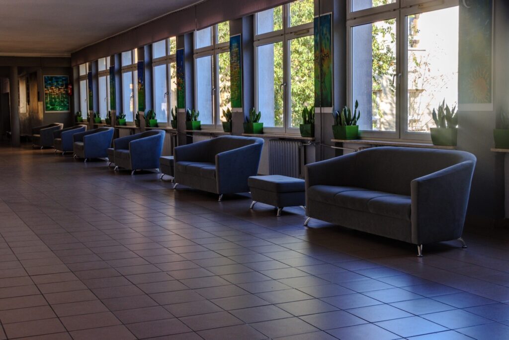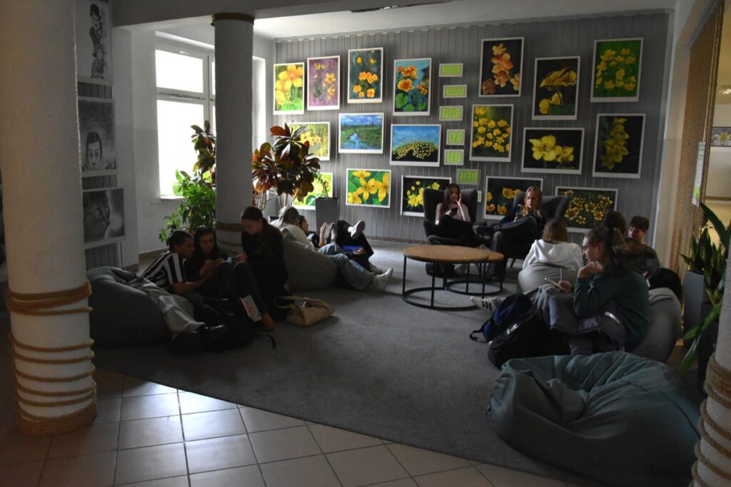 Nowe miejsce dla uczniów przeznaczone do odpoczynku utworzone zostało także na głównym korytarzu, gdzie ściany zdobią przyjemne dla oka dekoracje – kolejne prace malarskie uczniów. To duże, niebiesko–zielone abstrakcyjne i oryginalne kompozycje, które tworzą jedną całość i ożywiają przestrzeń. Na ich tle obecnie można wygodnie usiąść na zakupionych szarych kanapach (dwu- i trzyosobowych) oraz na rozmieszczonych pomiędzy nimi pufach.