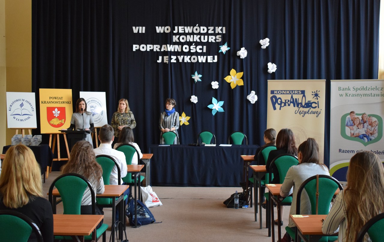 admin 7 lat temu Konkursy , Organizacyjne , OsiągnięciaW dniu 4 kwietnia odbył się w Krasnymstawie VII Wojewódzki Konkurs Poprawności Językowej „Mówię i piszę po polsku”. W finale rozgrywek polonistycznych naszą szkołę reprezentowały: Agata Dudek z klasy I G oraz Gabriela Olszowy z klasy II H. Podobnie jak w etapie szkolnym dziewczęta pisały dyktando i rozwiązywały test poprawności językowej. Zadania konkursowe zostały przygotowane przez pracowników naukowych z Katedry Języka Polskiego Katolickiego Uniwersytetu Lubelskiego Jana Pawła II.