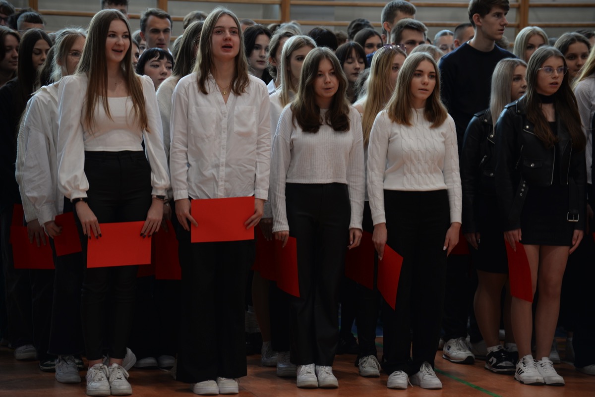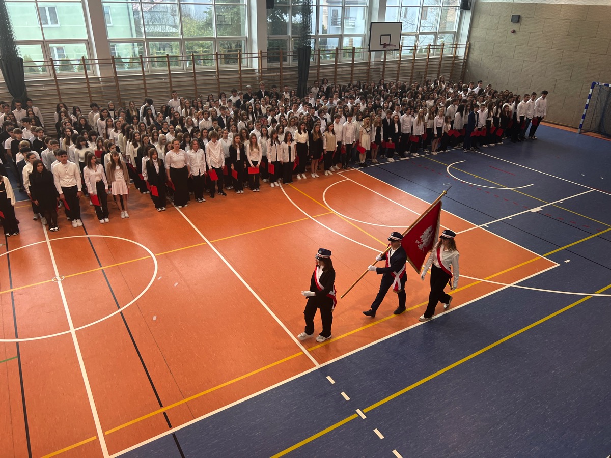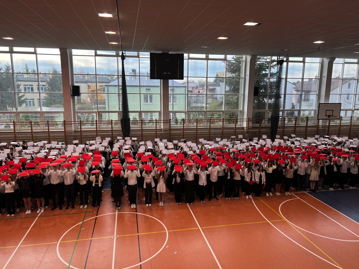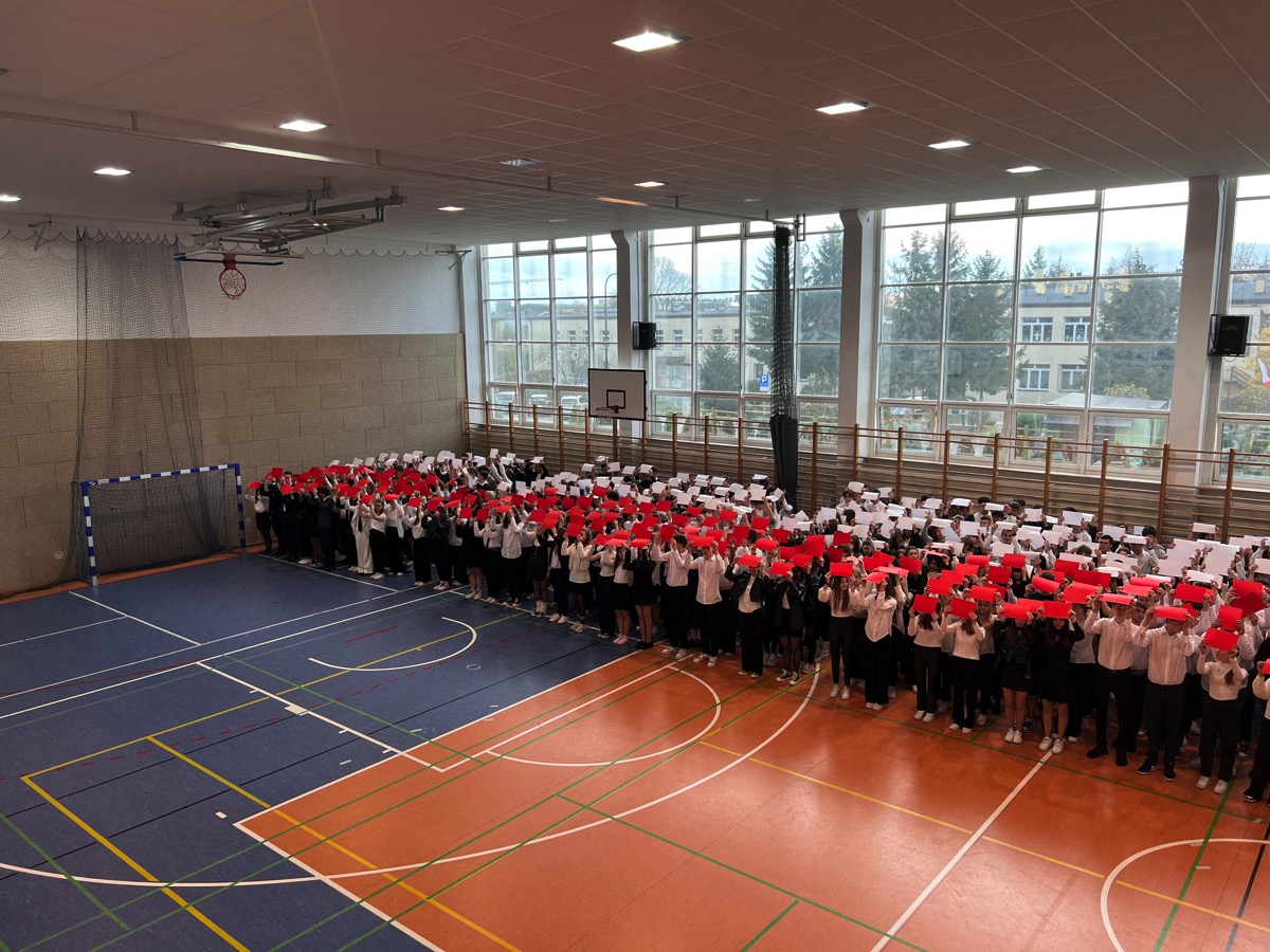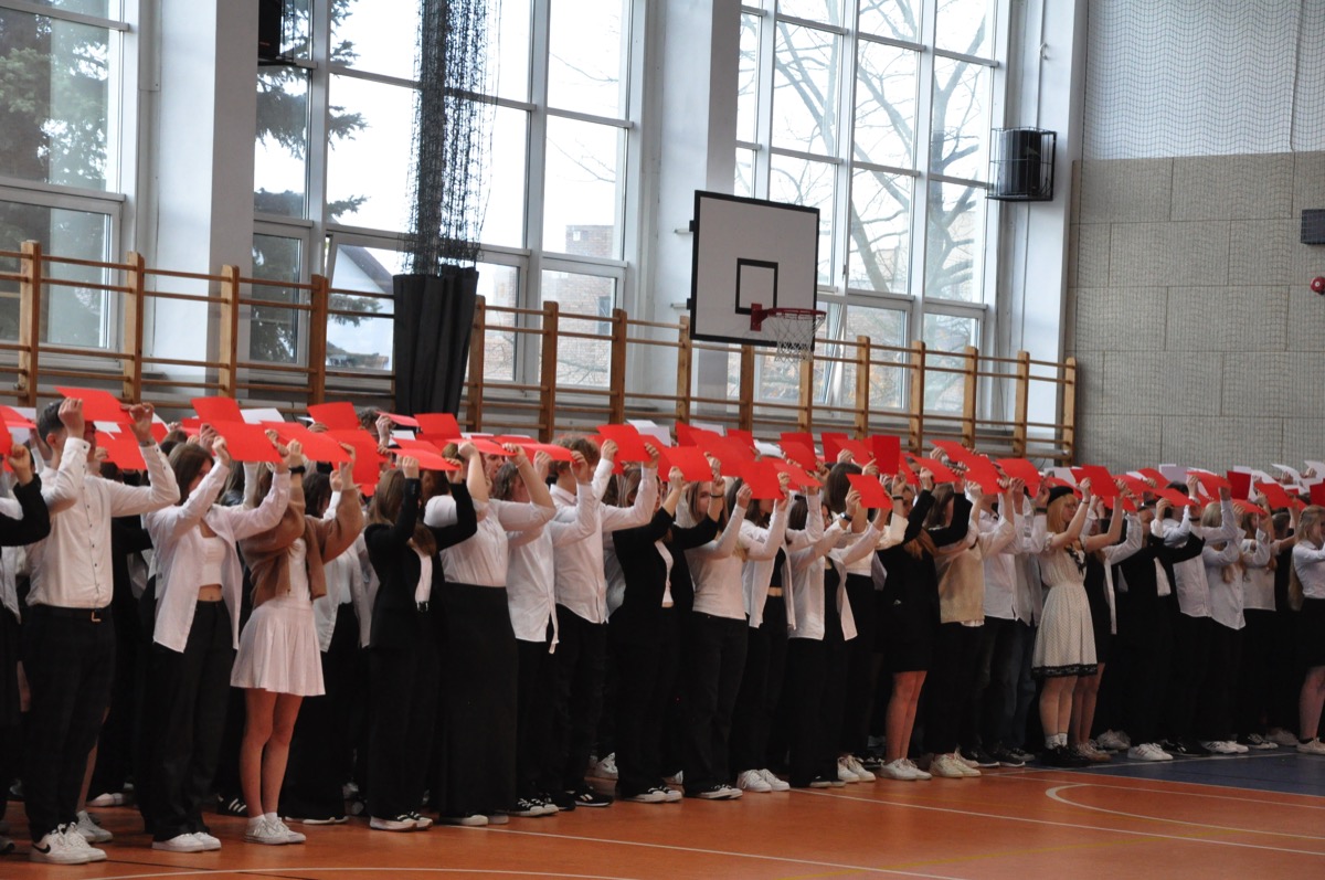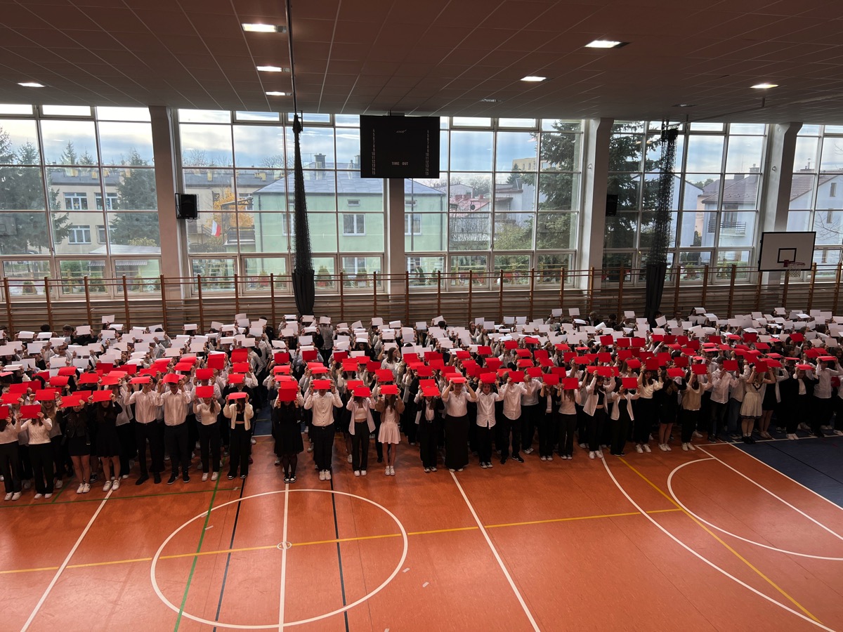 admin 2 lata temu Organizacyjne , UroczystościObchody 105. rocznicy odzyskania niepodległości w naszym liceum rozpoczęły się w przeddzień Narodowego Święta Niepodległości. 10 listopada 2023 roku społeczność szkolna o godz. 11.11 w hali gimnastycznej uroczyście odśpiewała hymn państwowy, po raz kolejny przyłączając się do ogólnopolskiej akcji organizowanej przez Ministerstwo Edukacji Narodowej „Szkoła do hymnu”. „Mazurek Dąbrowskiego”, który pięknie wybrzmiał w murach szkoły, a także biało-czerwona flaga utworzona przez uczniów wprowadziły nas w nastrój święta patriotycznego i uświadomiły, jak ważne w dziejach narodu polskiego było odzyskanie niepodległości.