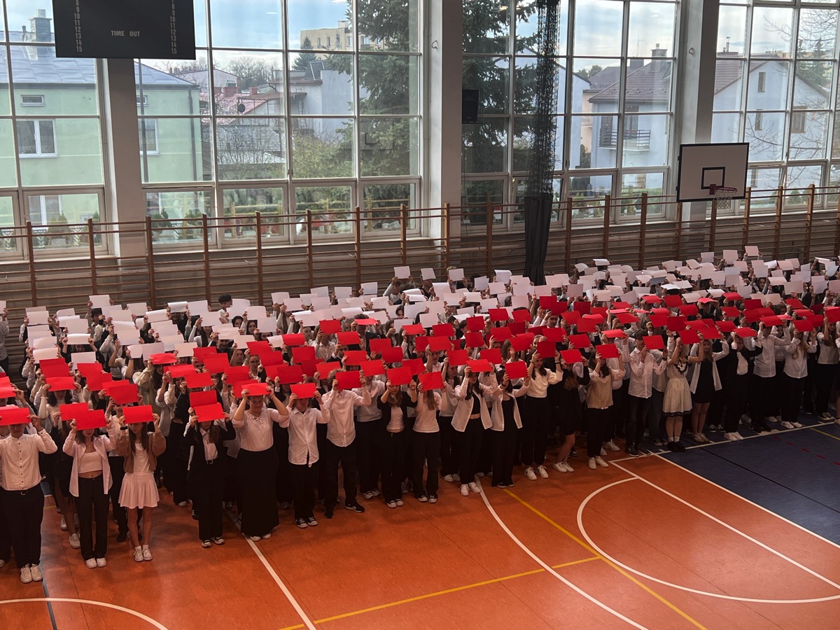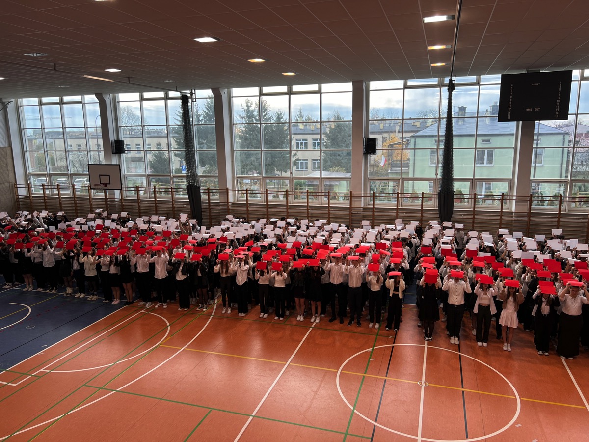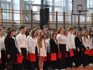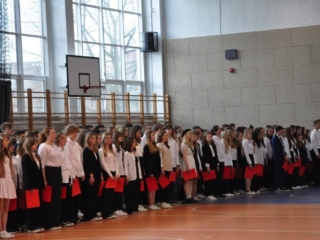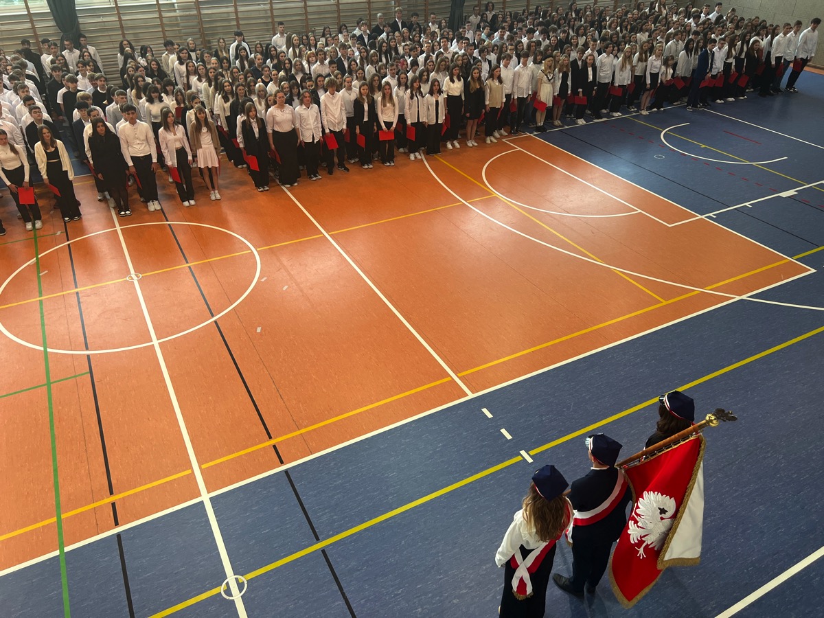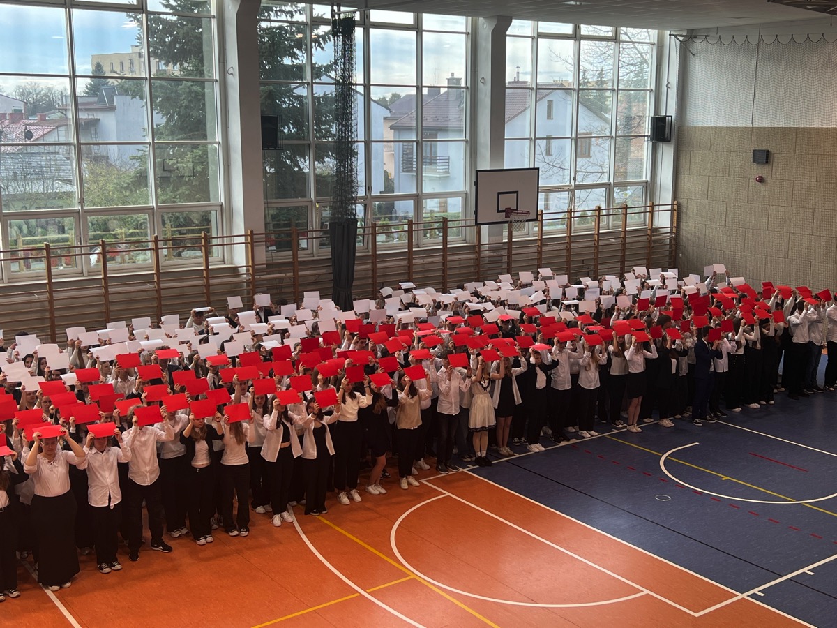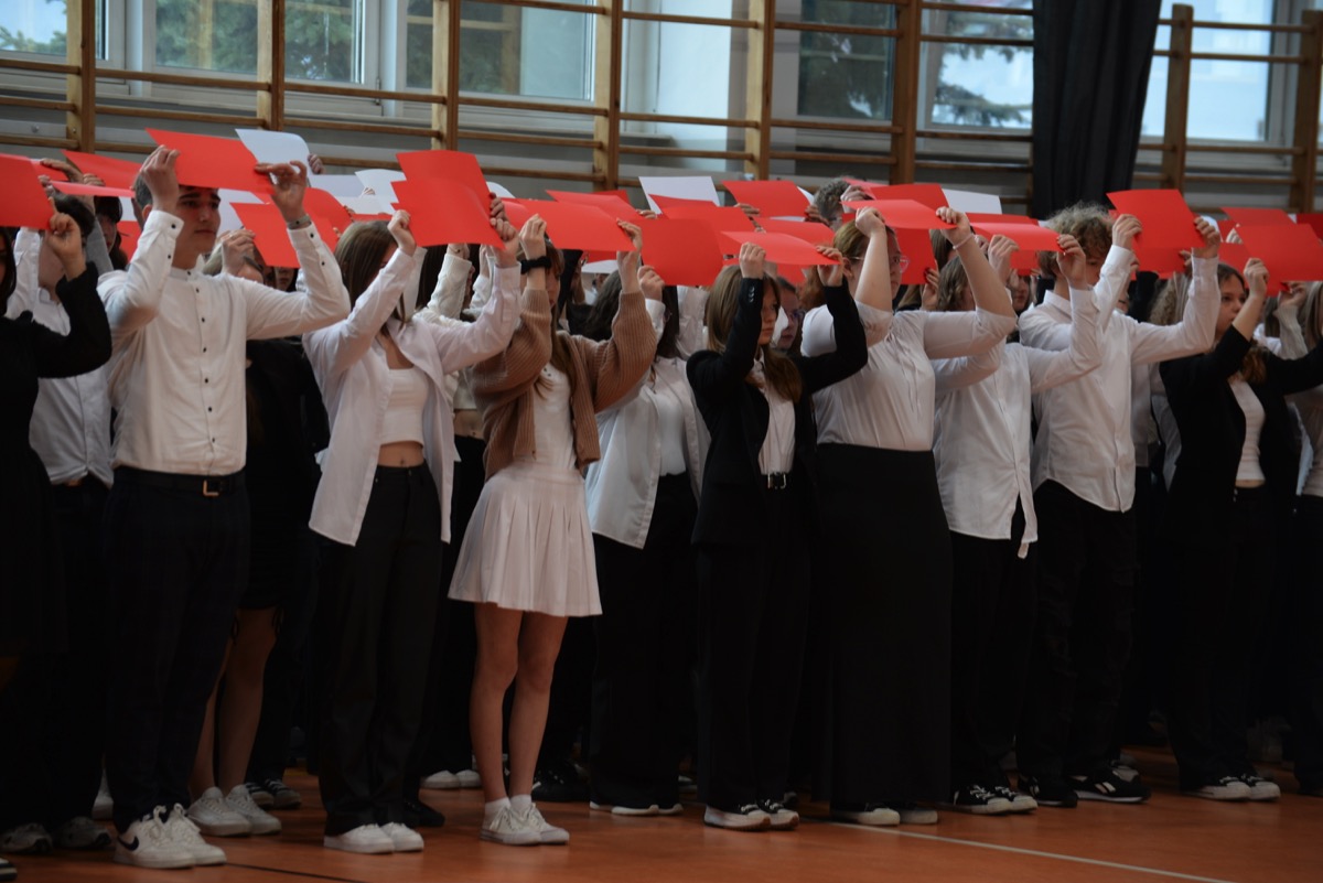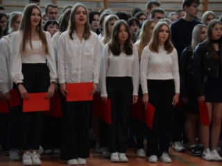 admin 2 lata temu Organizacyjne , UroczystościObchody 105. rocznicy odzyskania niepodległości w naszym liceum rozpoczęły się w przeddzień Narodowego Święta Niepodległości. 10 listopada 2023 roku społeczność szkolna o godz. 11.11 w hali gimnastycznej uroczyście odśpiewała hymn państwowy, po raz kolejny przyłączając się do ogólnopolskiej akcji organizowanej przez Ministerstwo Edukacji Narodowej „Szkoła do hymnu”. „Mazurek Dąbrowskiego”, który pięknie wybrzmiał w murach szkoły, a także biało-czerwona flaga utworzona przez uczniów wprowadziły nas w nastrój święta patriotycznego i uświadomiły, jak ważne w dziejach narodu polskiego było odzyskanie niepodległości.