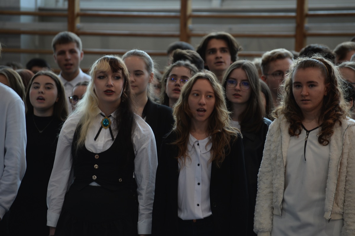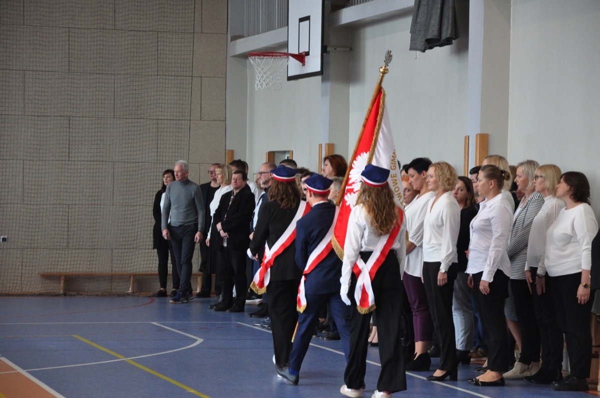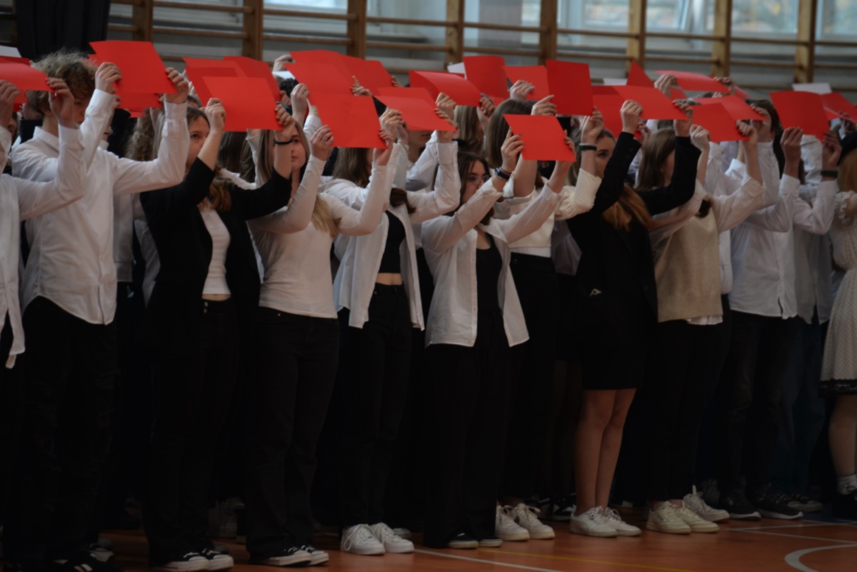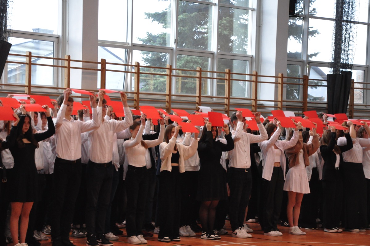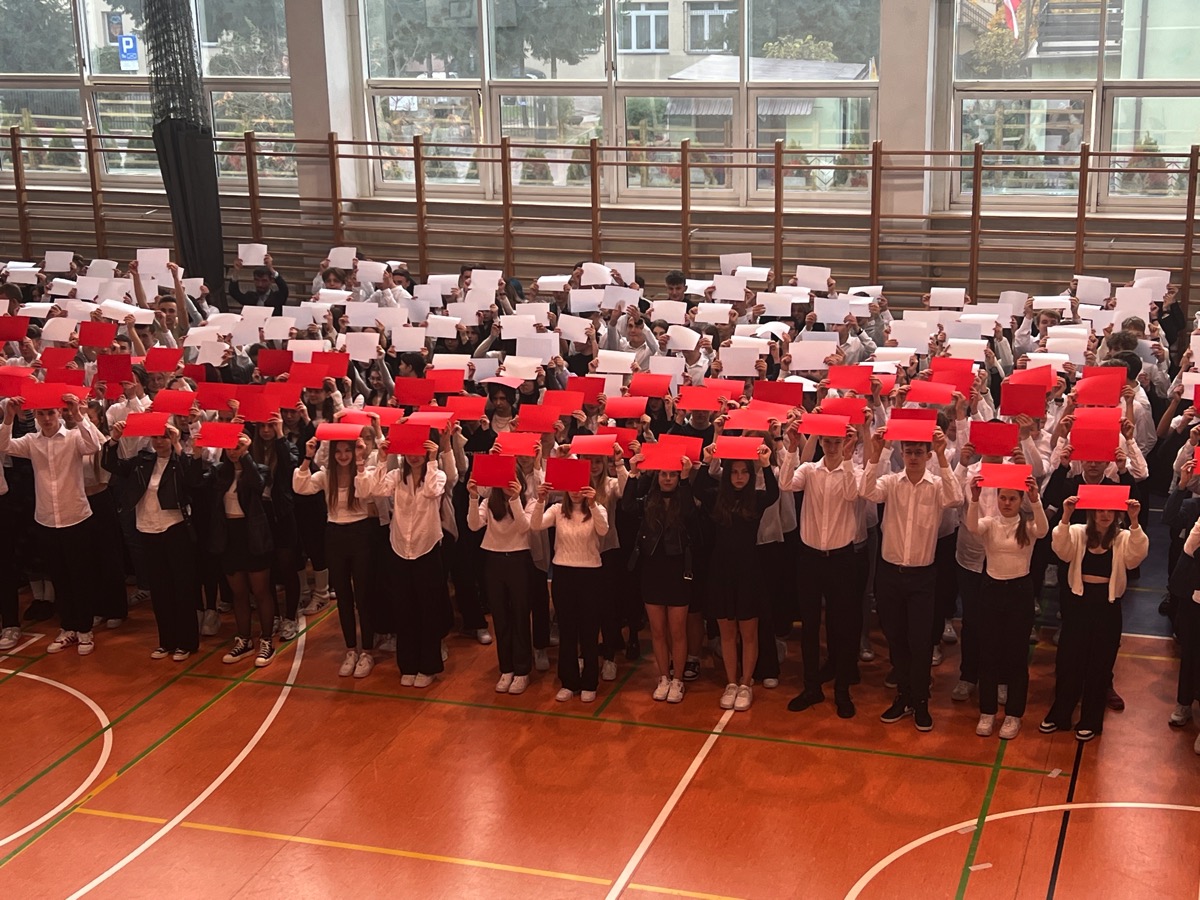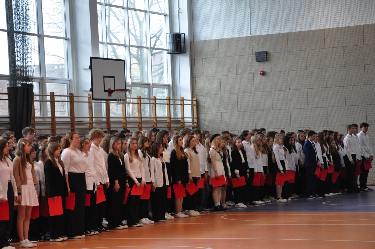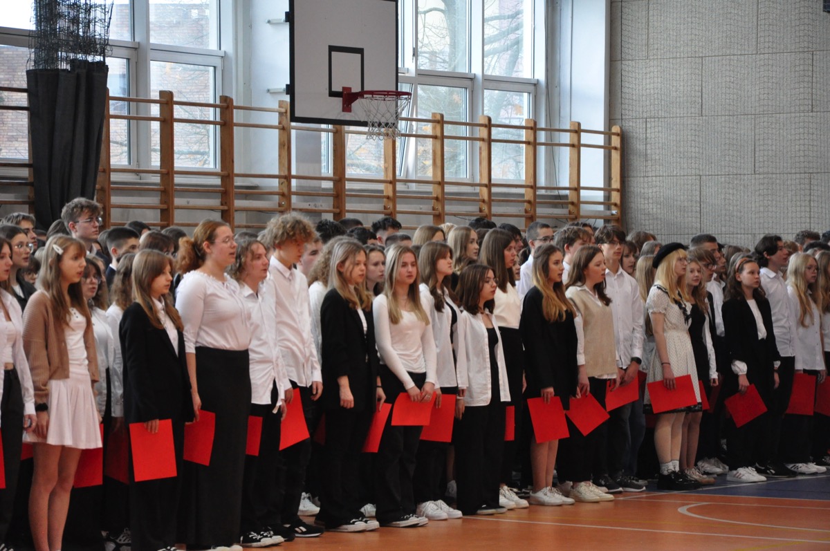 admin 2 lata temu Organizacyjne , UroczystościObchody 105. rocznicy odzyskania niepodległości w naszym liceum rozpoczęły się w przeddzień Narodowego Święta Niepodległości. 10 listopada 2023 roku społeczność szkolna o godz. 11.11 w hali gimnastycznej uroczyście odśpiewała hymn państwowy, po raz kolejny przyłączając się do ogólnopolskiej akcji organizowanej przez Ministerstwo Edukacji Narodowej „Szkoła do hymnu”. „Mazurek Dąbrowskiego”, który pięknie wybrzmiał w murach szkoły, a także biało-czerwona flaga utworzona przez uczniów wprowadziły nas w nastrój święta patriotycznego i uświadomiły, jak ważne w dziejach narodu polskiego było odzyskanie niepodległości.
