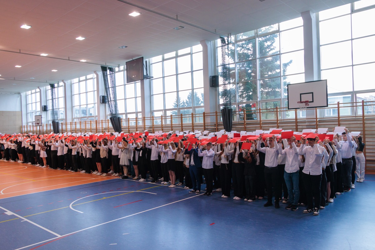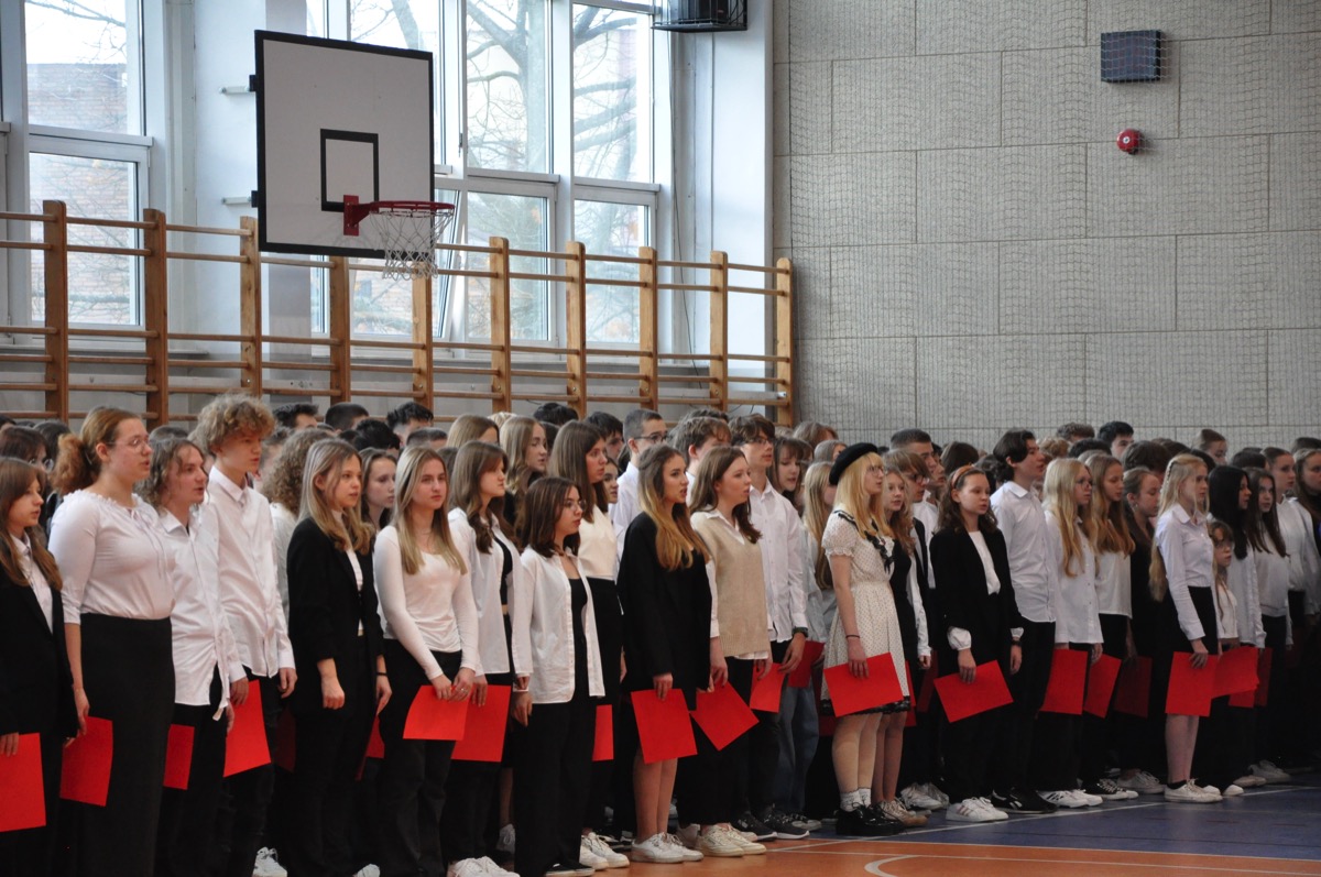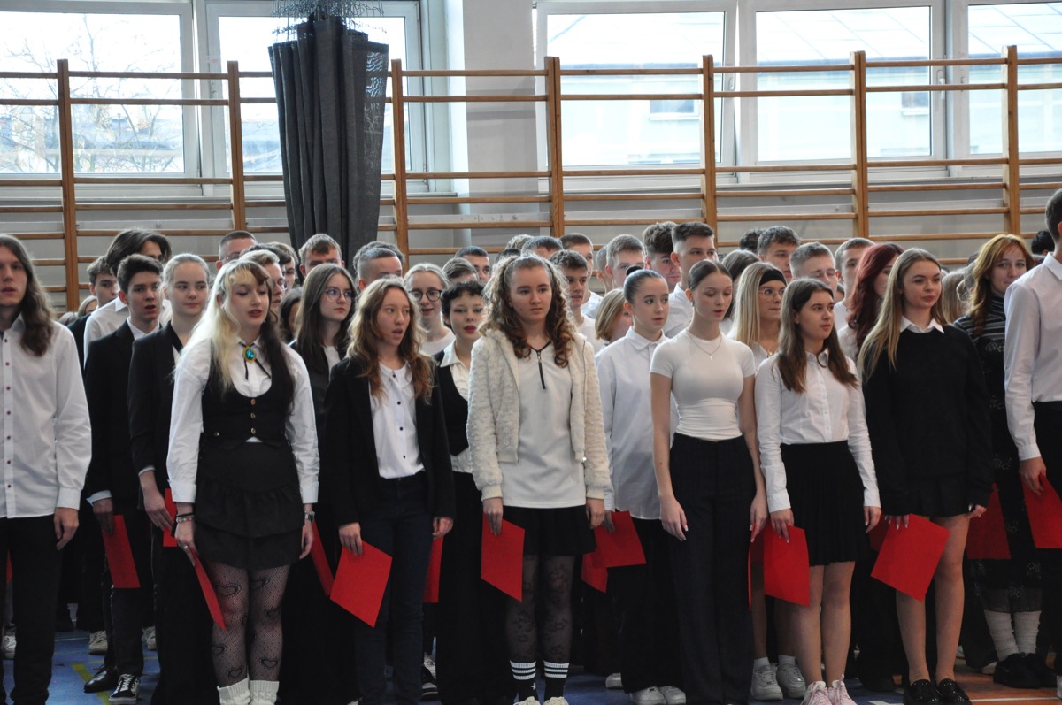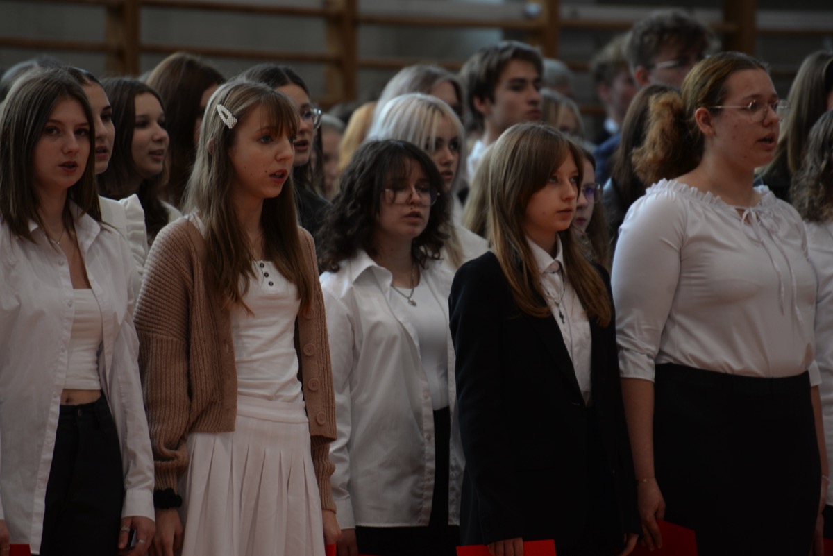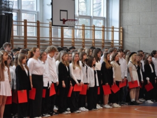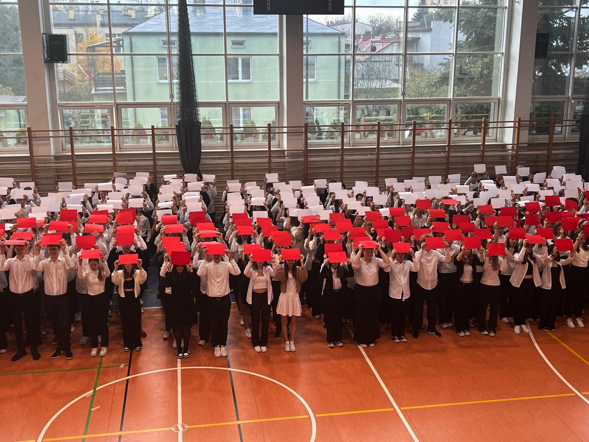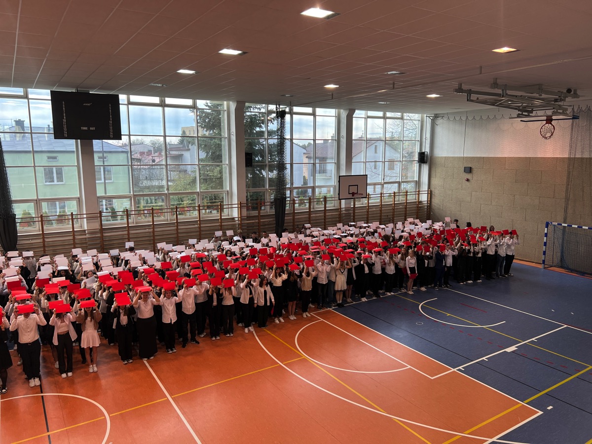 admin 2 lata temu Organizacyjne , UroczystościObchody 105. rocznicy odzyskania niepodległości w naszym liceum rozpoczęły się w przeddzień Narodowego Święta Niepodległości. 10 listopada 2023 roku społeczność szkolna o godz. 11.11 w hali gimnastycznej uroczyście odśpiewała hymn państwowy, po raz kolejny przyłączając się do ogólnopolskiej akcji organizowanej przez Ministerstwo Edukacji Narodowej „Szkoła do hymnu”. „Mazurek Dąbrowskiego”, który pięknie wybrzmiał w murach szkoły, a także biało-czerwona flaga utworzona przez uczniów wprowadziły nas w nastrój święta patriotycznego i uświadomiły, jak ważne w dziejach narodu polskiego było odzyskanie niepodległości.