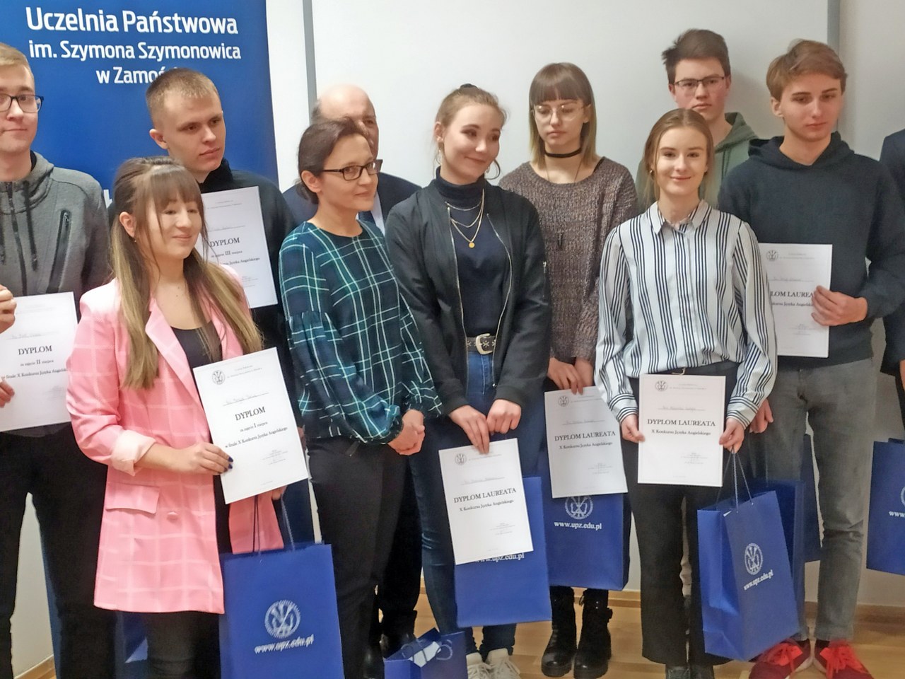 admin 6 lat temu Bez kategorii , Konkursy , Organizacyjne , Osiągnięcia6 lutego 2020 r. w Zamościu odbył się finał X Konkursu Języka Angielskiego, którego organizatorem była Państwowa Uczelnia im. Szymona Szymonowica w Zamościu. W finałowym starciu spotkali się najlepsi młodzi angliści ze szkół średnich naszego regionu m. in. z Zamościa, Hrubieszowa, Tomaszowa Lubelskiego i Biłgoraja. Wielkie emocje i skupienie towarzyszyły uczestnikom, gdyż zadanie, które stanęło przed nimi, na pewno nie należało do łatwych. Finaliści musieli wykazać się zaawansowanymi umiejętnościami rozumienia czytanego tekstu oraz stosowania struktur leksykalno-gramatycznych.