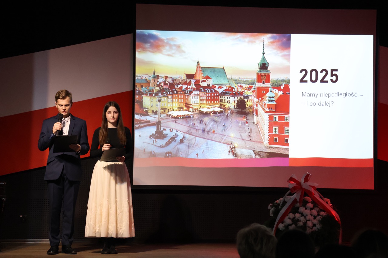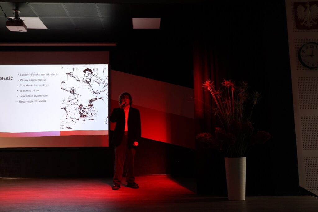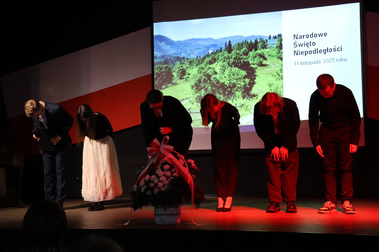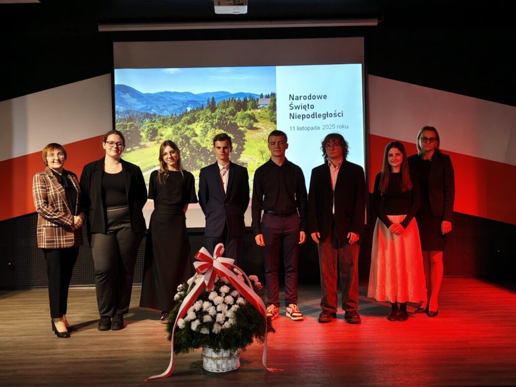 admin 5 miesięcy temu Organizacyjne , Uroczystości12 listopada 2025 roku w pięknie udekorowanej biało-czerwonymi barwami auli społeczność szkoły zgromadziła się, aby kontynuować obchody Narodowego Święta Niepodległości, zapoczątkowanego wspólnym śpiewaniem „Mazurka Dąbrowskiego”. Akademia poświęcona była zaangażowaniu narodu polskiego w walkę o odzyskanie suwerenności. Młodzież podkreślała, że w tym najtrudniejszym dla naszej ojczyzny czasie ważna była nie tylko walka z bronią w ręku, ale też m.in. codzienny wysiłek matek i ojców, by dzieci mówiły po polsku, zaangażowanie nauczycieli, aby młodzież wbrew zakazom czytała polskie książki czy wkład artystów w utrwalanie dawnej świetności Polski. Często pomijaną i nieoczywistą walką o niepodległość był także wysiłek polskich chłopów, przedsiębiorców oraz wszystkich, którzy dążyli do wolniej ojczyzny. Artyści skierowali do młodzieży apel, aby w czasie pokoju każdy na miarę swoich możliwości troszczył się o Polskę, szanował symbole narodowe, kultywował tradycje i zwyczaje, dbał o środowisko, pamiętał o przodkach, uczył się i pracował.
