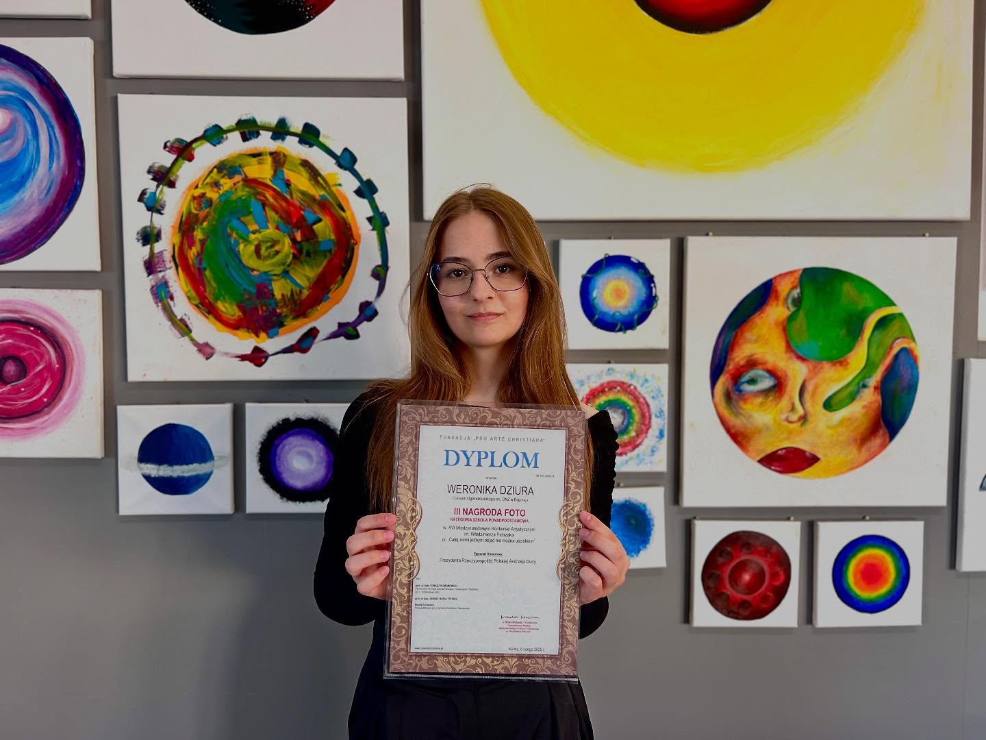 Weronika Dziura z klasy I E otrzymała tytuł laureata XVI Międzynarodowego Konkursu Artystycznego im. Włodzimierza Pietrzaka pt. „Całej ziemi jednym objąć nie można uściskiem” w kategorii –„Fotografia”. Organizatorem konkursu była Fundacja „Pro Arte Christiana” z siedzibą w Kaliszu.​