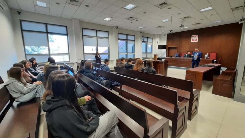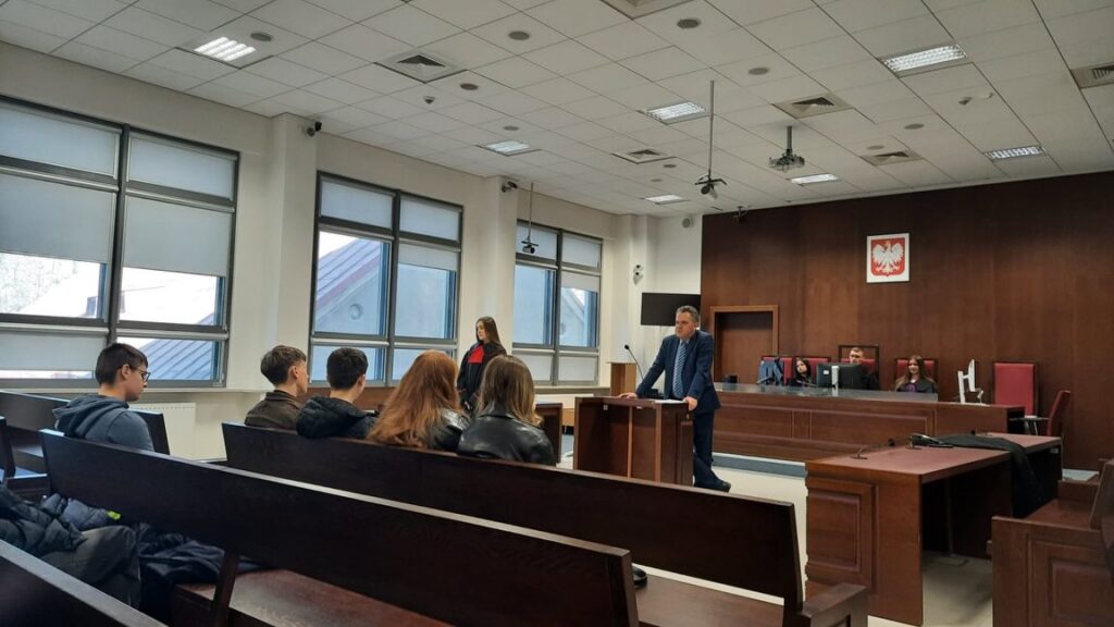 admin 3 tygodnie temu Organizacyjne , Wycieczki9 marca 2026 roku uczniowie klasy III E wzięli udział w projekcie edukacyjnym organizowanym przez Krajową Szkołę Sądownictwa i Prokuratury w Lublinie. Celem wizyty było przybliżenie uczniom funkcjonowania polskiego wymiaru sprawiedliwości oraz zapoznanie ich ze specyfiką zawodów prawniczych.Na początku licealiści wysłuchali prelekcji pt. „Jak dojść do służby sędziowskiej i prokuratorskiej”, którą przedstawił pan Dariusz Szawurski-Radetz. Podczas wystąpienia uczniowie dowiedzieli się, jak wygląda droga kariery prawniczej od ukończenia studiów, przez egzamin wstępny do Krajowej Szkoły Sądownictwa i Prokuratury, aż po kilkuletnią aplikację, podczas której przyszli prawnicy zdobywają doświadczenie w sądach i prokuraturach. Następnie w Sądzie Okręgowym w Lublinie spotkali się z sędzią Jarosławem Kowalskim, który opowiedział, jak w praktyce wygląda przebieg rozprawy sądowej oraz jakie role pełnią osoby biorące udział w postępowaniu. Przybliżył także informacje na temat strojów urzędowych przedstawicieli zawodów prawniczych. Podczas wizyty w sądzie licealiści zwiedzili jego zabytkowy XIX-wieczny gmach. W jednej z historycznych sal rozpraw mogli zobaczyć portrety zasłużonych sędziów związanych z lubelskim wymiarem sprawiedliwości m. in. Bolesława Sekutowicza, Stanisława Bryły oraz Władysława Grzybowskiego. Istotnym punktem realizacji projektu był udział uczniów w nowoczesnych warsztatach z wykorzystaniem technologii wirtualnej rzeczywistości, prowadzonych przez panią Monikę Kanię oraz panią Dorotę Jędrasik. Dzięki specjalnym goglom VR uczniowie mogli wziąć udział w symulacji rozprawy sądowej i wcielić się w role uczestników procesu, co pozwoliło im lepiej zrozumieć przebieg postępowania sądowego. Na zakończenie wizyty młodzież odwiedziła studio nagrań multimedialnych Krajowej Szkoły Sądownictwa i Prokuratury, gdzie została zapoznana z nowoczesnym zapleczem technicznym oraz sposobami przygotowywania materiałów multimedialnych wykorzystywanych w procesie szkolenia.Udział w projekcie był dla uczniów dobrą okazją do poznania funkcjonowania instytucji wymiaru sprawiedliwości oraz zdobycia wiedzy na temat możliwości rozwoju kariery w zawodach prawniczych.