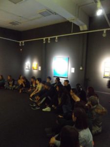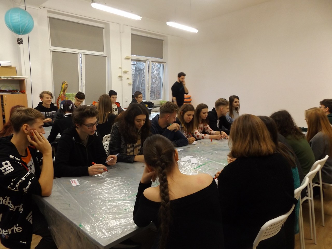 W Galerii Labirynt młodzież wzięła udział w warsztatach edukacyjnych związanych z wystawą „Czy kolory mają kształty?” Uczniowie zastanawiali się m. in. nad definicją sztuki współczesnej, a swoje spostrzeżenia zapisywali na kartkach i omawiali razem z absolwentami historii sztuki. Młodzi graficy oglądali także wystawę prezentującą prace artystów takich jak: Laura Castagno, Jan Dobkowski, Julian Raczko, Józef Robakowski, Zygmunt Rytka, Kajetan Sosnowski, Ryszard Winiarski, Tomasz Zawadzki i Jan Ziemski. Uczniowie wspólnie z prowadzącymi zajęcia analizowali i interpretowali obrazy oraz instalacje przestrzenne, wykorzystując własną wiedzę oraz informacje uzyskane podczas warsztatów.