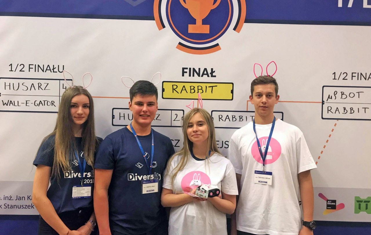 admin 8 lat temu Konkursy , OsiągnięciaDrużyna w składzie: Tymoteusz Bartnik (2B), Kajetan Larwa (2B), Martyna Kłosek (3A) i Jagoda Brodziak (3A) zajęła pierwsze miejsce w konkurencji walka zbiorowa oraz pierwsze miejsce w zawodach robotów mini-sumo na ogólnopolskim, 17 turnieju z robotyki – Diversity, organizowanym przez Motorola Solutions.