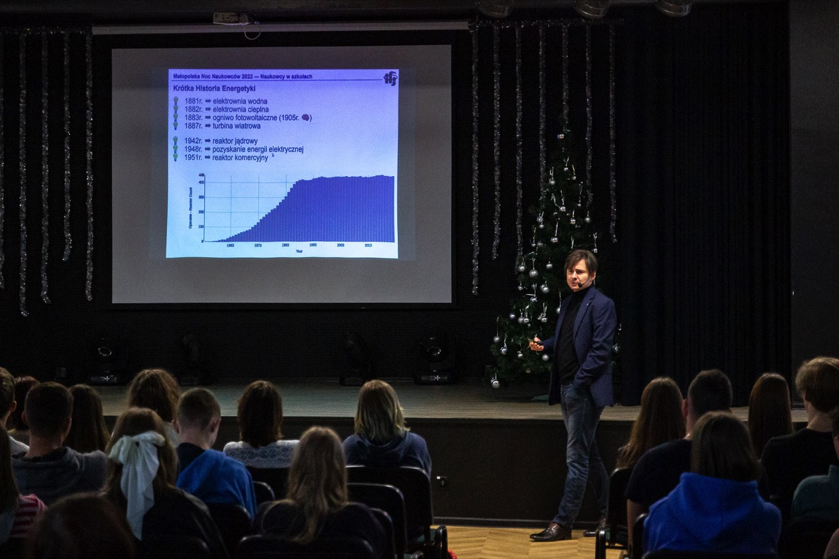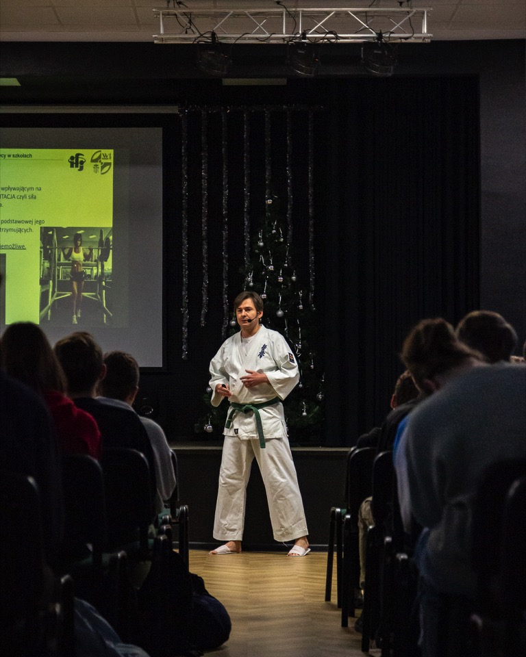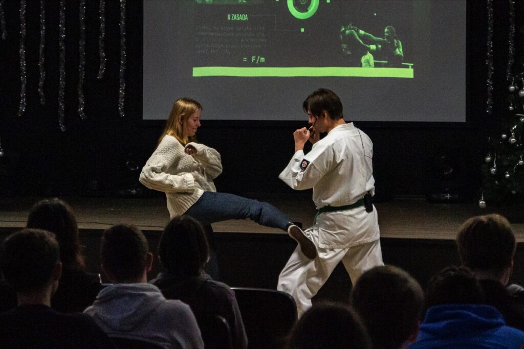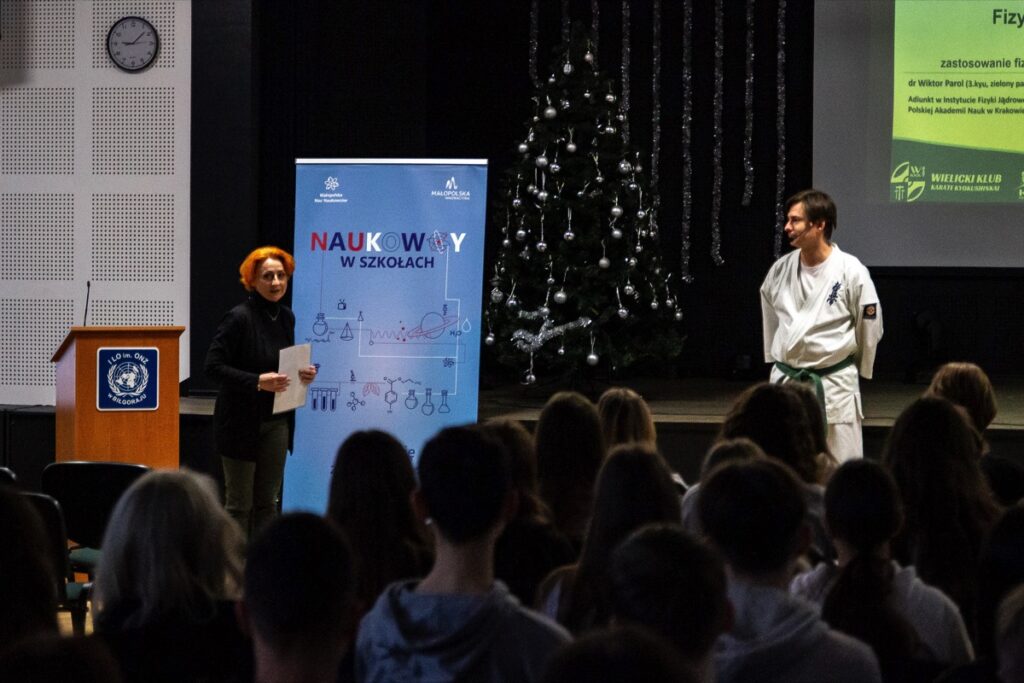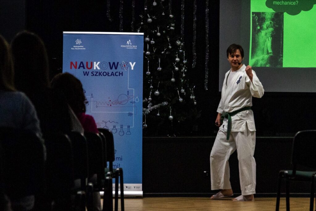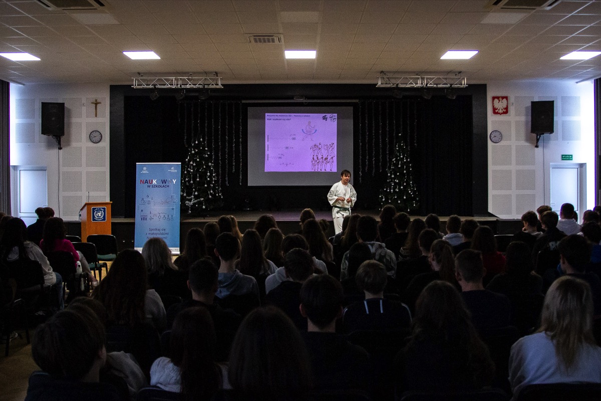 16 grudnia 2022 roku w auli naszej szkoły dr Wiktor Parol z Instytutu Fizyki Jądrowej Polskiej Akademii Nauk poprowadził dla licealistów wykłady: „Zastosowanie Fizyki w Karate” oraz „Czy naprawdę muszę zrezygnować ze smartphona, by ratować planetę? Czyli czysta energia szansą na dalsze życie w komforcie”. Pierwszy wykład dotyczył elementów mechaniki bryły sztywnej. Połączony był z demonstracją omawianych układów fizycznych w wykonywanych technikach Karate Kyokushinkay. Podczas kolejnego wykładu prelegent koncentrował się na energetyce jądrowej oraz nieuchronności jej wdrożenia w Polsce. Podkreślił, że jest to niezbędne, aby utrzymać aktualny poziom i komfort życia z zachowaniem sprzyjającego środowiska naturalnego oraz spowolnić zmiany klimatu.