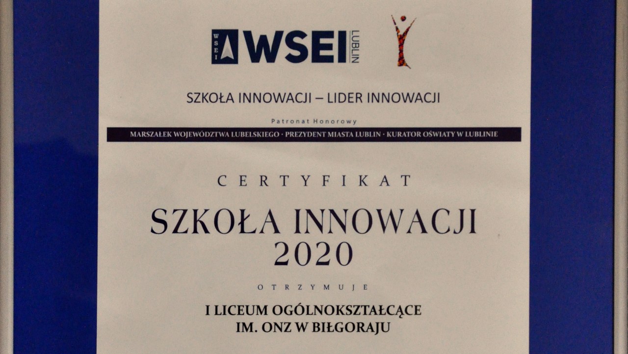 admin 6 lat temu Bez kategorii , Organizacyjne , OsiągnięciaW zorganizowanym po raz ósmy przez Wyższą Szkołę Ekonomii i Innowacji w Lublinie projekcie certyfikacji szkół nasze liceum otrzymało dwa wyróżnienia: „Szkoła – Lider Innowacji 2020” i „Innowacyjna Biblioteka 2020”.