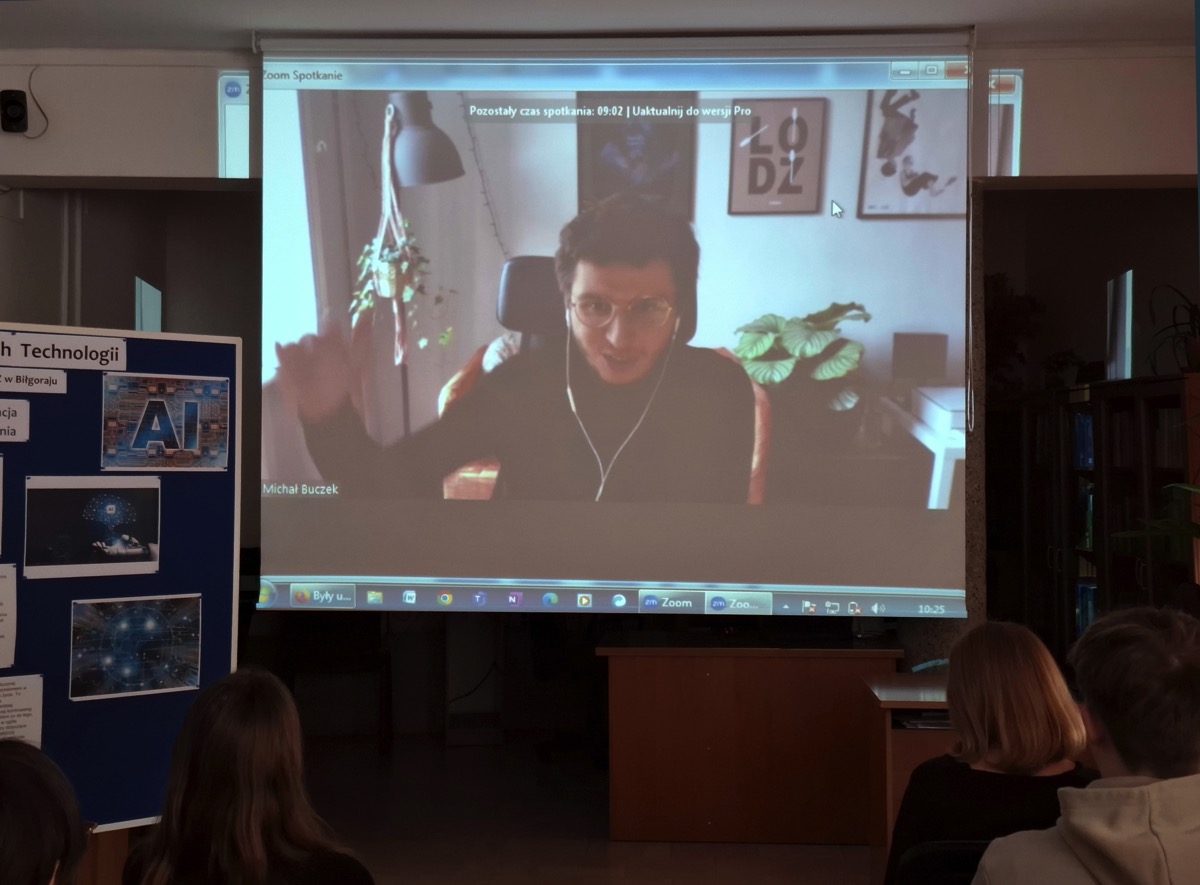 Spotkanie zostało zorganizowane przez panią Annę Dobraczyńską w ramach realizacji projektu „Dzień Nowych Technologii”, który w naszym liceum w tym roku dotyczy szans i zagrożeń związanych ze sztuczną inteligencją.