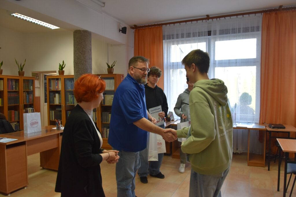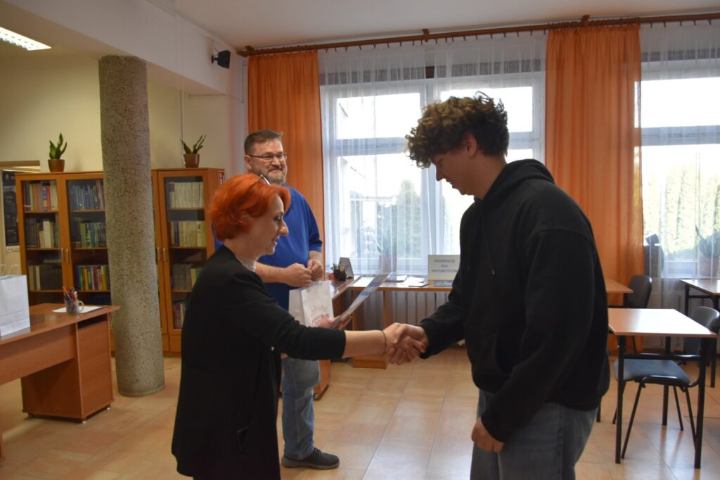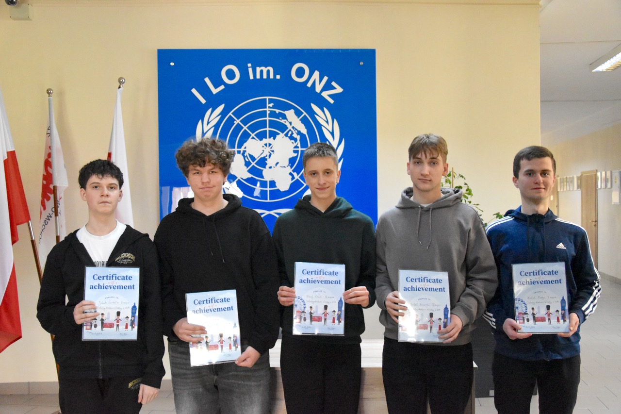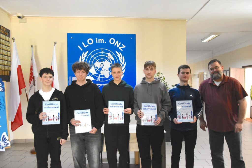 admin 2 tygodnie temu Konkursy , Organizacyjne , Osiągnięcia11 marca 2026 roku odbyło się podsumowanie Szkolnego Konkursu Wiedzy o USA oraz uroczyste wręczenie nagród. Do konkursu przystąpiło 60 uczniów, po 3 przedstawicieli z każdej klasy, a ich niełatwym zadaniem było rozwiązanie testu składającego się z 80 pytań z zakresu historii, geografii oraz kultury USA. Najwyższy wynik uzyskał Filip Szwed z klasy II A (opiekun p. Marta Pindor). Drugie miejsce zdobyli ex aequo Marcel Matys z klasy III E (opiekun p. Walentyna Waszczuk-Różańska) oraz Jakub Świtała z klasy I B (opiekun p. Aneta Swatowska). Laureatem trzeciego miejsca został Błażej Osuch z klasy II E (opiekun p. Anna Zych-Watrak), a na czwartej pozycji uplasował się Rafał Różański z klasy III G (opiekun p. Patrycja Kanty).
