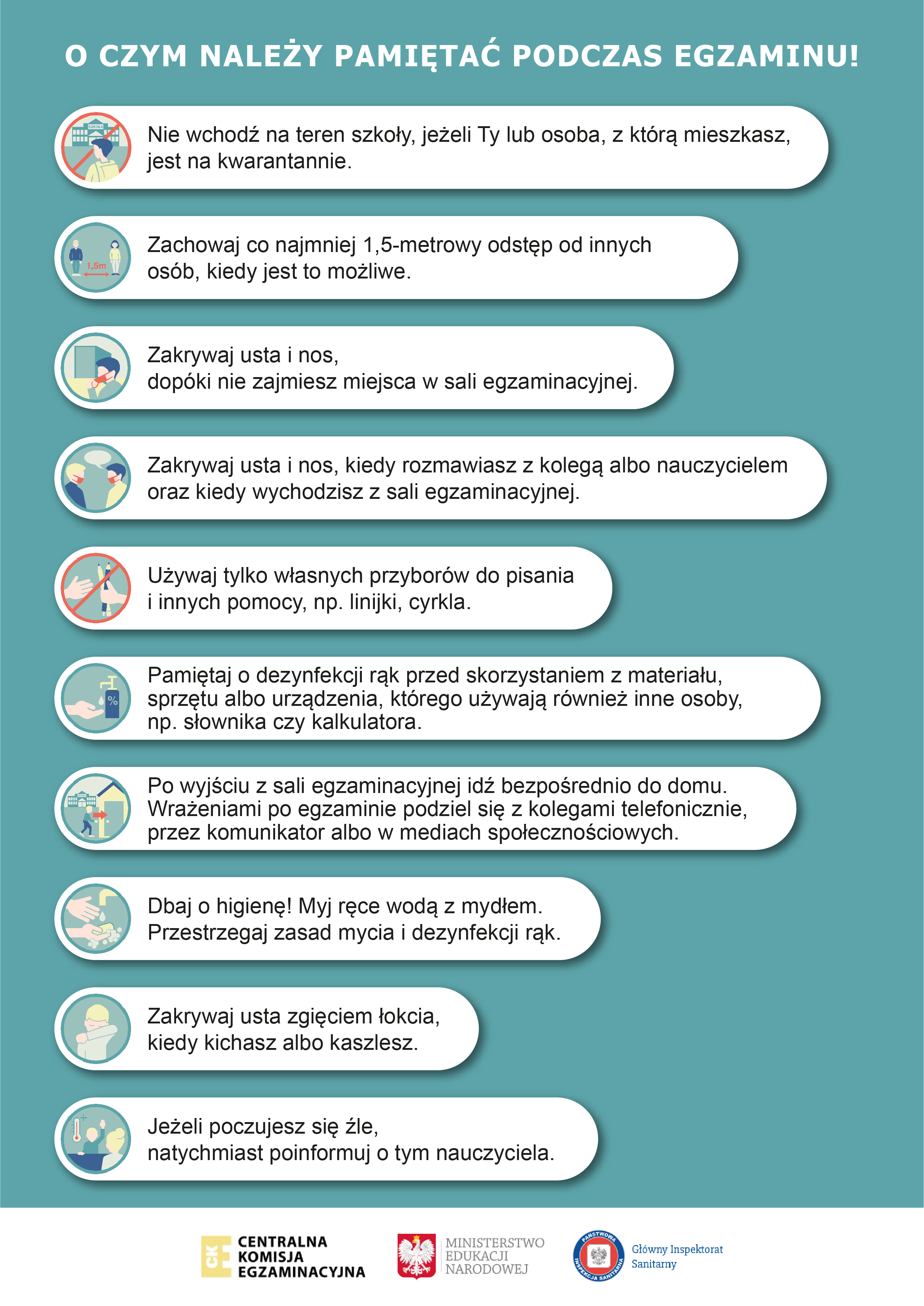 admin 6 lat temu OrganizacyjneUwaga zdający maturę i poprawiający wyniki egzaminu maturalnego! Wszyscy zdający mają obowiązek zapoznania się z zaktualizowanymi procedurami maturalnymi oraz wytycznymi MEN, CKE i Głównego Inspektoratu Sanitarnego w sprawie rygoru sanitarnego podczas egzaminu.