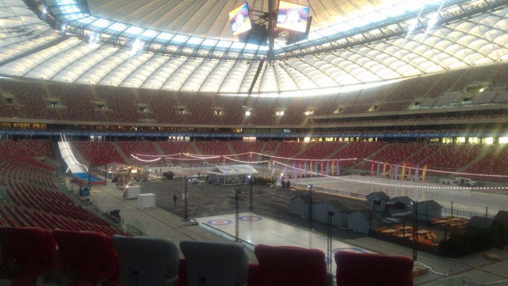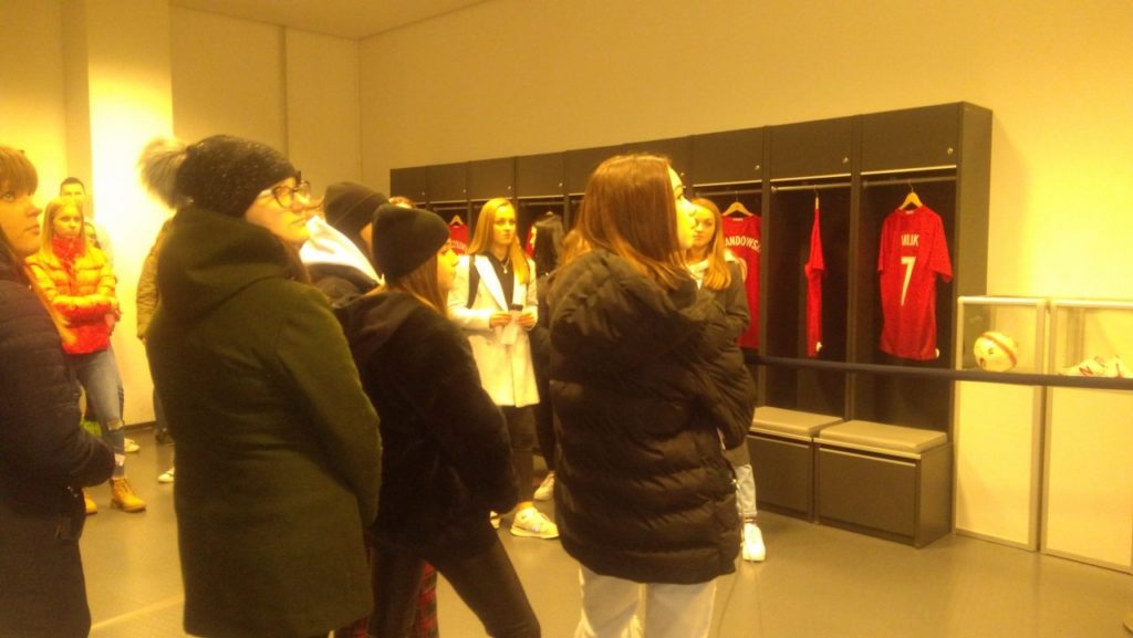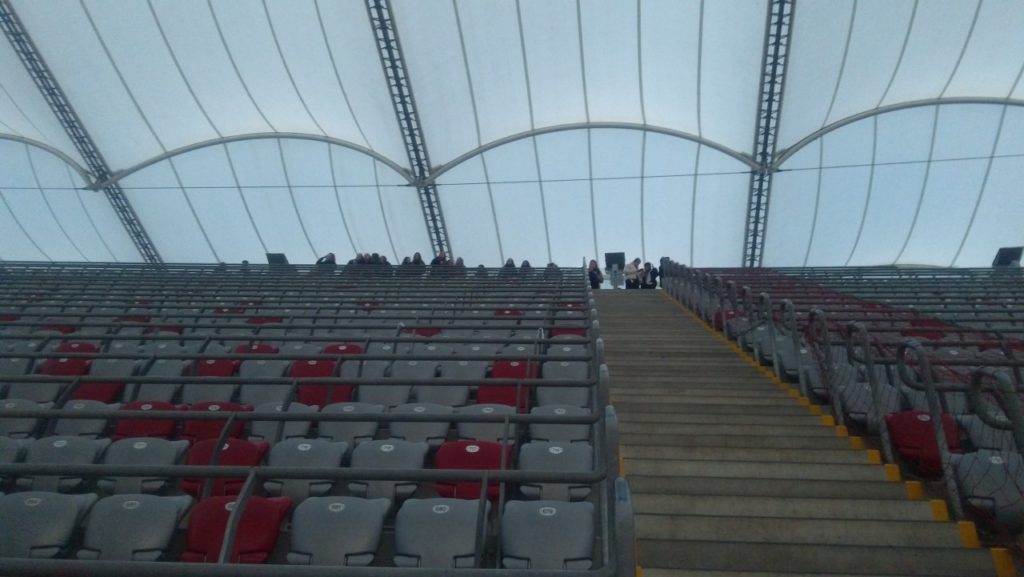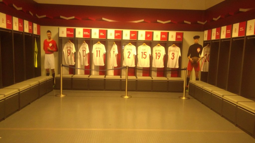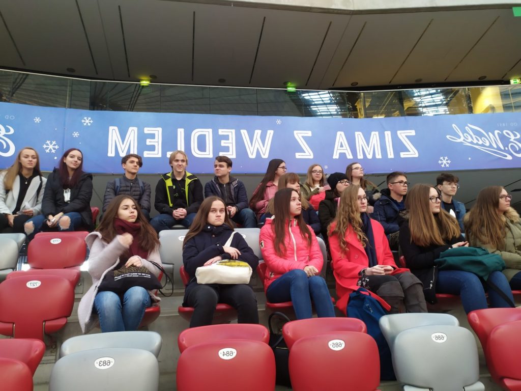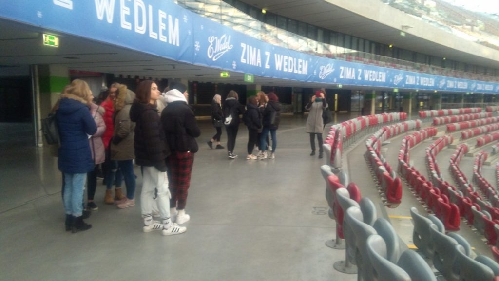 Następnie udaliśmy się na zwiedzanie stadionu PGE Narodowy. Przechodząc trasą „Piłkarskie Emocje”, widzieliśmy miejsca, w których piłkarze przygotowują się do meczów oraz dzięki przewodnikowi dowiedzieliśmy się, jak funkcjonuje arena, gdy nie są urządzane na niej imprezy sportowe oraz zapoznaliśmy się z historią jej powstania. Było to bardzo ciekawe doświadczenie szczególnie dla fanów naszej reprezentacji.