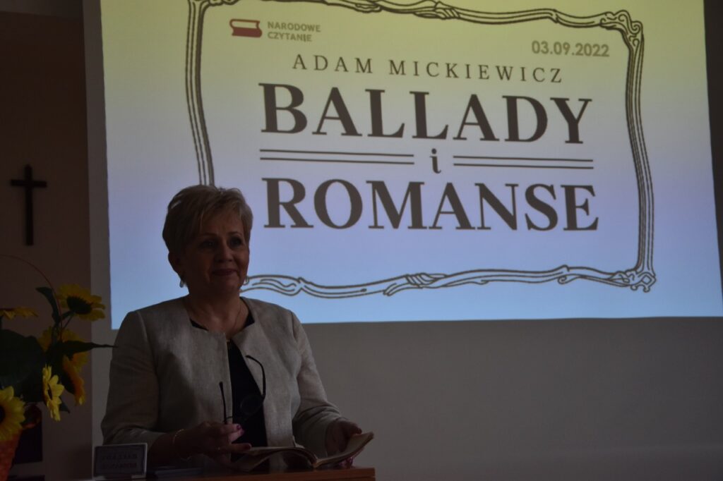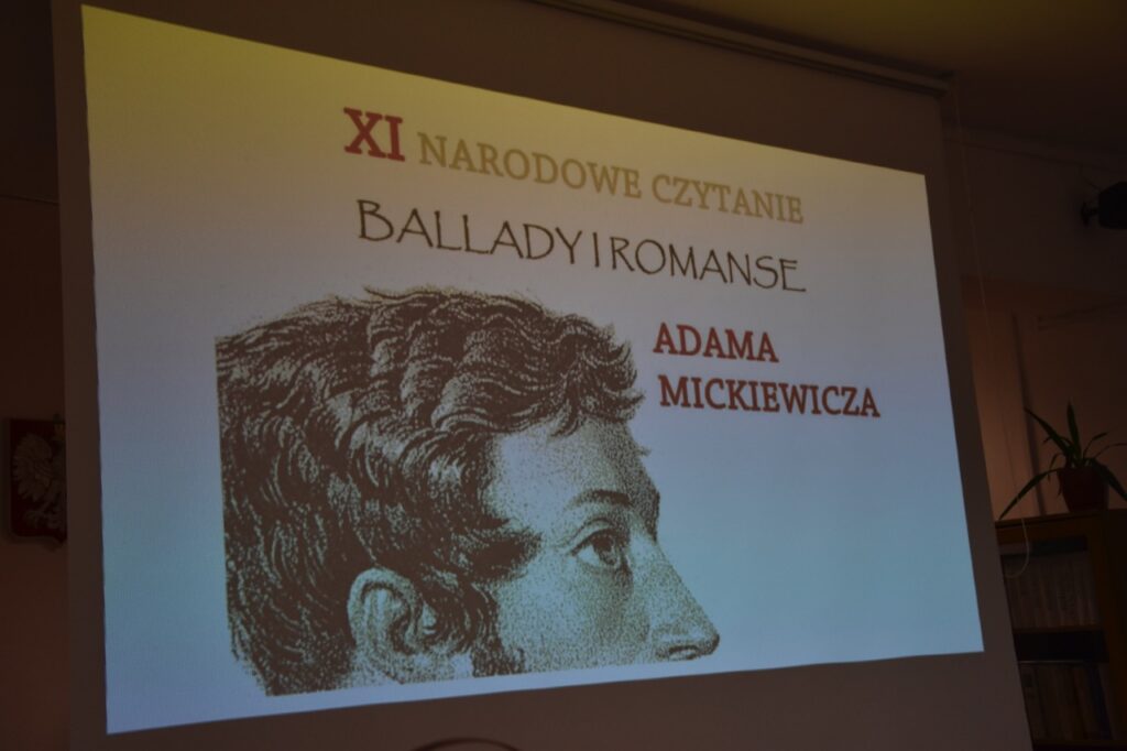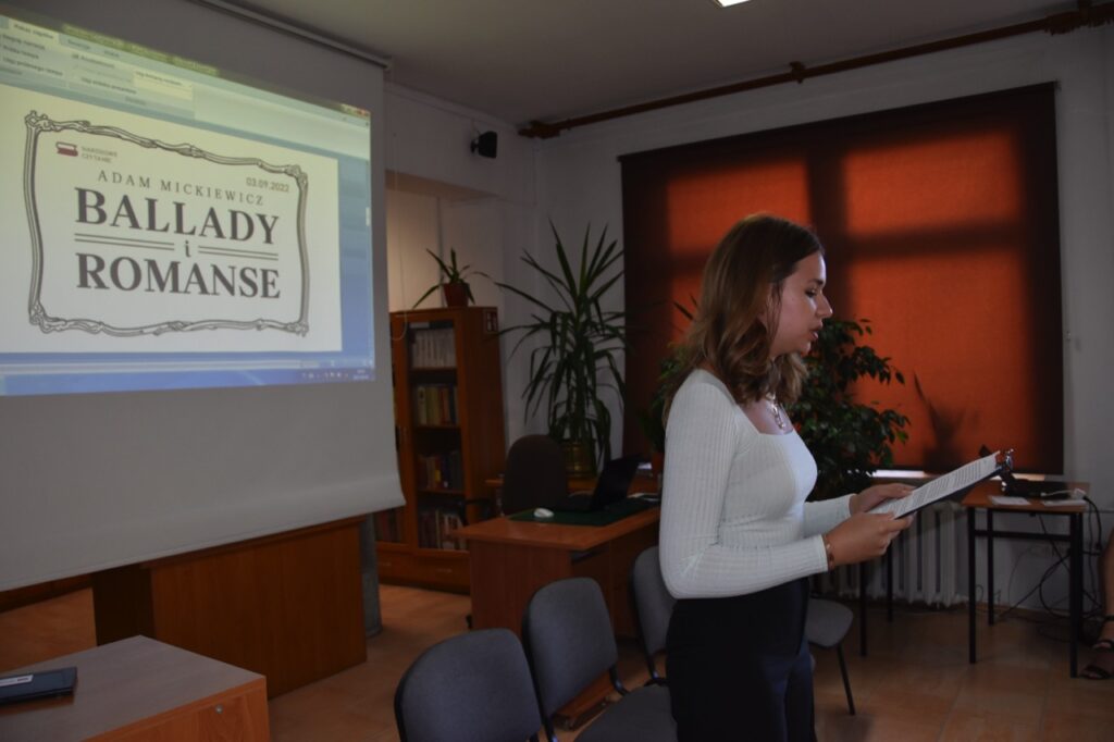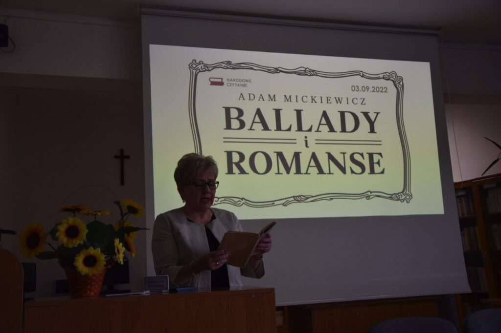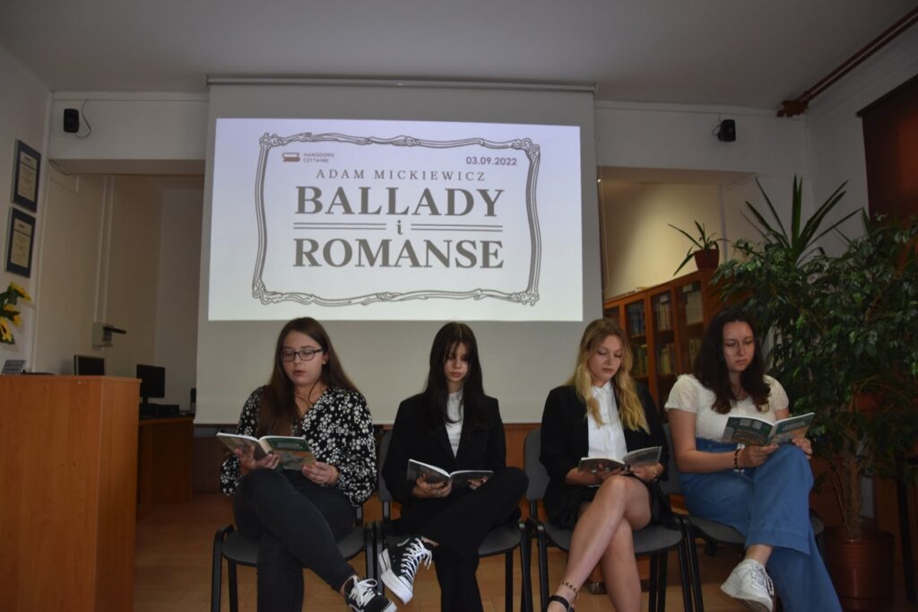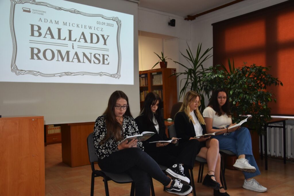 Młodzież zgromadzona w czytelni obejrzała film z udziałem Pary Prezydenckiej zachęcający do współtworzenia akcji i prezentację multimedialną, która przybliżyła ideę Narodowego Czytania oraz problematykę „Ballad i romansów”. W świat ballad Mickiewicza wprowadziła także licealistów pani Dyrektor Jolanta Rycyk, a następnie przeczytała fragment utworu „Lilije”. Przed rówieśnikami zaprezentowały się również: Karina Gozdecka, Natalia Iwanek, Oliwia Pietrasz, Katarzyna Sarzyńska z kl. II D oraz Kinga Łupina, Maciej Kudyba, Paweł Mydlak, Wiktor Piech z kl. II E. Uczniowie czytali ballady: „Romantyczność”, „Świtezianka” oraz „Pani Twardowska”. W roli konferansjera wystąpiła Laura Karpik z kl. II D. Na zakończenie spotkania uczniowie otrzymali pamiątkowe pieczęcie Narodowego Czytania 2022.