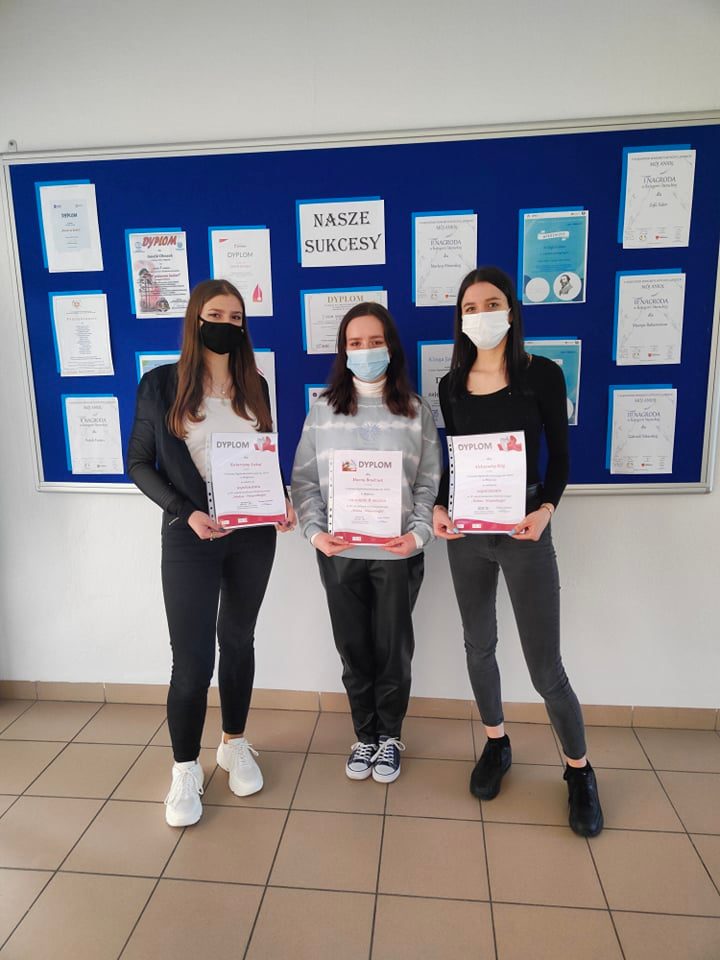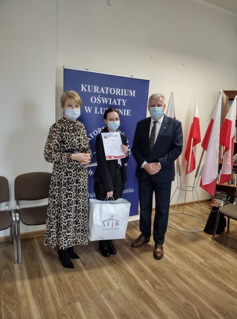 admin 4 lata temu Bez kategorii , Konkursy , Organizacyjne , OsiągnięciaWe wtorek 18.01.2022 r. w Zamościu, w siedzibie Delegatury Kuratorium Oświaty w Lublinie odbyło się spotkanie z panem Tomaszem Zielińskim – posłem na Sejm RP oraz panią dyrektor Delegatury Moniką Żur. Wręczono nagrody laureatom i osobom wyróżnionym w IV edycji konkursu historycznego „Wolna – Niepodległa” organizowanego przez pana posła Tomasza Zielińskiego oraz Wojewodę Lubelskiego, Lubelskiego Kuratora Oświaty, IPN Oddział w Lublinie oraz Kuratorium Oświaty w Lublinie Delegatura w Zamościu, pod honorowym patronatem Prezesa Rady Ministrów Mateusza Morawieckiego. Nagrodę odebrała laureatka II miejsca /w kategorii: esej/ – Hanna Brodziak kl. II D (opiekun p. Barbara Chołyst). Wyróżnienia /w kategorii: wiersz/ otrzymały: Katarzyna Łokaj z kl. III Hp (opiekun p. Elżbieta Ciryt) i Aleksandra Róg z kl. III Dp (opiekun p. Jadwiga Oleszek).