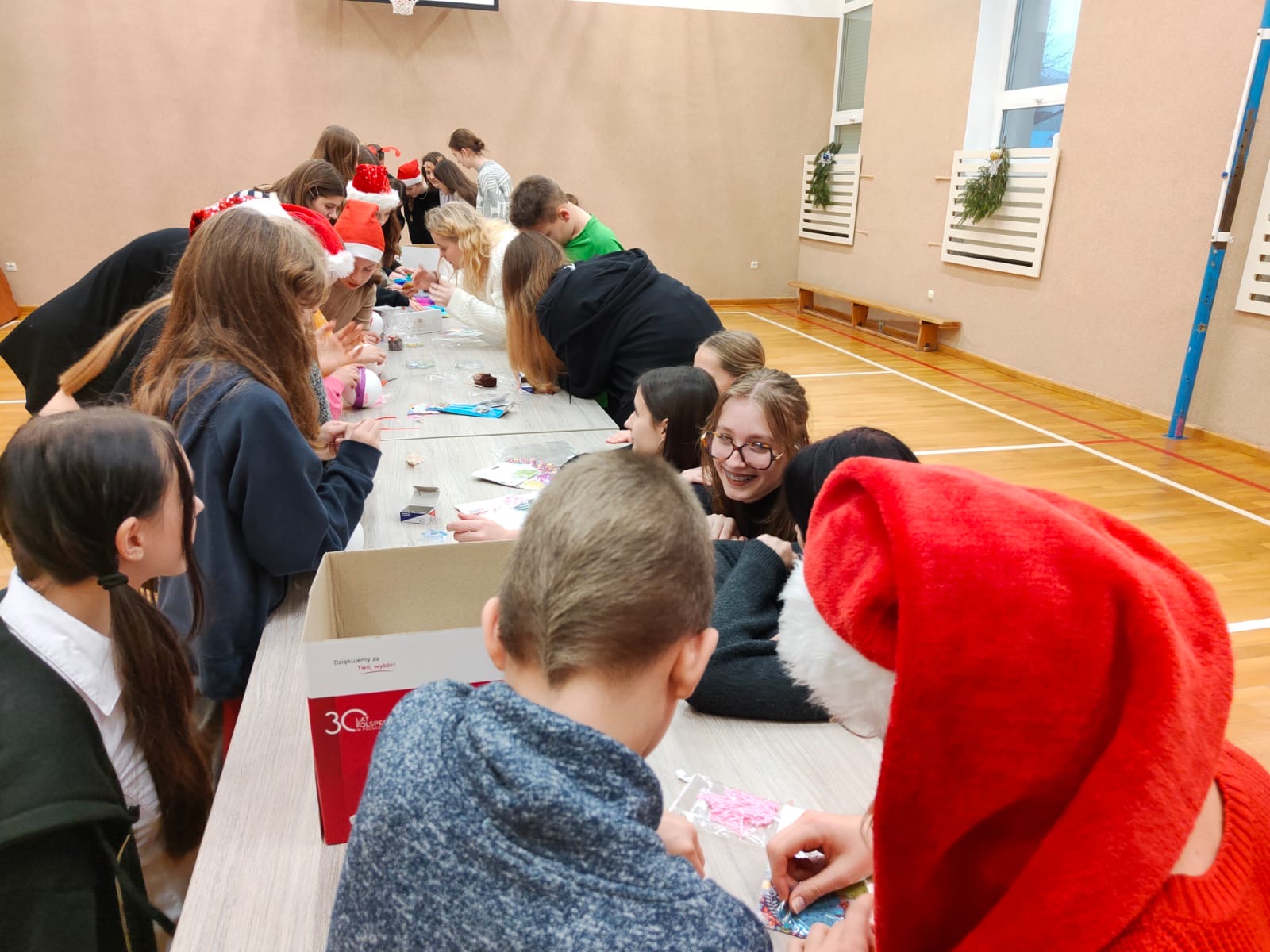 ​W tym roku 20 grudnia 2023 roku również liczna grupa naszej młodzieży razem z opiekunami Koła Przyjaciół Biblioteki odwiedziła podopiecznych Wioski Dziecięcej. Tym razem dziewczęta przygotowały prezenty w postaci własnoręcznie upieczonych babeczek, stroik świąteczny i kartkę z życzeniami. Największą radość sprawiła dzieciom zabawa z naszymi licealistami, tańce, śpiewy i wspólne wykonywanie ozdób choinkowych. W atmosferze świątecznej nie mogło zabraknąć najważniejszego punktu programu, czyli śpiewania z towarzyszeniem instrumentów kolęd i piosenek świątecznych.