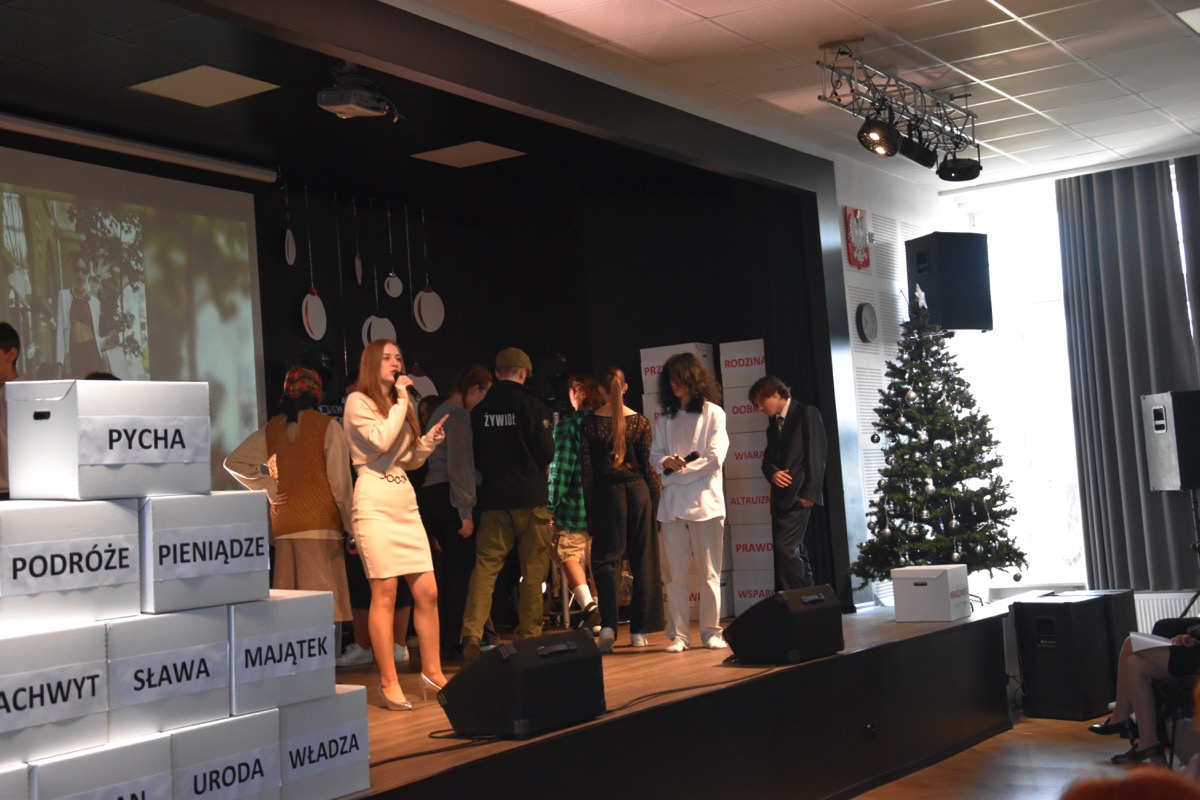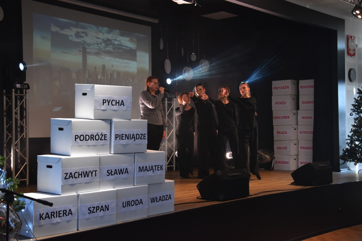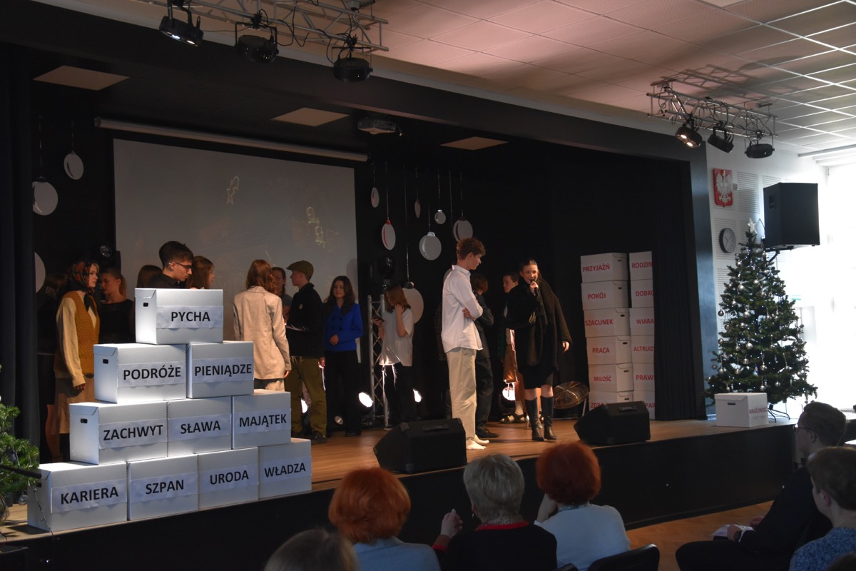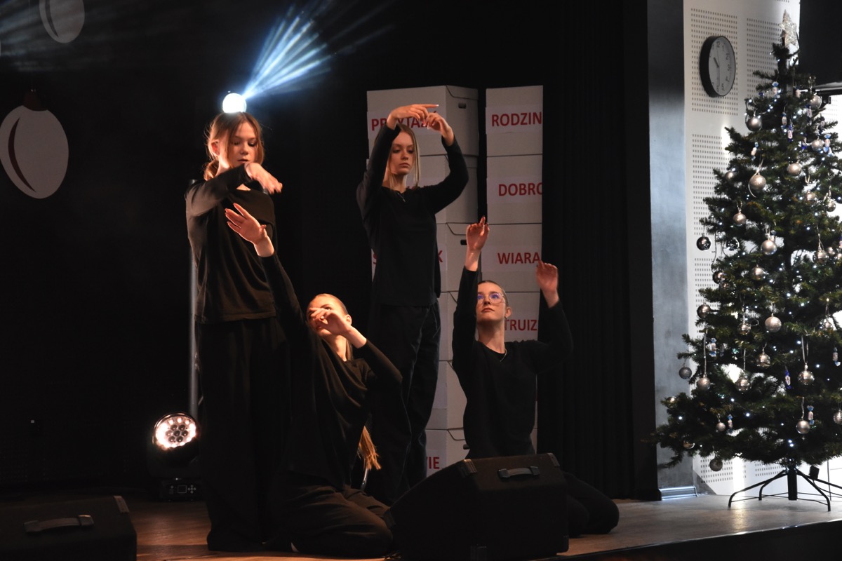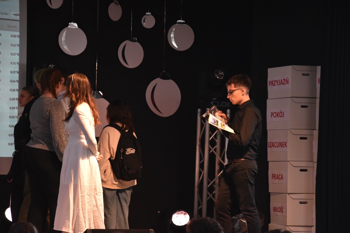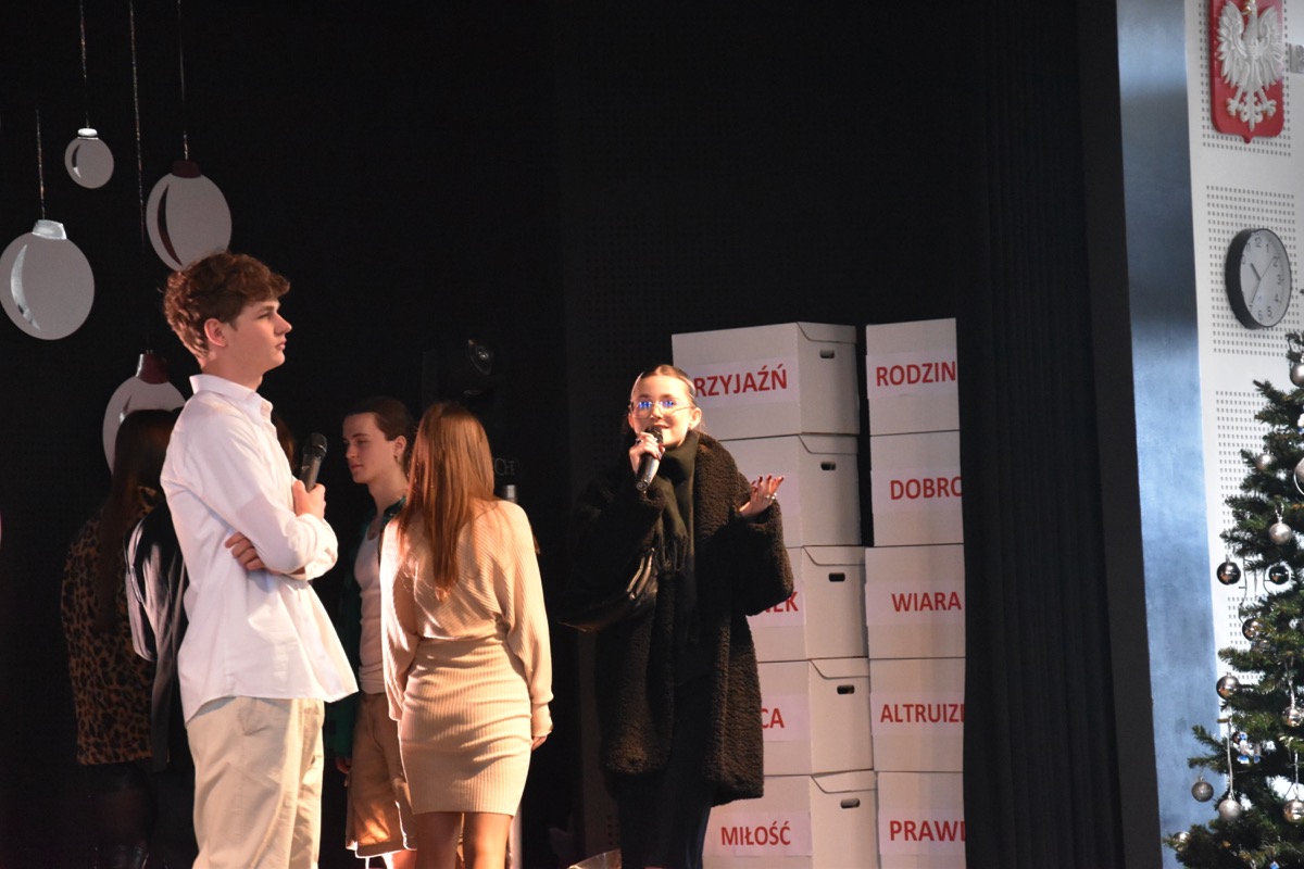 Zwyczajem lat ubiegłych, tuż przed świętami 22 grudnia 2023 roku, piękna uroczystość po raz kolejny odbyła się w auli. Część artystyczna prezentowała wydarzenia współczesnego świata, wykorzystując motywy i nawiązania biblijne sprzed dwóch tysięcy lat. Przedstawienie nie tylko wprowadziło widzów w świąteczny nastrój, ale także skłaniało do refleksji nad tym, co jest w życiu najważniejsze. Dodatkowym walorem spektaklu była piękna oprawa muzyczna.