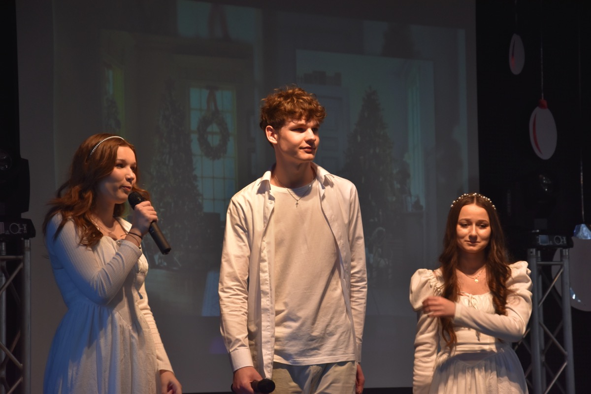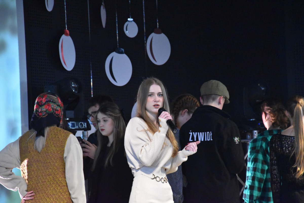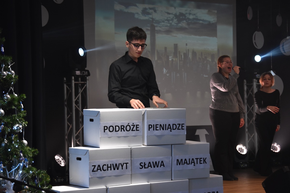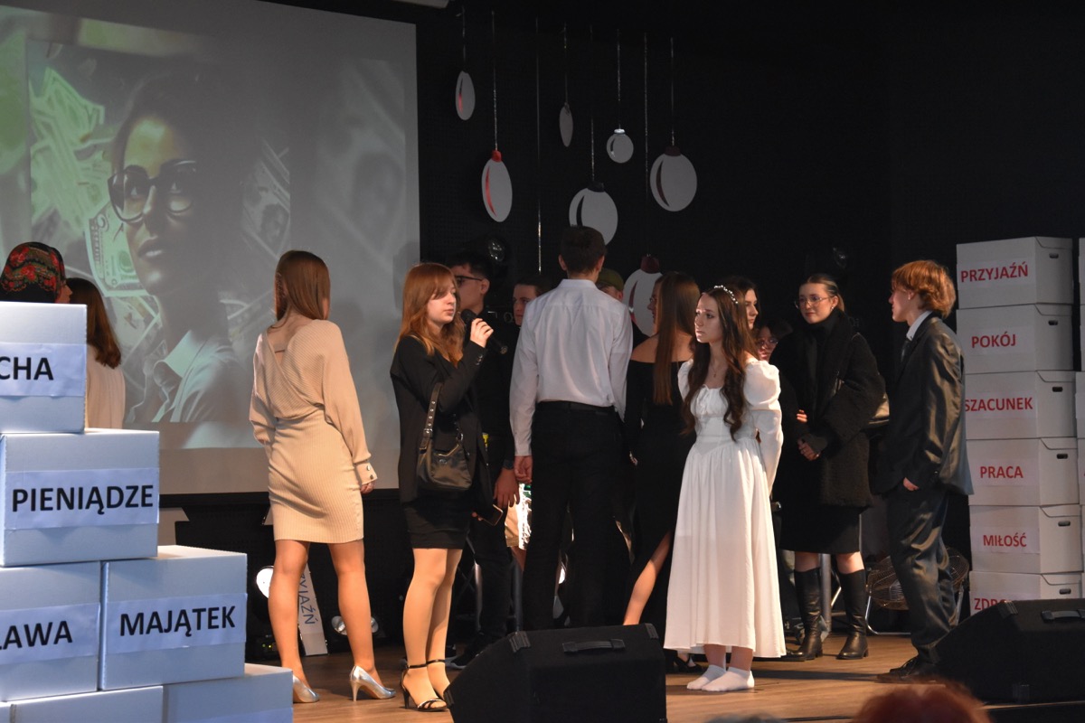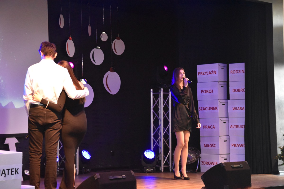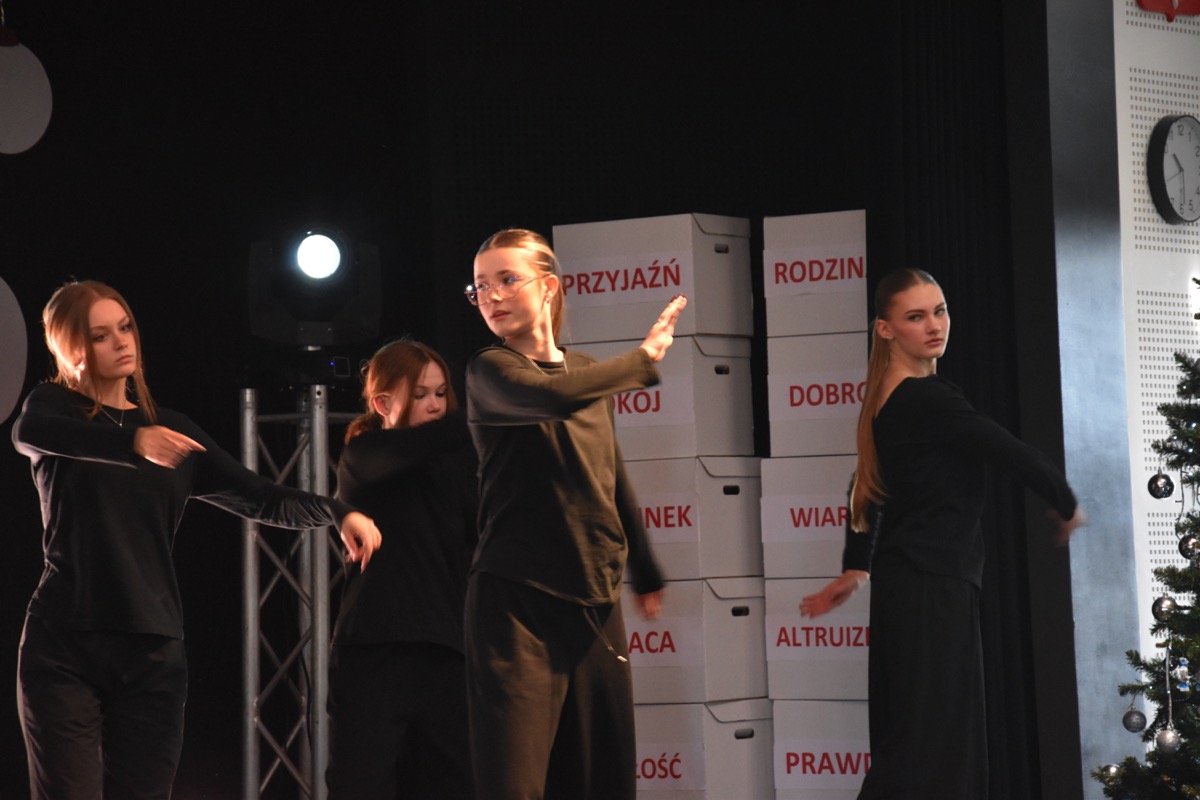 Zwyczajem lat ubiegłych, tuż przed świętami 22 grudnia 2023 roku, piękna uroczystość po raz kolejny odbyła się w auli. Część artystyczna prezentowała wydarzenia współczesnego świata, wykorzystując motywy i nawiązania biblijne sprzed dwóch tysięcy lat. Przedstawienie nie tylko wprowadziło widzów w świąteczny nastrój, ale także skłaniało do refleksji nad tym, co jest w życiu najważniejsze. Dodatkowym walorem spektaklu była piękna oprawa muzyczna.