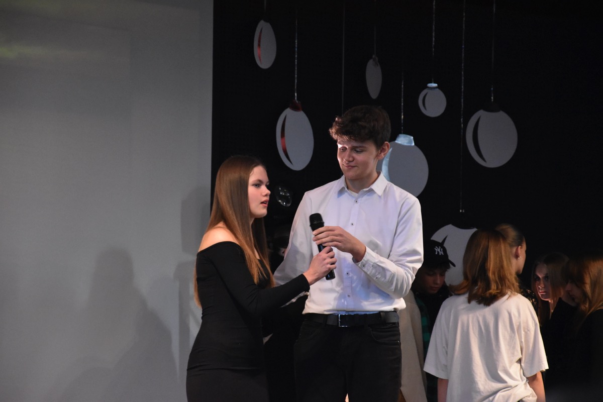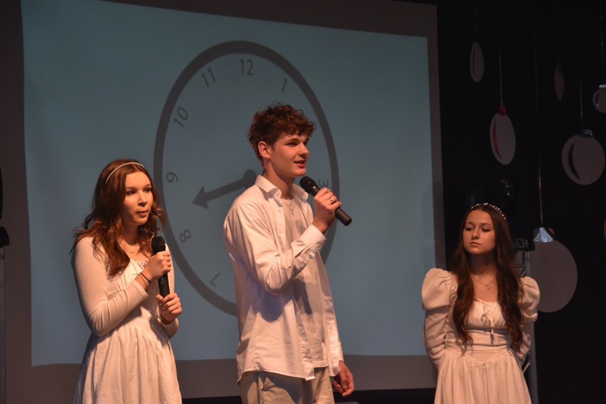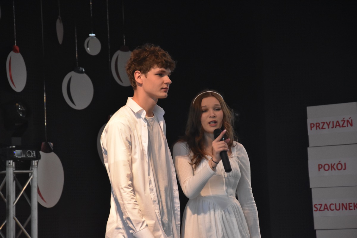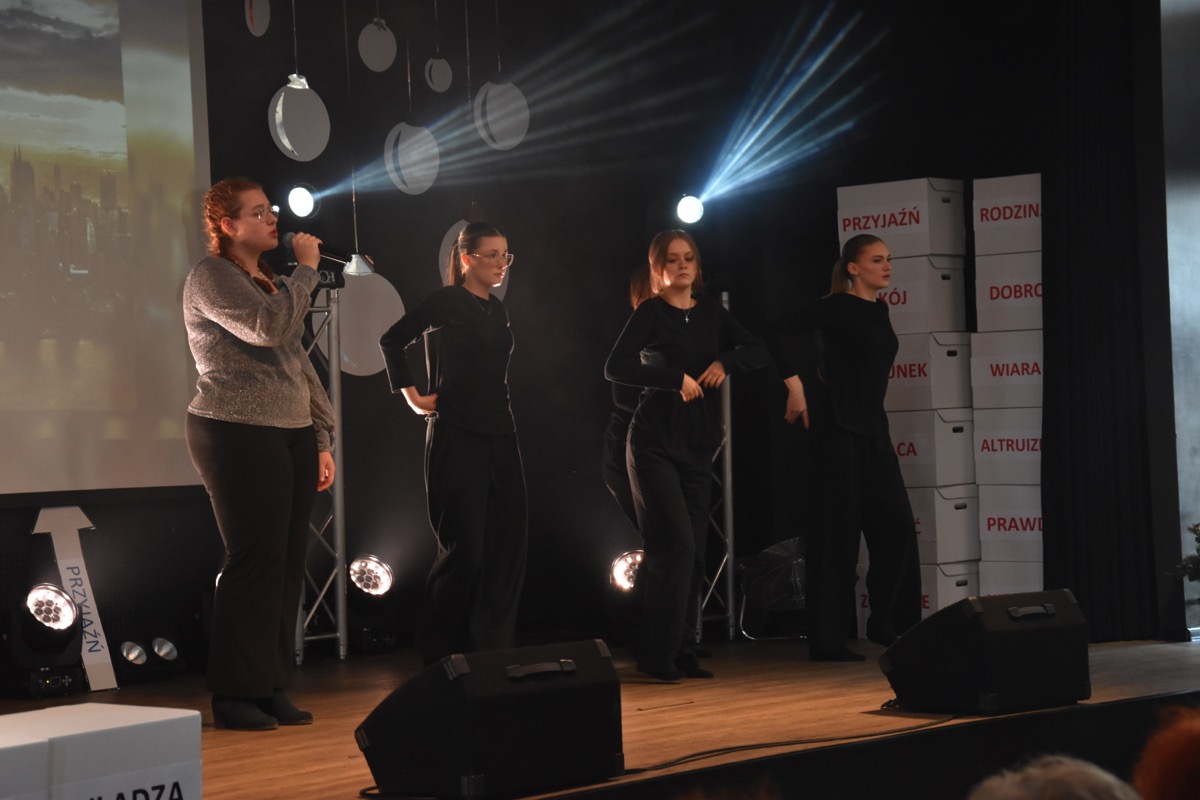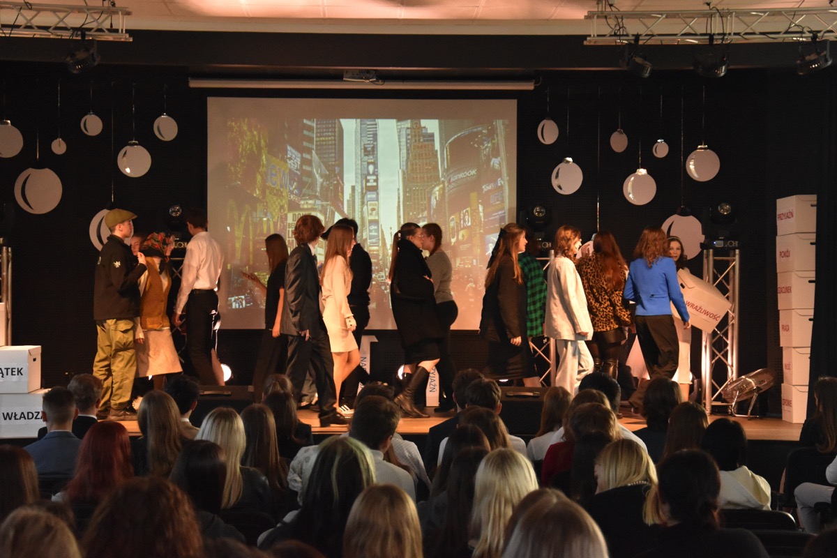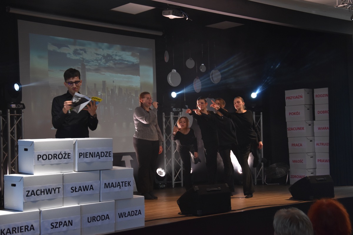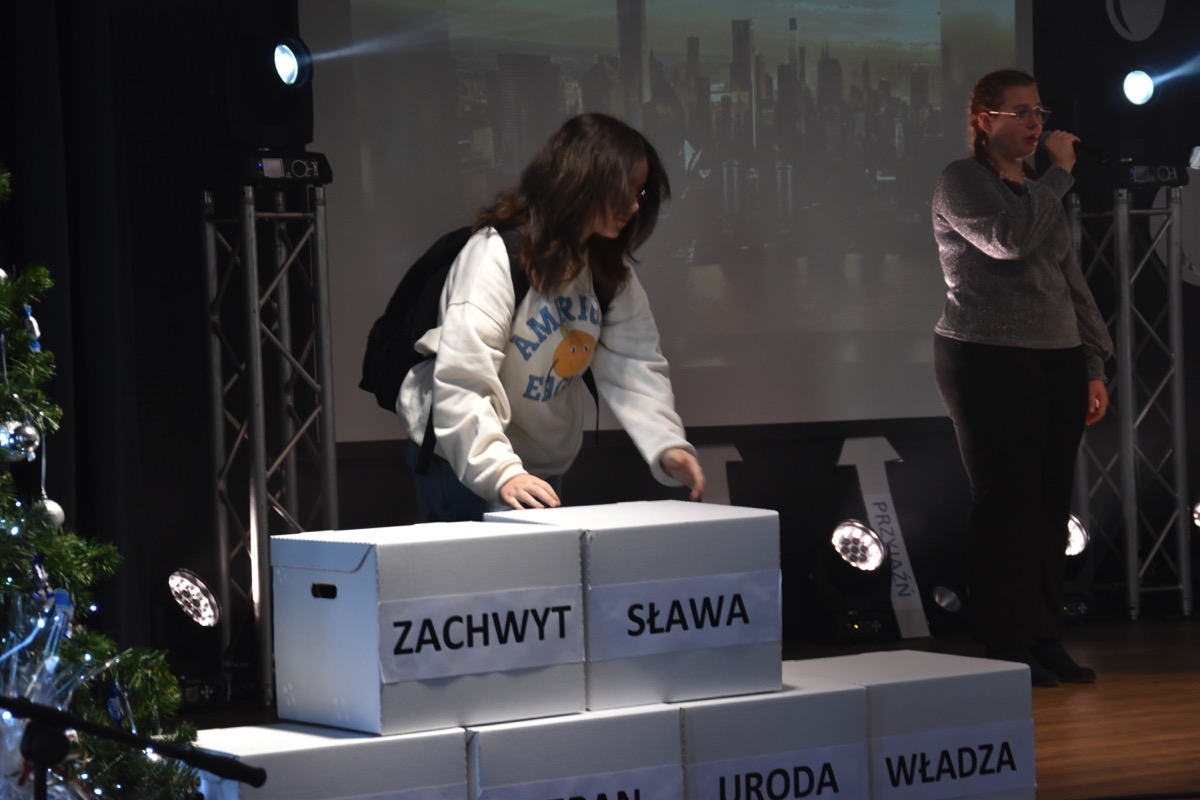 Zwyczajem lat ubiegłych, tuż przed świętami 22 grudnia 2023 roku, piękna uroczystość po raz kolejny odbyła się w auli. Część artystyczna prezentowała wydarzenia współczesnego świata, wykorzystując motywy i nawiązania biblijne sprzed dwóch tysięcy lat. Przedstawienie nie tylko wprowadziło widzów w świąteczny nastrój, ale także skłaniało do refleksji nad tym, co jest w życiu najważniejsze. Dodatkowym walorem spektaklu była piękna oprawa muzyczna.
