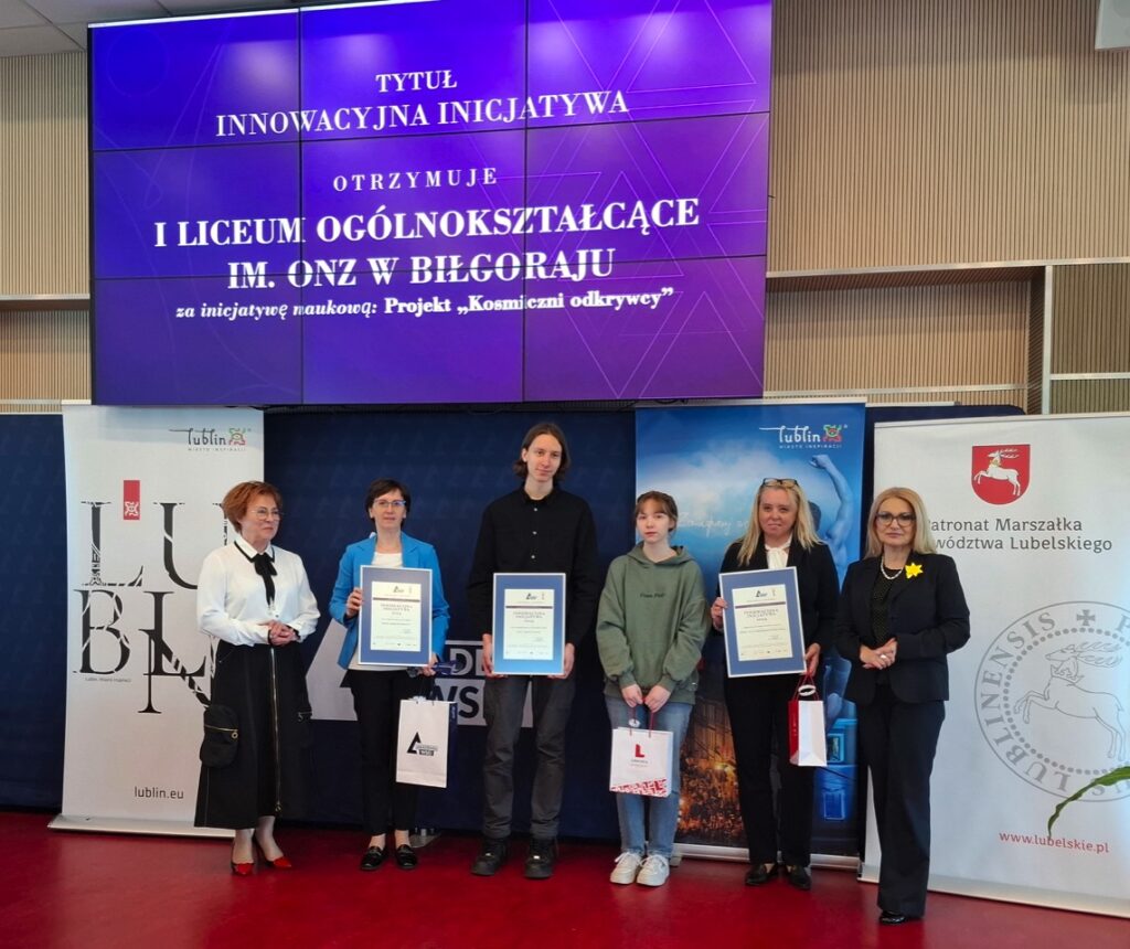 Z wielką radością informujemy, że kolejny raz nasza szkoła została doceniona nagrodą główną w konkursie „Szkoła Innowacji”. Nagrodę główną kapituła konkursu przyznała także w kategorii „Innowacyjna Inicjatywa” za projekt „Kosmiczni odkrywcy” realizowany przez uczniów klas graficznych pod kierunkiem pani Anny Dobraczyńskiej. Z kolei pierwsze wyróżnienie w kategorii „Dyrektor – Lider Innowacji” otrzymała pani Dyrektor Jolanta Rycyk, a Marek Stachów z klasy III A również pierwsze wyróżnienie zdobył w kategorii „Uczeń – Lider Innowacji”.