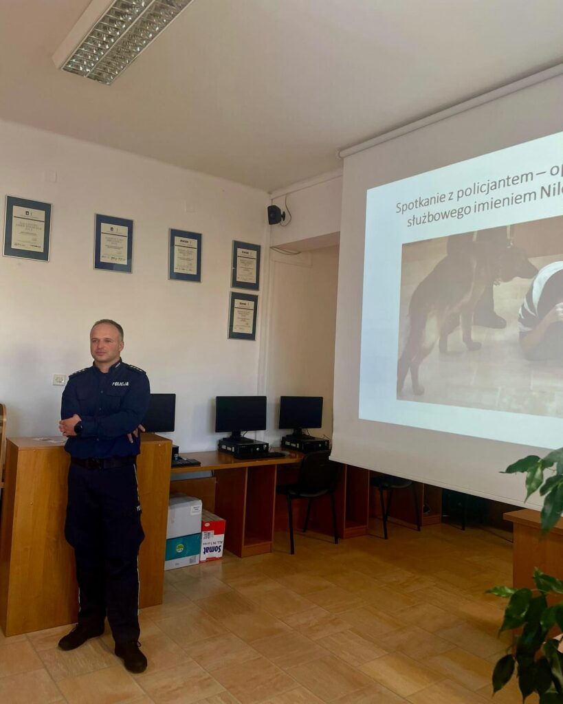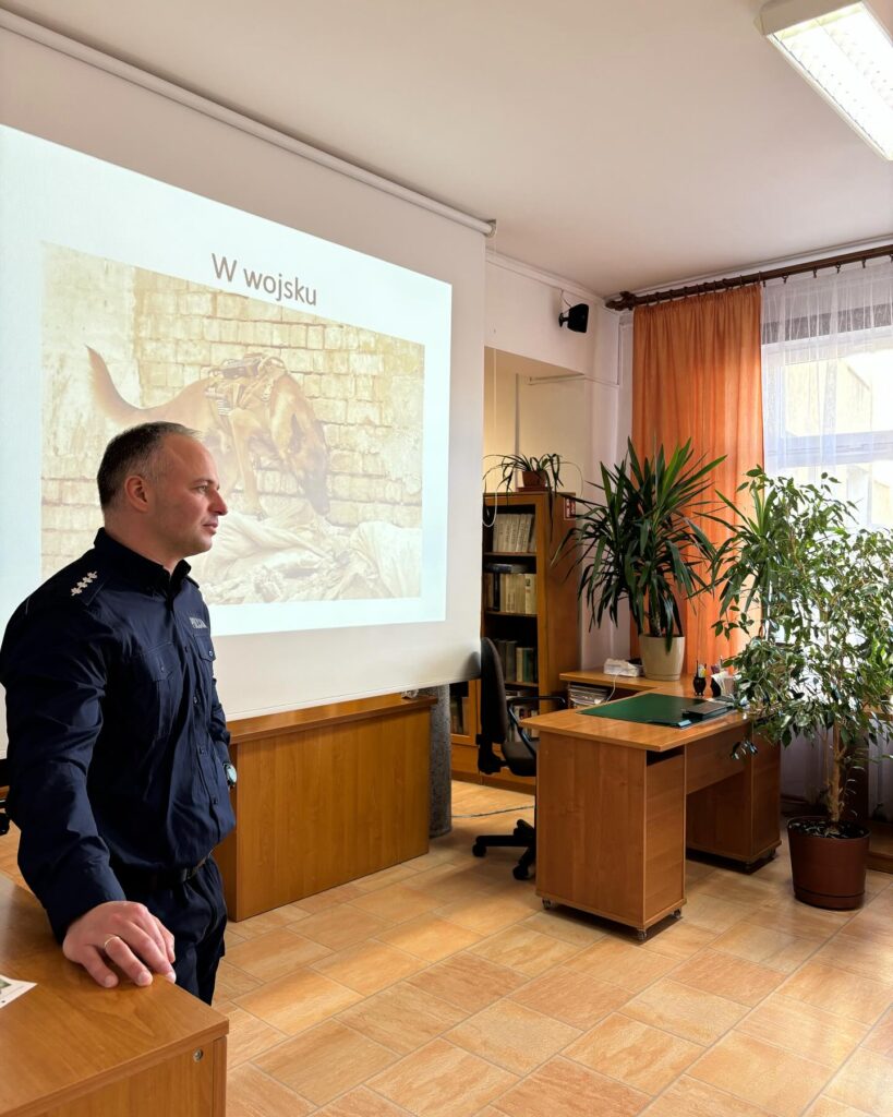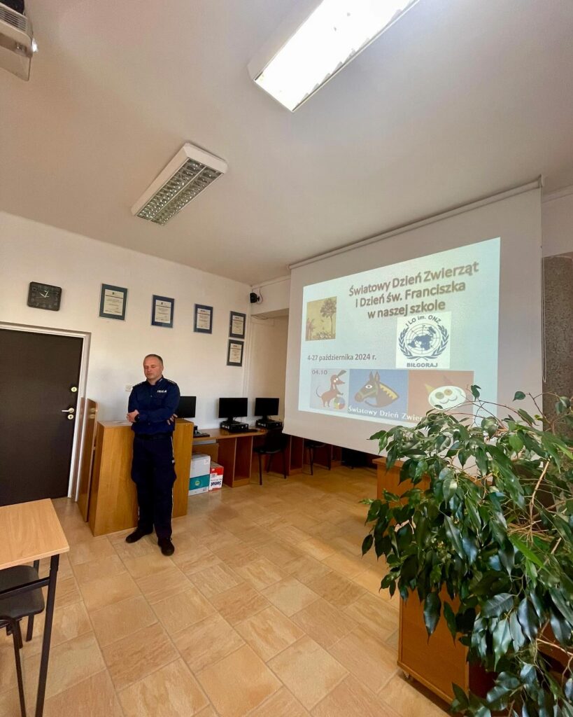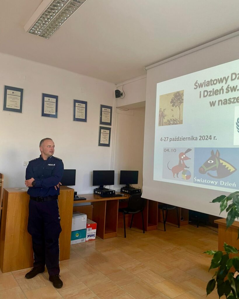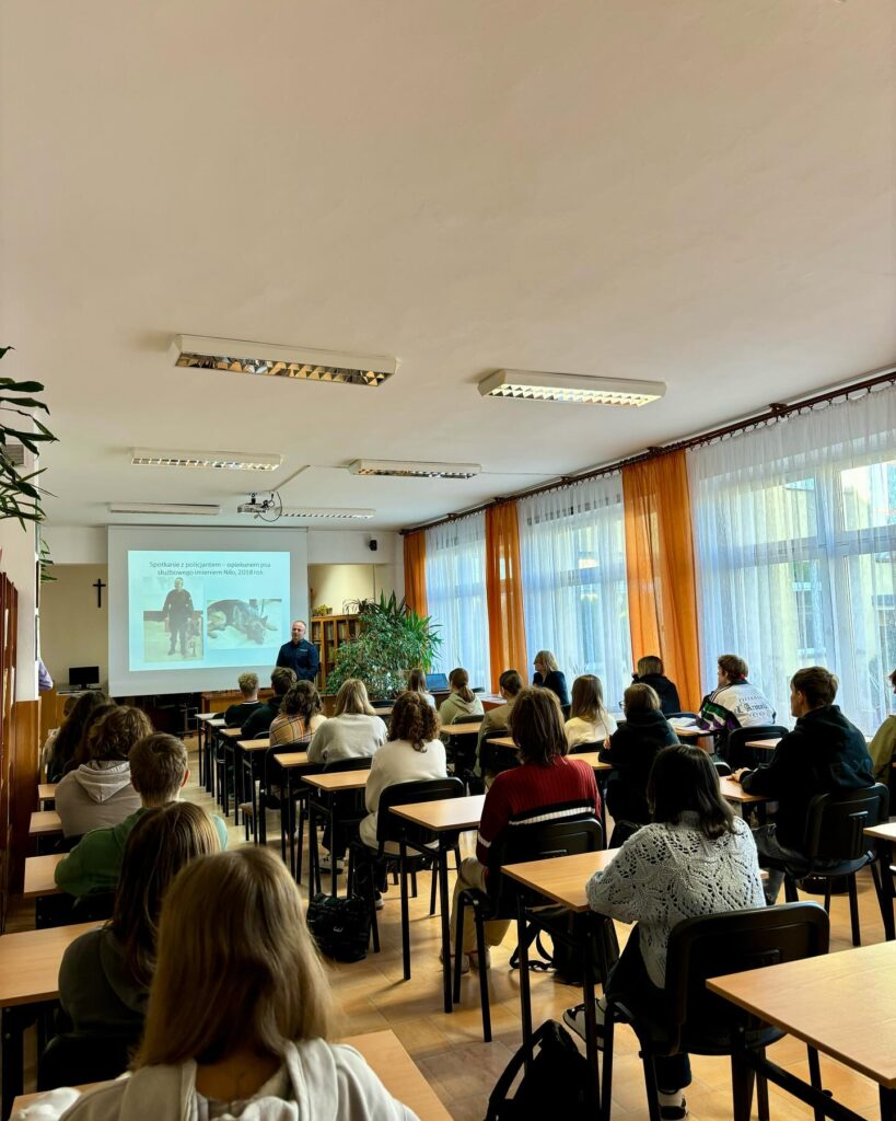 admin 1 rok temu Organizacyjne , UroczystościW dniach 4-27 października 2024 roku w naszej szkole obchodzony jest Światowy Dzień Zwierząt i Dzień św. Franciszka. Organizatorem przedsięwzięcia jest Grupa „ONZ pomaga zwierzętom” pod kierunkiem pani Anny Dobraczyńskiej. 17 października 2024 roku młodzież z klasy III A uczestniczyła w spotkaniu z aspirantem sztabowym Adamem Grandą, który opowiedział o swoich doświadczeniach w pracy z psem tropiącym. Poinformował, w jaki sposób w policji wykorzystywane są specjalnie wytresowane psy do służby patrolowej, poszukiwania narkotyków, czy materiałów wybuchowych. Nadmienił, że zwierzęta te są niezastąpione w poszukiwaniu osób zaginionych. Policjant wskazał, jakie rasy psów są preferowane do pracy w służbach mundurowych, kto może zostać przewodnikiem psa służbowego oraz jak wygląda praca z czworonożnym partnerem. Uczniowie obejrzeli także prezentację multimedialną pt. „Psy w służbie człowieka”.