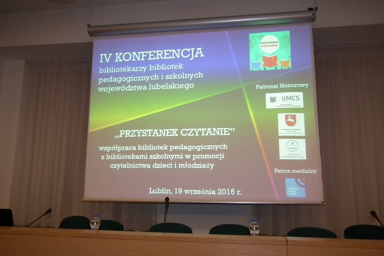 19 września 2016 roku w Sali Obrad Rady Wydziału Humanistycznego UMCS w Lublinie odbyła się IV Konferencja nauczycieli bibliotek pedagogicznych i szkolnych województwa lubelskiego. Spotkanie dotyczyło zagadnień ważnych dla środowiska bibliotekarskiego i nauczycielskiego, a także kwestii związanych z rolą bibliotek w edukacji. W tym roku obrady przebiegały pod hasłem „Przystanek czytanie – współpraca bibliotek pedagogicznych z bibliotekami szkolnymi w promocji czytelnictwa dzieci i młodzieży”.