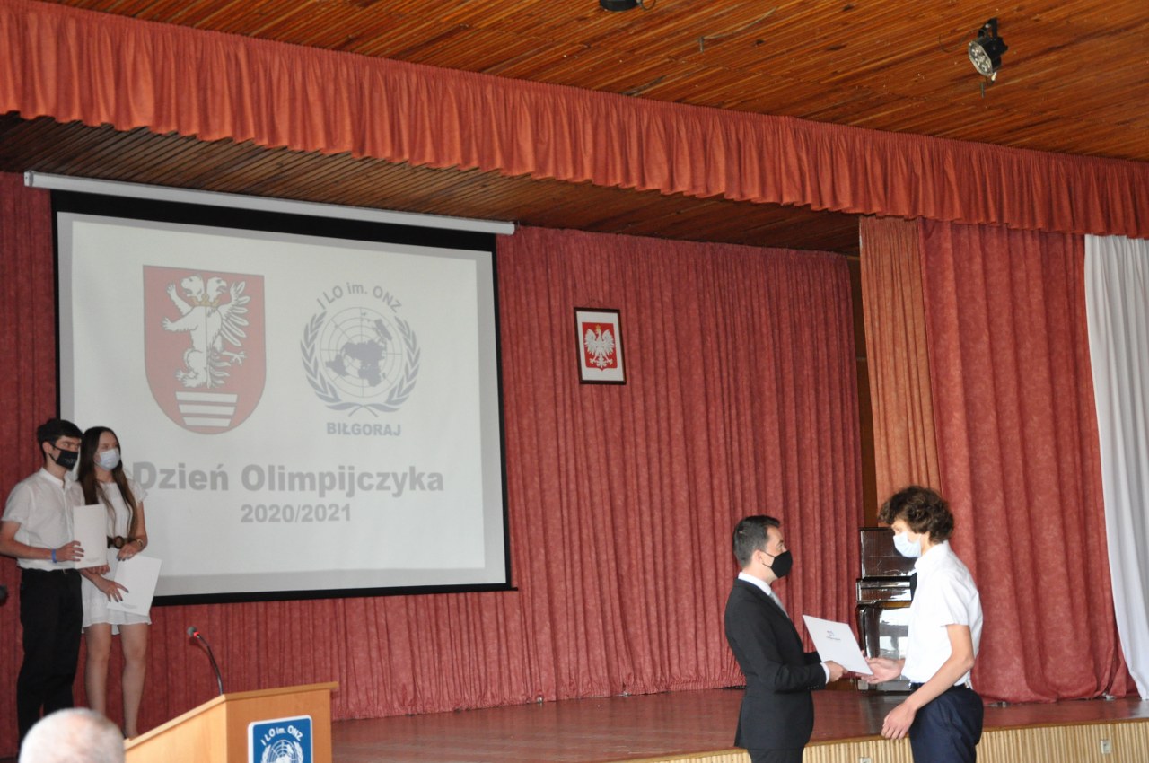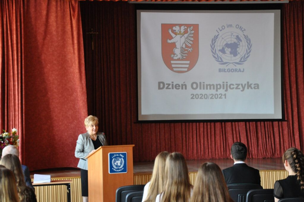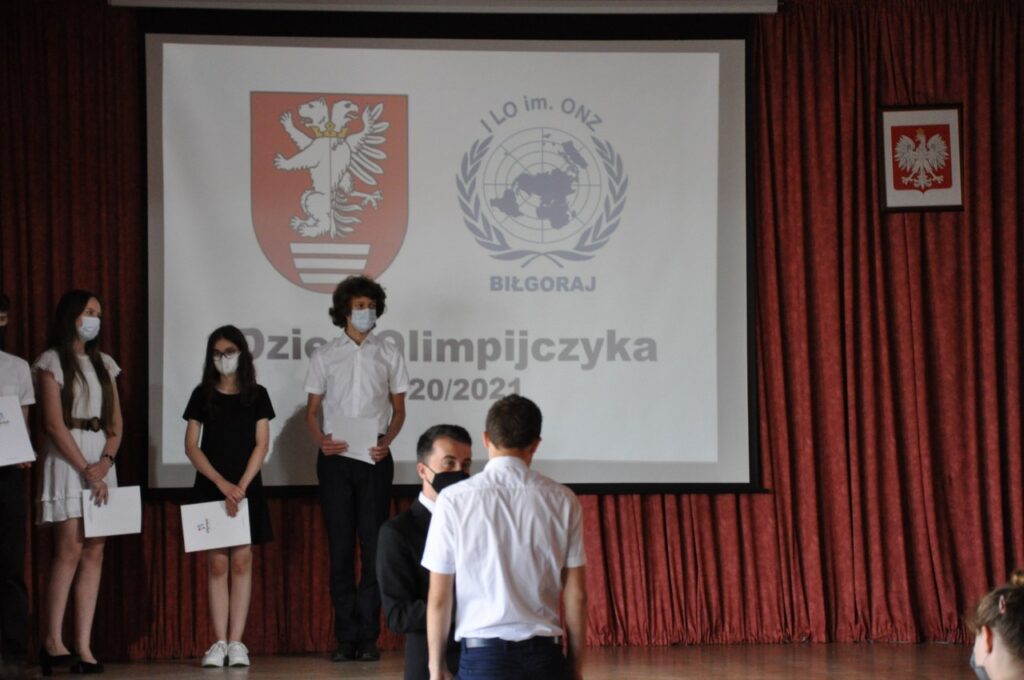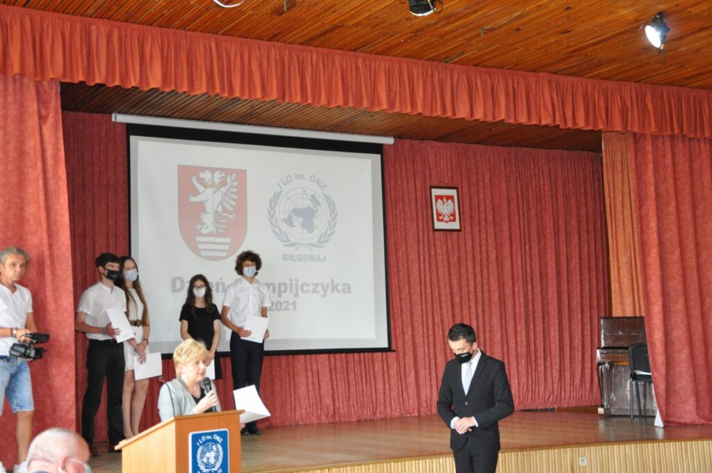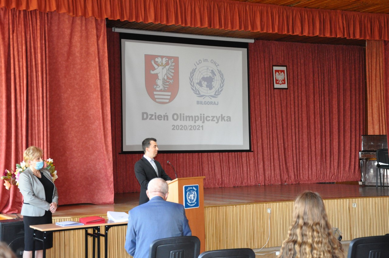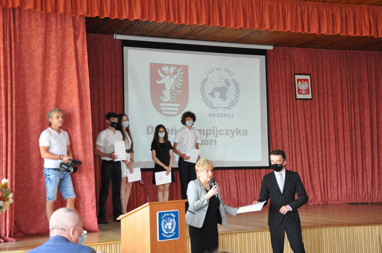 21 czerwca odbył się w auli naszej szkoły Dzień Olimpijczyka. Wzięli w nim udział: Starosta biłgorajski pan Andrzej Szarlip, kierownik Wydziału Oświaty, Kultury, Sportu i Turystyki Starostwa Powiatowego pan Jan Koman oraz uczniowie, którzy w roku szkolnym 2020/2021 osiągnęli sukcesy  w olimpiadach i konkursach przedmiotowych z opiekunami. Pan Starosta wręczył wyróżnionym licealistom listy gratulacyjne i karty  podarunkowe. Podziękował także nauczycielom za zaangażowanie i pracę włożoną w przygotowanie uczniów do olimpiad i konkursów oraz pomoc w rozwijaniu pasji i zainteresowań młodzieży. Podczas uroczystości wręczone zostały także stypendia Starosty Biłgorajskiego za bardzo dobre wyniki w nauce w I okresie roku szkolnego 2020/2021.