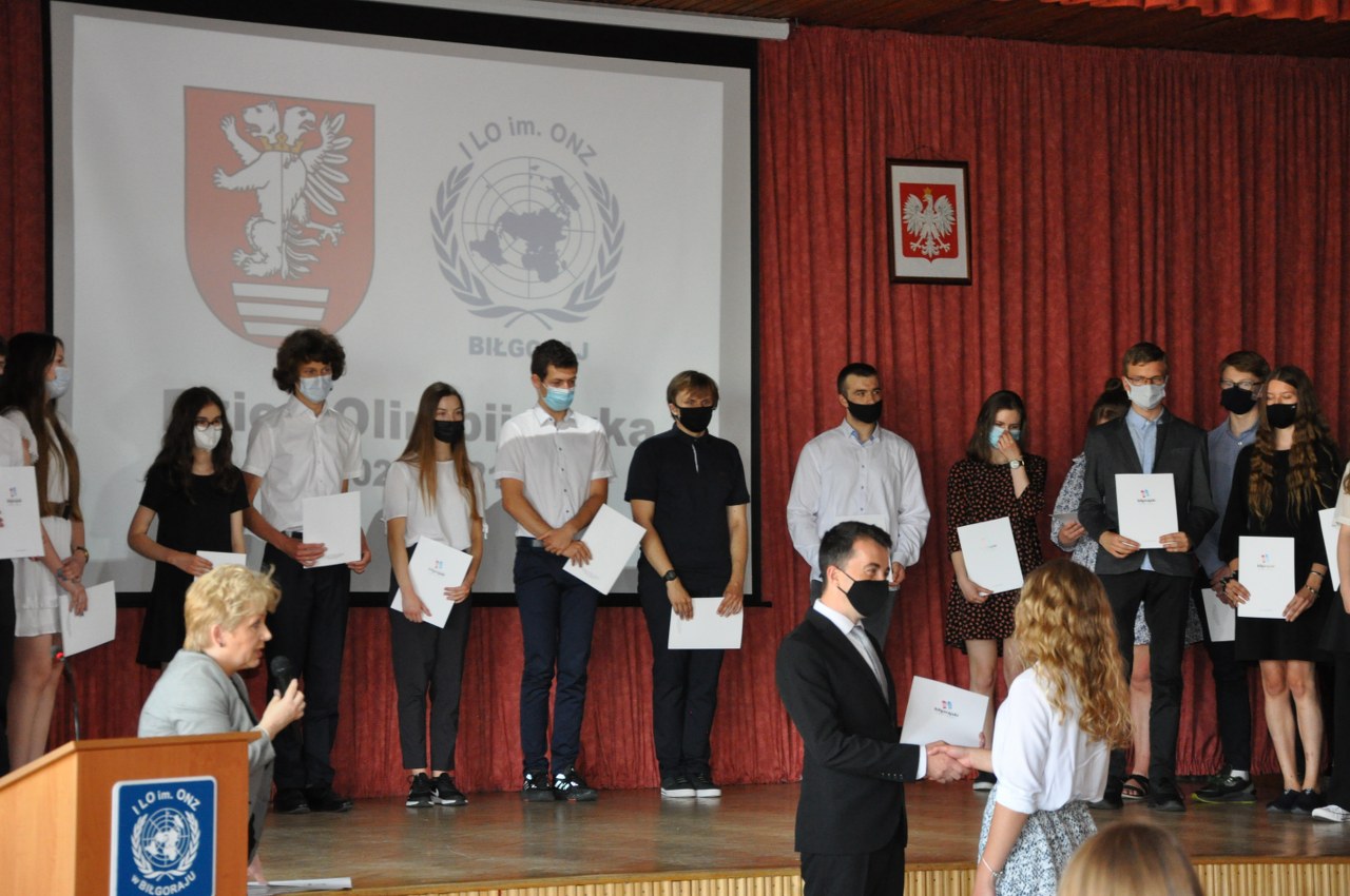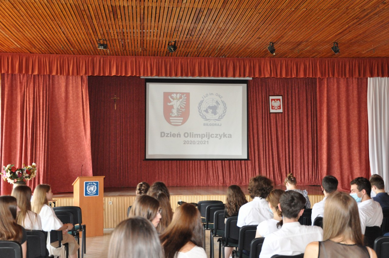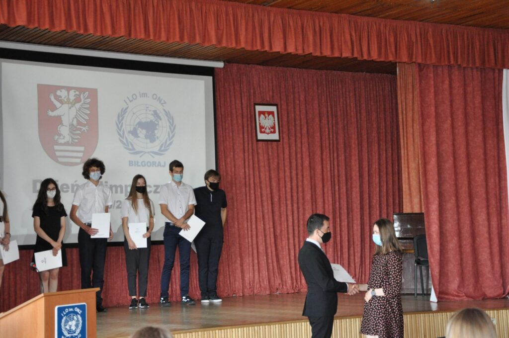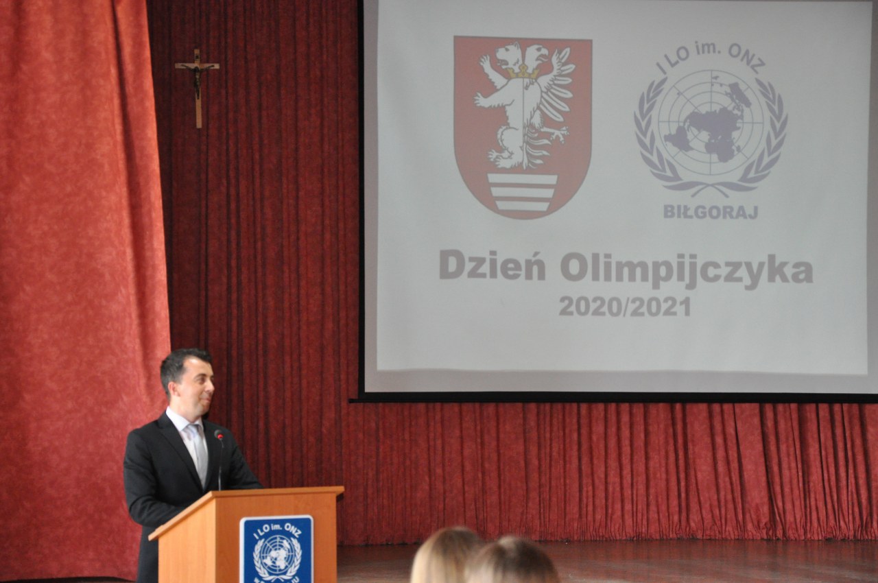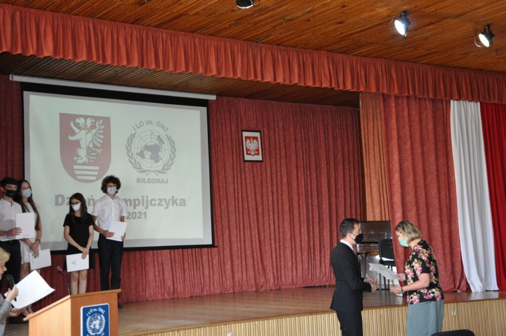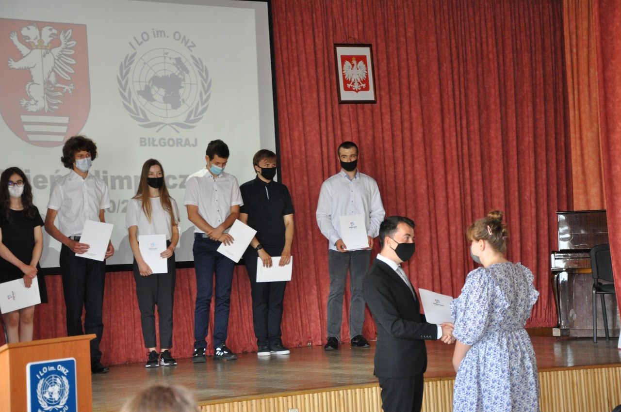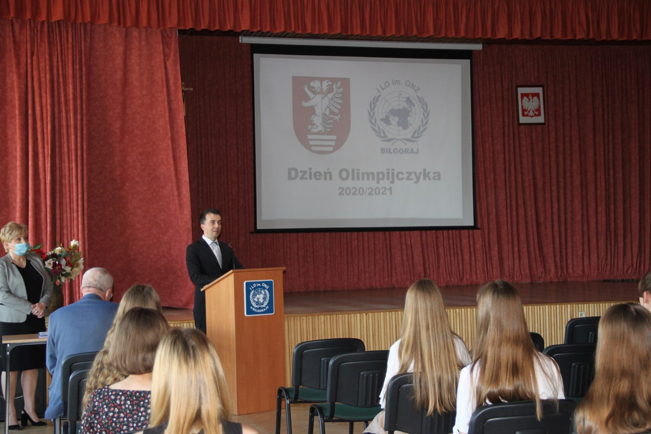 21 czerwca odbył się w auli naszej szkoły Dzień Olimpijczyka. Wzięli w nim udział: Starosta biłgorajski pan Andrzej Szarlip, kierownik Wydziału Oświaty, Kultury, Sportu i Turystyki Starostwa Powiatowego pan Jan Koman oraz uczniowie, którzy w roku szkolnym 2020/2021 osiągnęli sukcesy  w olimpiadach i konkursach przedmiotowych z opiekunami. Pan Starosta wręczył wyróżnionym licealistom listy gratulacyjne i karty  podarunkowe. Podziękował także nauczycielom za zaangażowanie i pracę włożoną w przygotowanie uczniów do olimpiad i konkursów oraz pomoc w rozwijaniu pasji i zainteresowań młodzieży. Podczas uroczystości wręczone zostały także stypendia Starosty Biłgorajskiego za bardzo dobre wyniki w nauce w I okresie roku szkolnego 2020/2021.