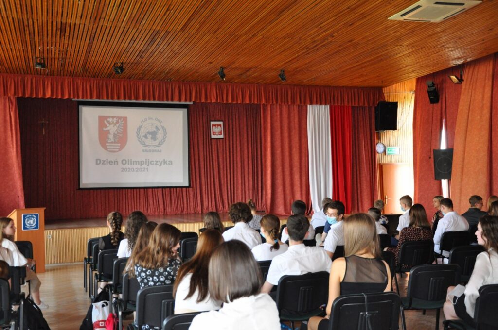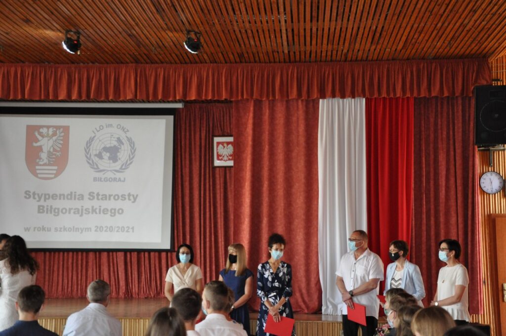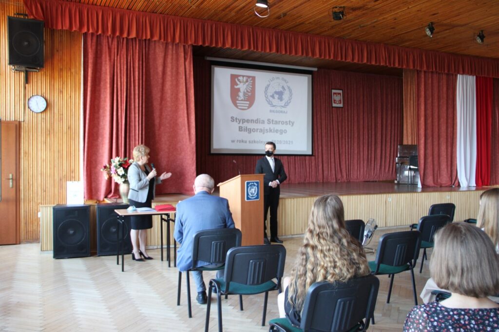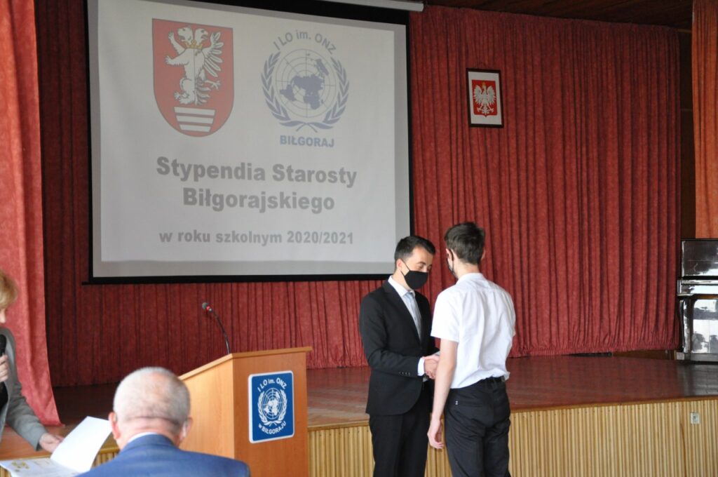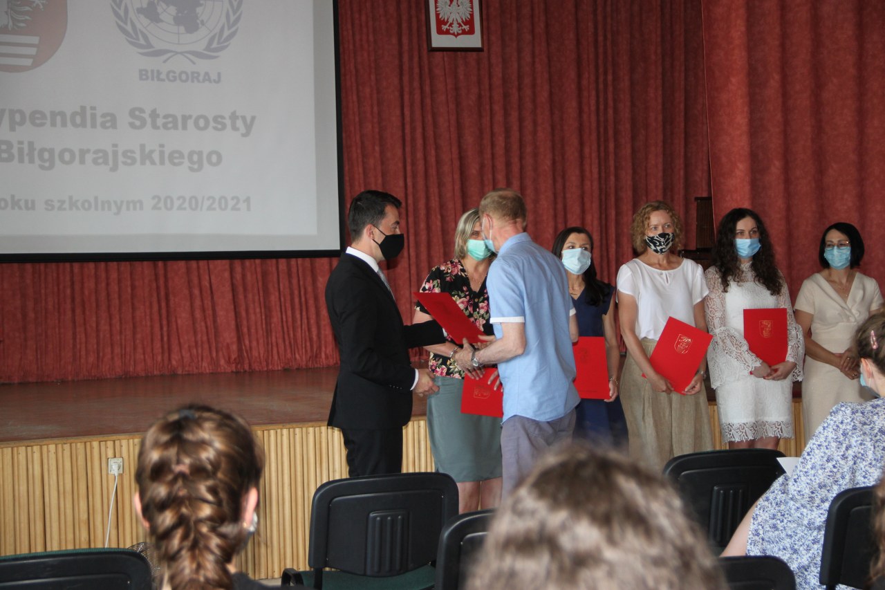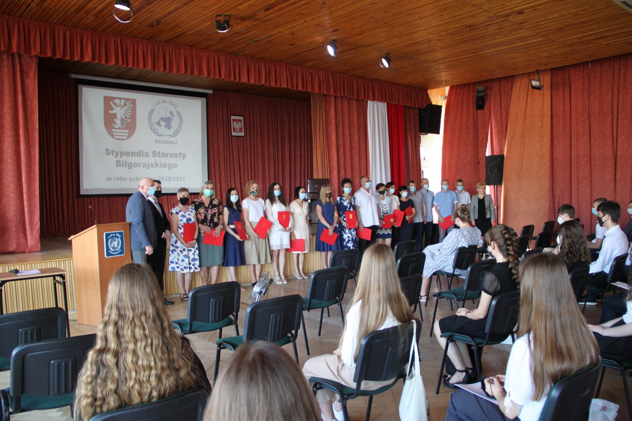 21 czerwca odbył się w auli naszej szkoły Dzień Olimpijczyka. Wzięli w nim udział: Starosta biłgorajski pan Andrzej Szarlip, kierownik Wydziału Oświaty, Kultury, Sportu i Turystyki Starostwa Powiatowego pan Jan Koman oraz uczniowie, którzy w roku szkolnym 2020/2021 osiągnęli sukcesy  w olimpiadach i konkursach przedmiotowych z opiekunami. Pan Starosta wręczył wyróżnionym licealistom listy gratulacyjne i karty  podarunkowe. Podziękował także nauczycielom za zaangażowanie i pracę włożoną w przygotowanie uczniów do olimpiad i konkursów oraz pomoc w rozwijaniu pasji i zainteresowań młodzieży. Podczas uroczystości wręczone zostały także stypendia Starosty Biłgorajskiego za bardzo dobre wyniki w nauce w I okresie roku szkolnego 2020/2021.