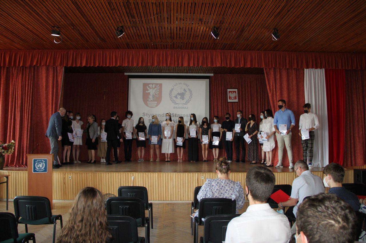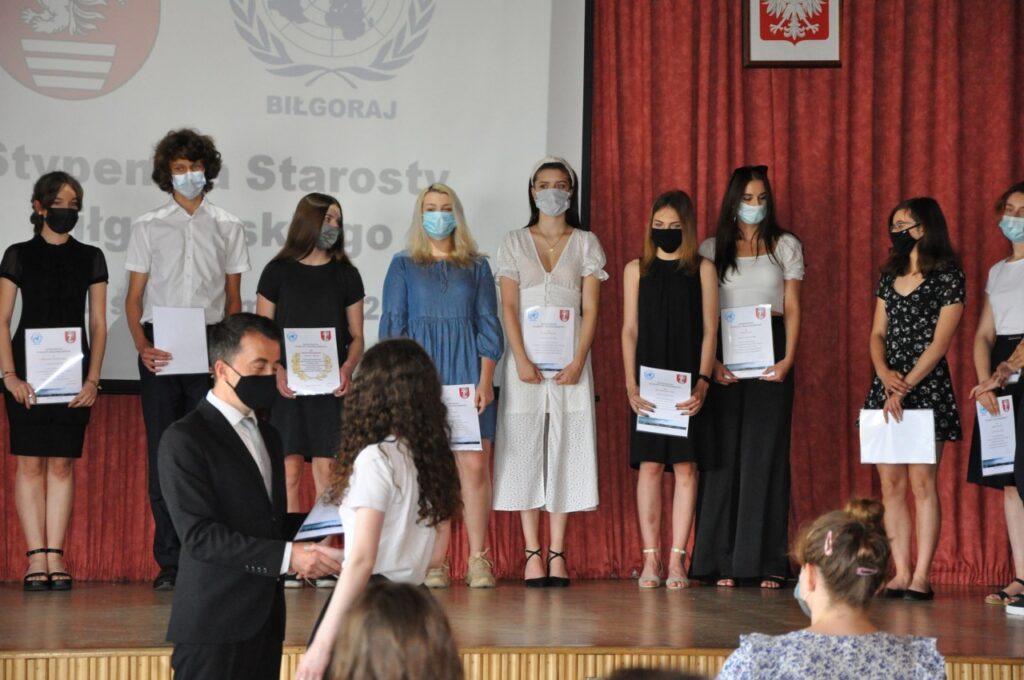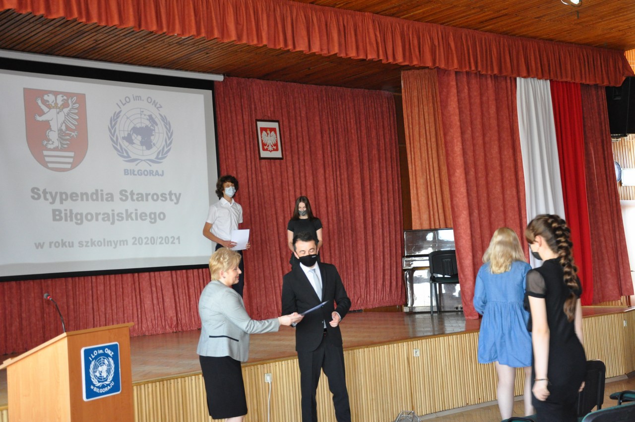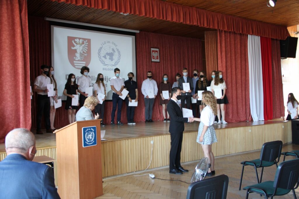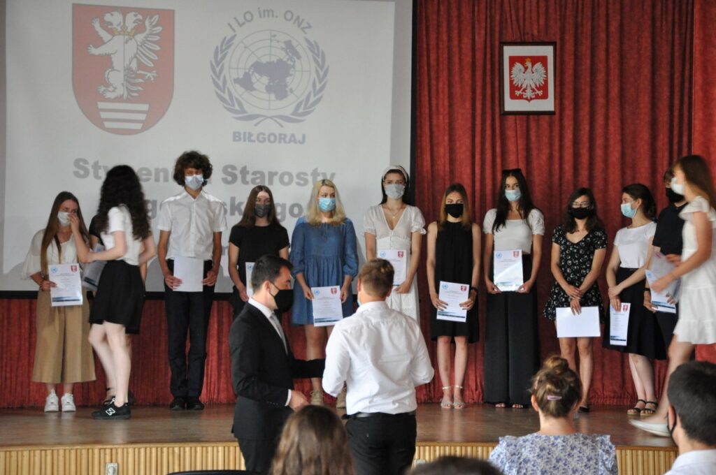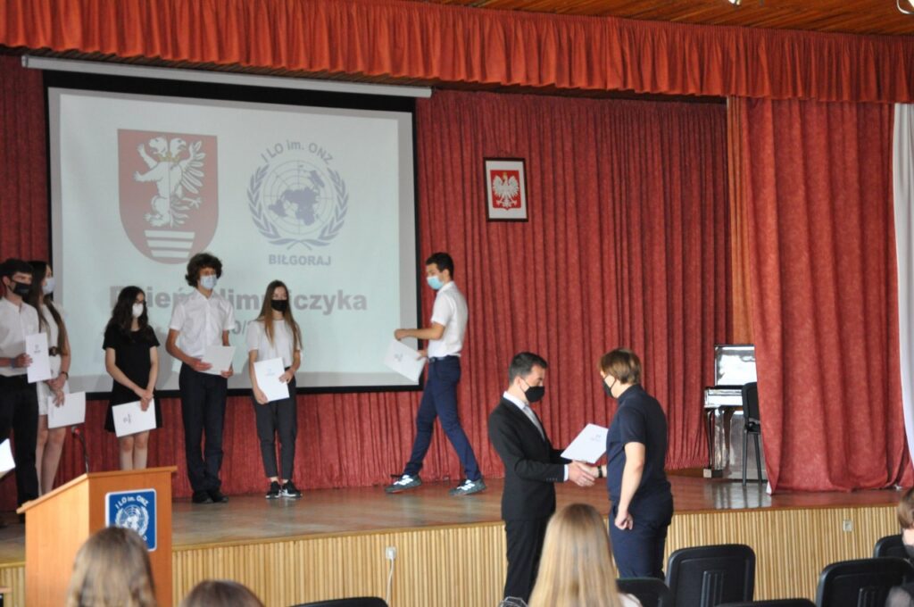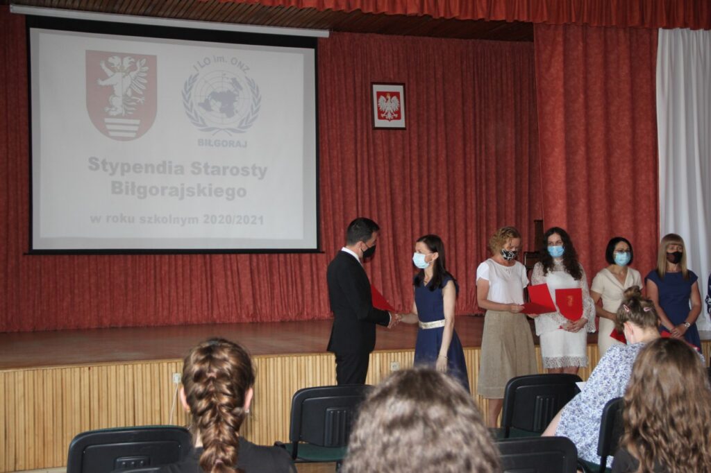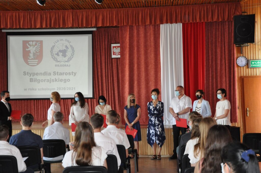 21 czerwca odbył się w auli naszej szkoły Dzień Olimpijczyka. Wzięli w nim udział: Starosta biłgorajski pan Andrzej Szarlip, kierownik Wydziału Oświaty, Kultury, Sportu i Turystyki Starostwa Powiatowego pan Jan Koman oraz uczniowie, którzy w roku szkolnym 2020/2021 osiągnęli sukcesy  w olimpiadach i konkursach przedmiotowych z opiekunami. Pan Starosta wręczył wyróżnionym licealistom listy gratulacyjne i karty  podarunkowe. Podziękował także nauczycielom za zaangażowanie i pracę włożoną w przygotowanie uczniów do olimpiad i konkursów oraz pomoc w rozwijaniu pasji i zainteresowań młodzieży. Podczas uroczystości wręczone zostały także stypendia Starosty Biłgorajskiego za bardzo dobre wyniki w nauce w I okresie roku szkolnego 2020/2021.