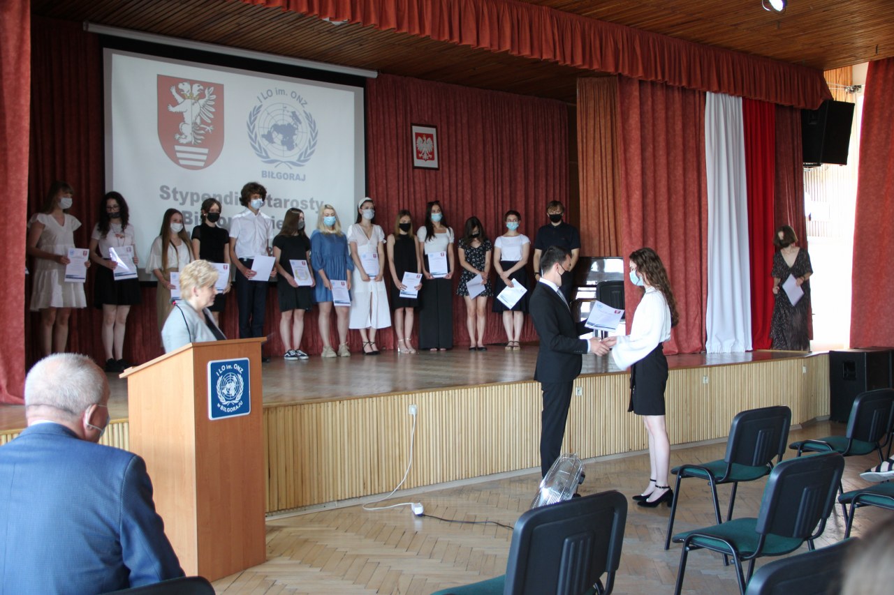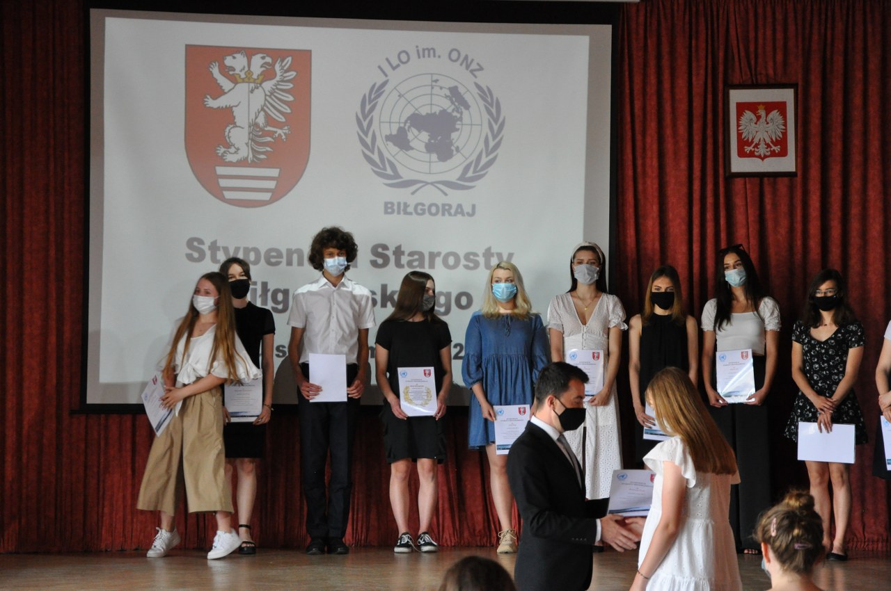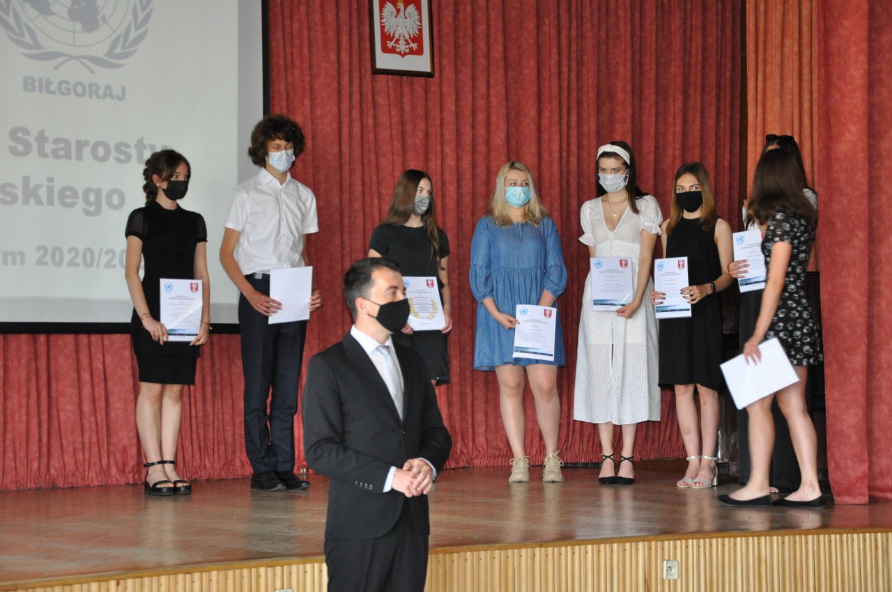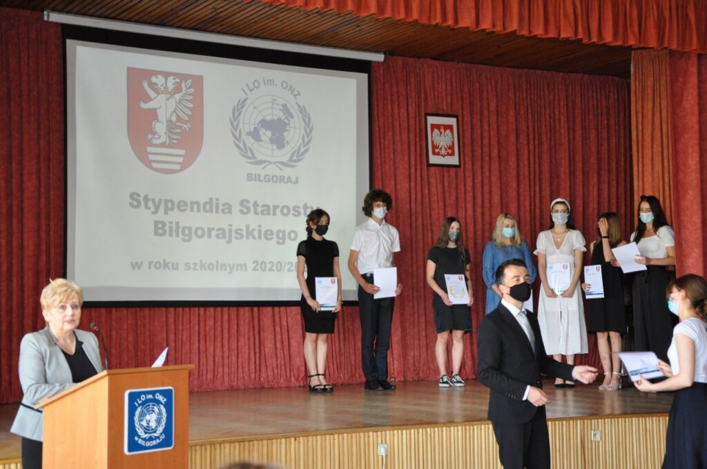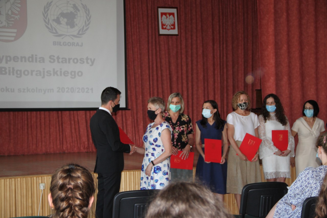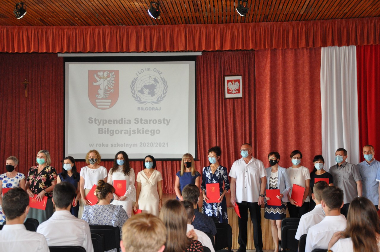 21 czerwca odbył się w auli naszej szkoły Dzień Olimpijczyka. Wzięli w nim udział: Starosta biłgorajski pan Andrzej Szarlip, kierownik Wydziału Oświaty, Kultury, Sportu i Turystyki Starostwa Powiatowego pan Jan Koman oraz uczniowie, którzy w roku szkolnym 2020/2021 osiągnęli sukcesy  w olimpiadach i konkursach przedmiotowych z opiekunami. Pan Starosta wręczył wyróżnionym licealistom listy gratulacyjne i karty  podarunkowe. Podziękował także nauczycielom za zaangażowanie i pracę włożoną w przygotowanie uczniów do olimpiad i konkursów oraz pomoc w rozwijaniu pasji i zainteresowań młodzieży. Podczas uroczystości wręczone zostały także stypendia Starosty Biłgorajskiego za bardzo dobre wyniki w nauce w I okresie roku szkolnego 2020/2021.