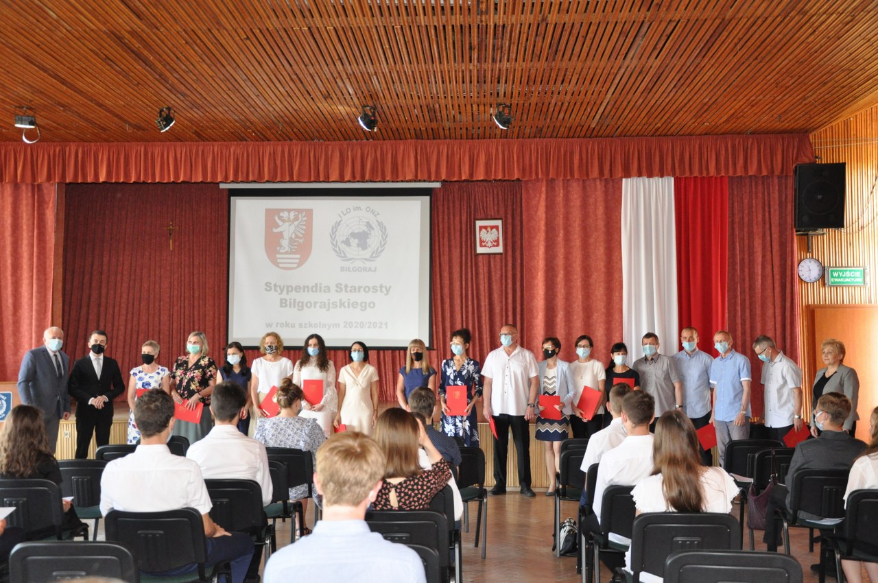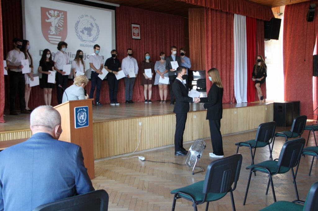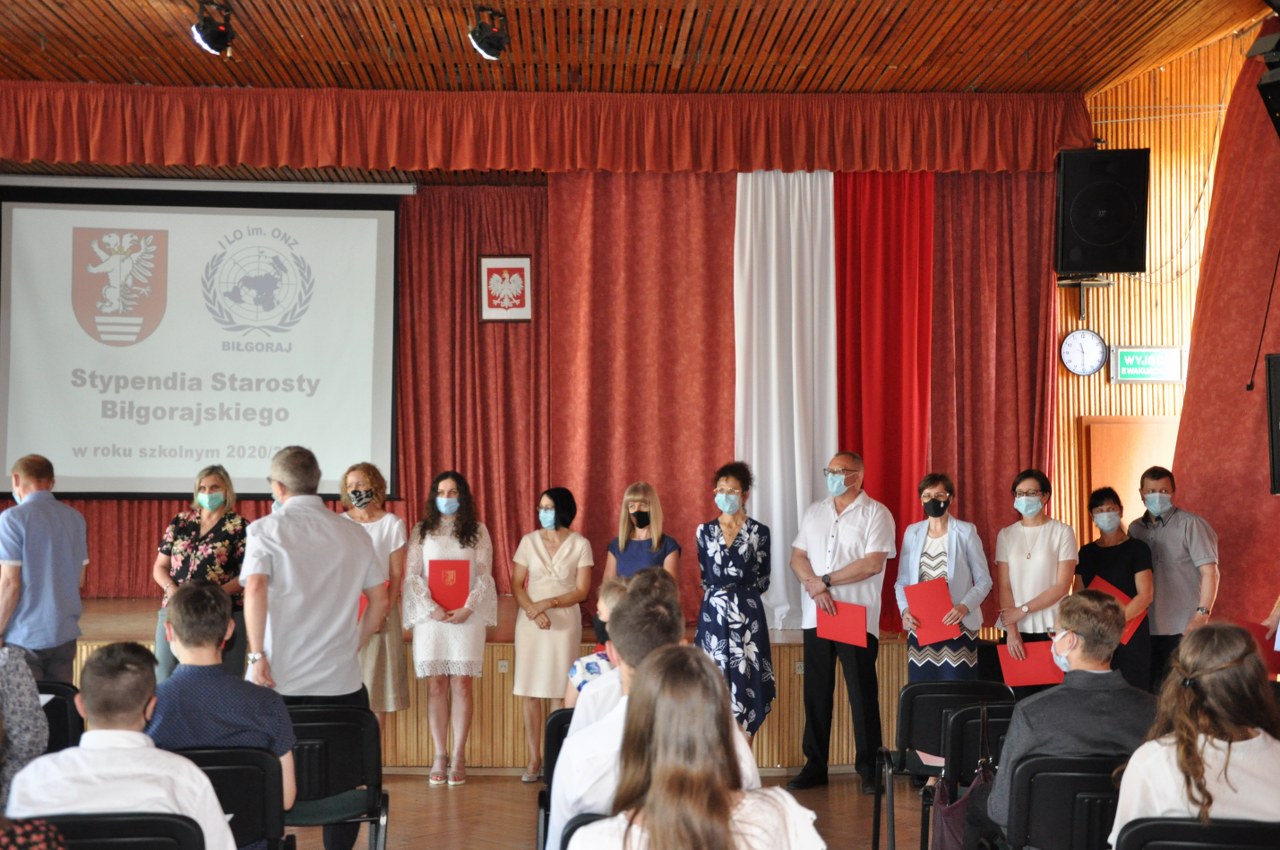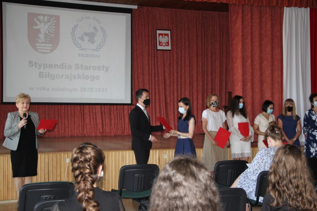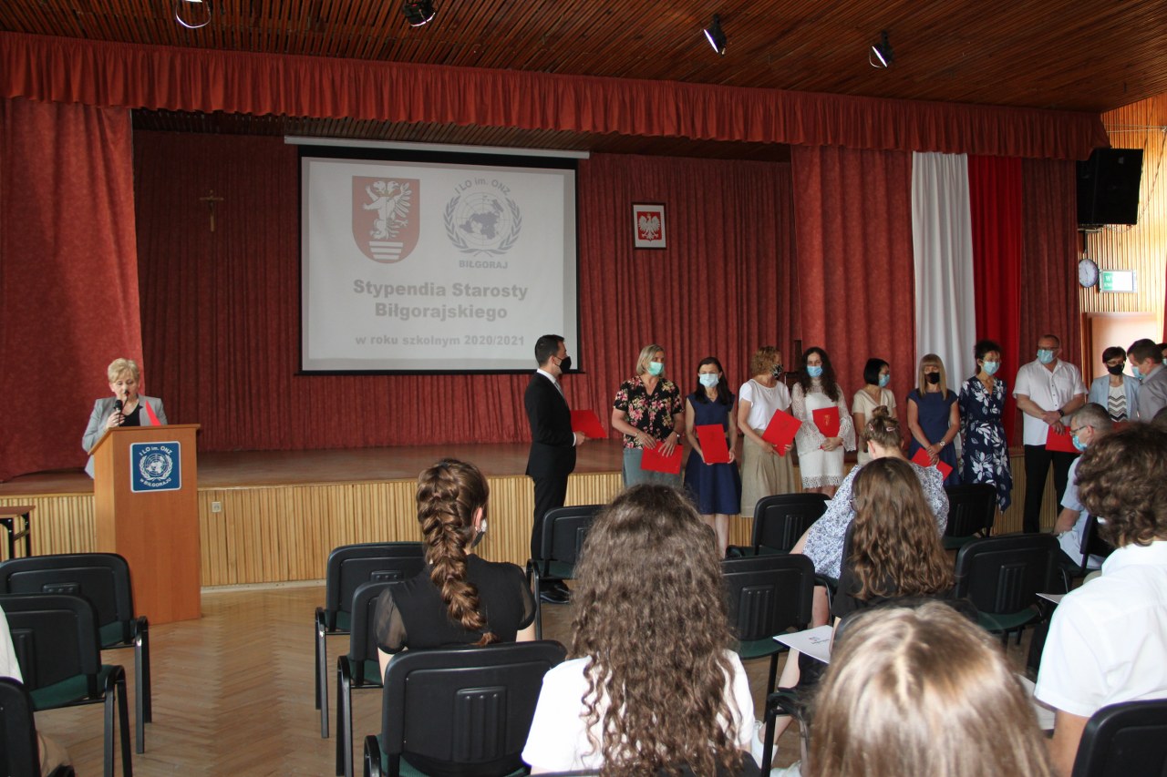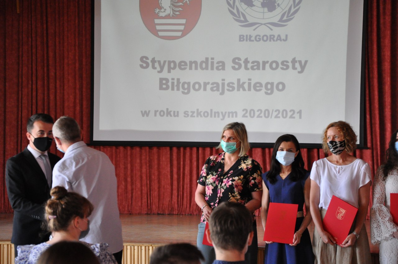 21 czerwca odbył się w auli naszej szkoły Dzień Olimpijczyka. Wzięli w nim udział: Starosta biłgorajski pan Andrzej Szarlip, kierownik Wydziału Oświaty, Kultury, Sportu i Turystyki Starostwa Powiatowego pan Jan Koman oraz uczniowie, którzy w roku szkolnym 2020/2021 osiągnęli sukcesy  w olimpiadach i konkursach przedmiotowych z opiekunami. Pan Starosta wręczył wyróżnionym licealistom listy gratulacyjne i karty  podarunkowe. Podziękował także nauczycielom za zaangażowanie i pracę włożoną w przygotowanie uczniów do olimpiad i konkursów oraz pomoc w rozwijaniu pasji i zainteresowań młodzieży. Podczas uroczystości wręczone zostały także stypendia Starosty Biłgorajskiego za bardzo dobre wyniki w nauce w I okresie roku szkolnego 2020/2021.