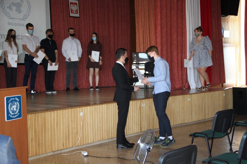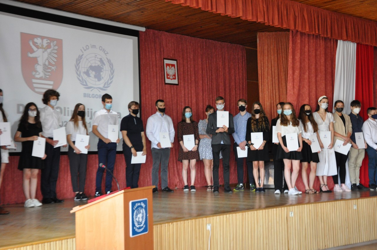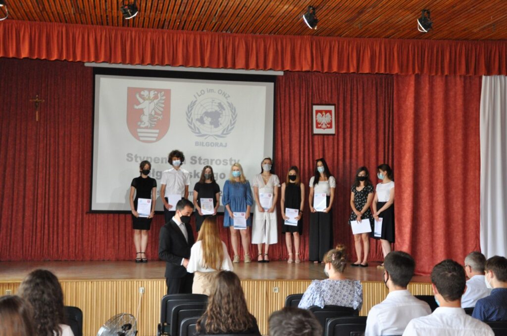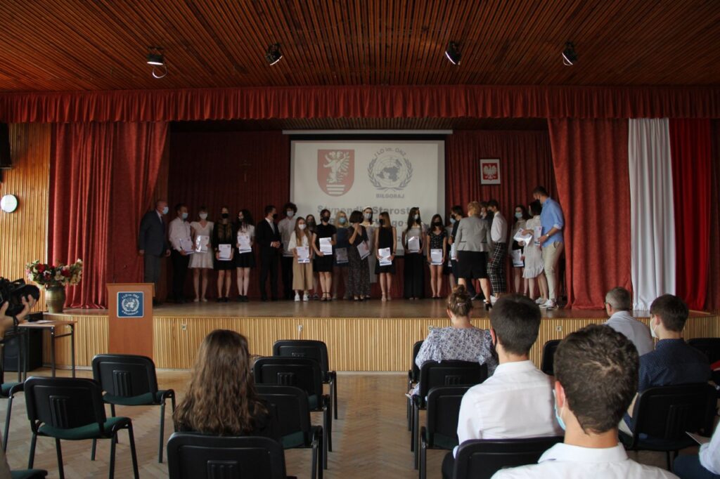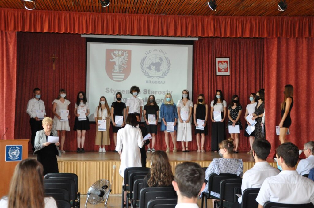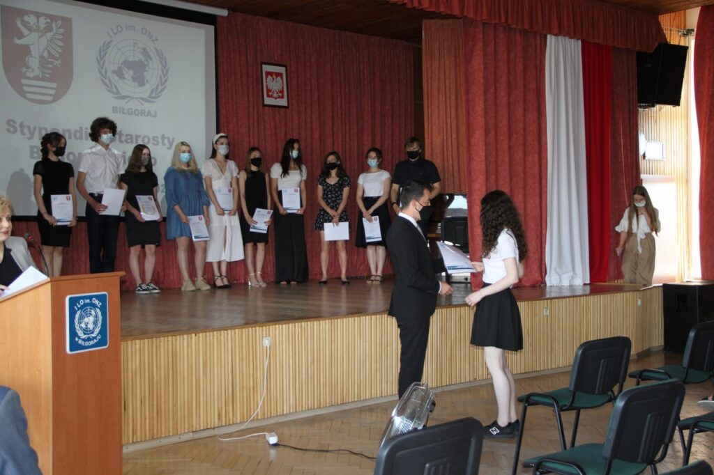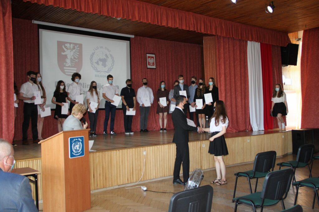 21 czerwca odbył się w auli naszej szkoły Dzień Olimpijczyka. Wzięli w nim udział: Starosta biłgorajski pan Andrzej Szarlip, kierownik Wydziału Oświaty, Kultury, Sportu i Turystyki Starostwa Powiatowego pan Jan Koman oraz uczniowie, którzy w roku szkolnym 2020/2021 osiągnęli sukcesy  w olimpiadach i konkursach przedmiotowych z opiekunami. Pan Starosta wręczył wyróżnionym licealistom listy gratulacyjne i karty  podarunkowe. Podziękował także nauczycielom za zaangażowanie i pracę włożoną w przygotowanie uczniów do olimpiad i konkursów oraz pomoc w rozwijaniu pasji i zainteresowań młodzieży. Podczas uroczystości wręczone zostały także stypendia Starosty Biłgorajskiego za bardzo dobre wyniki w nauce w I okresie roku szkolnego 2020/2021.