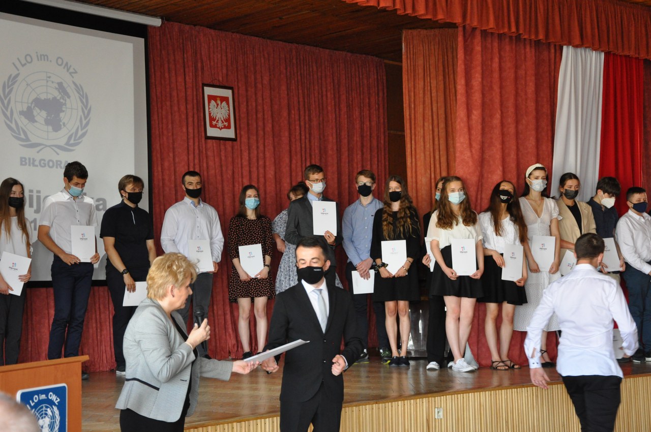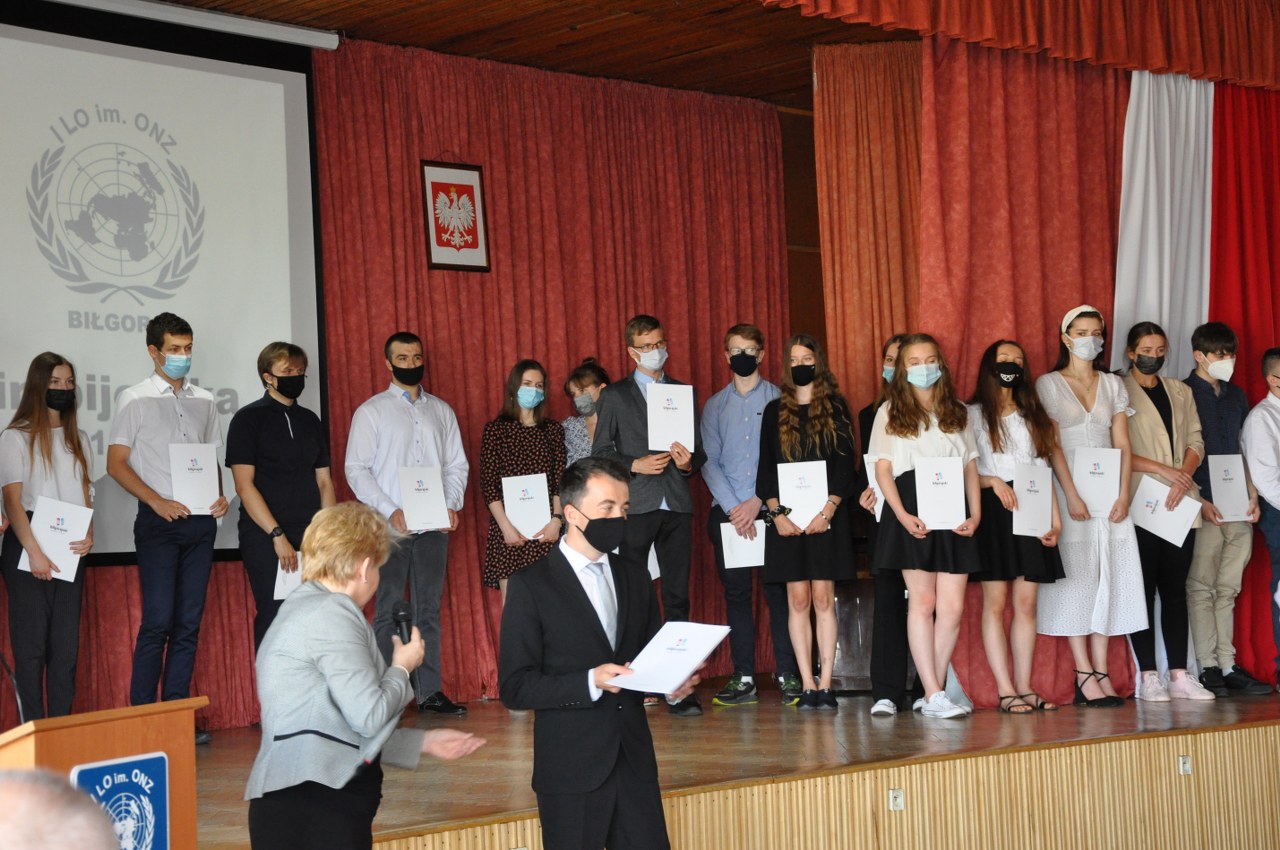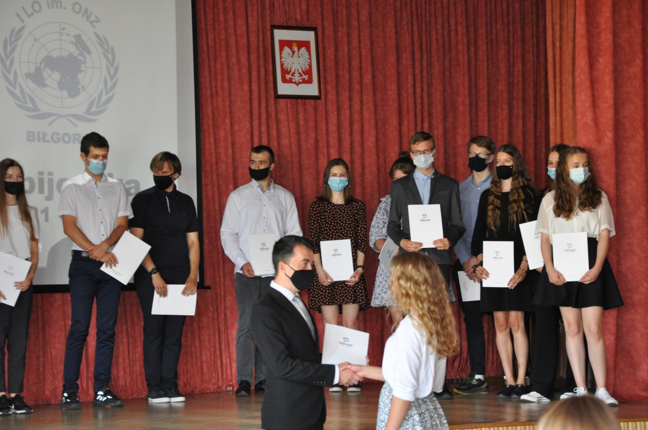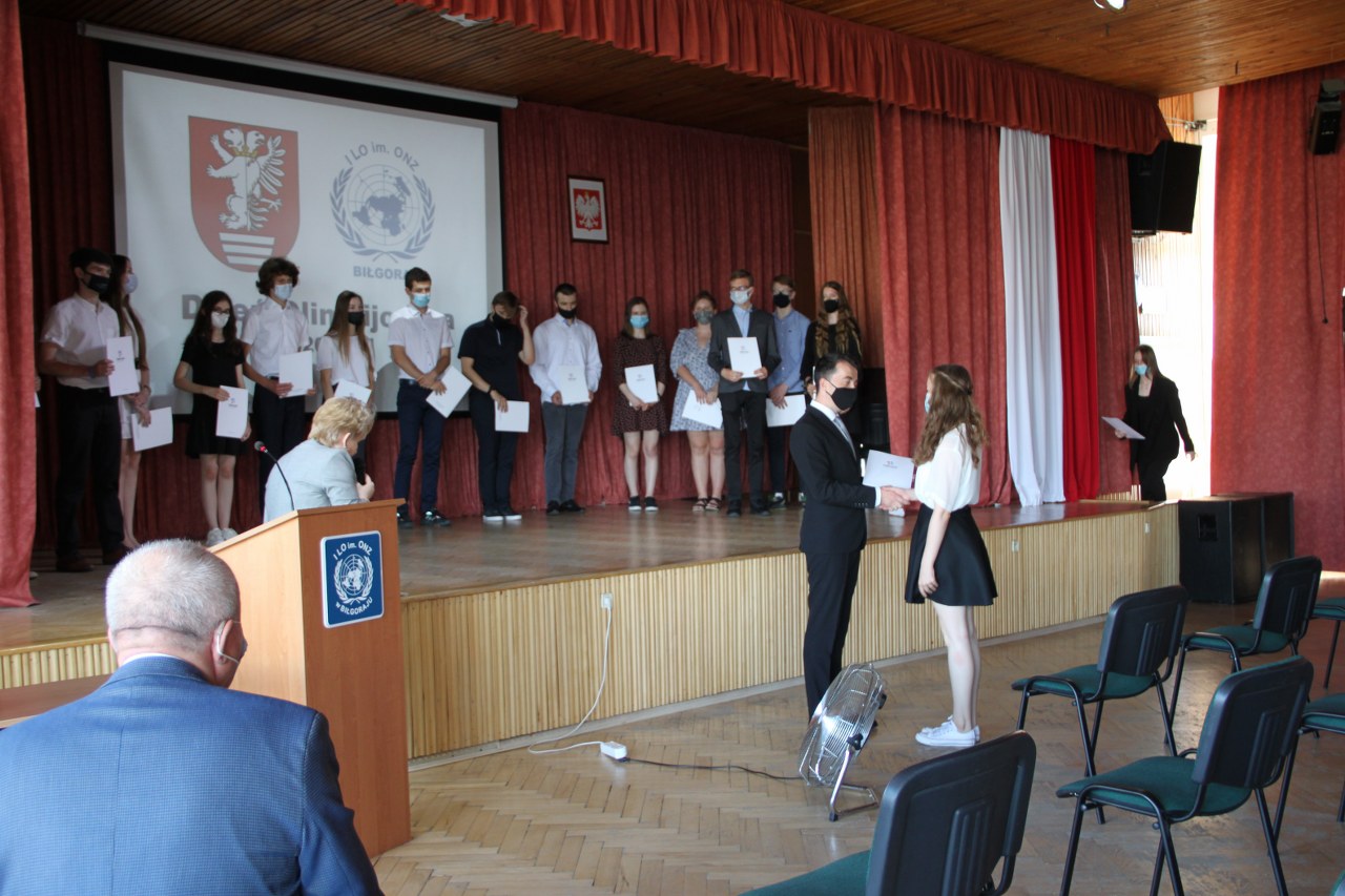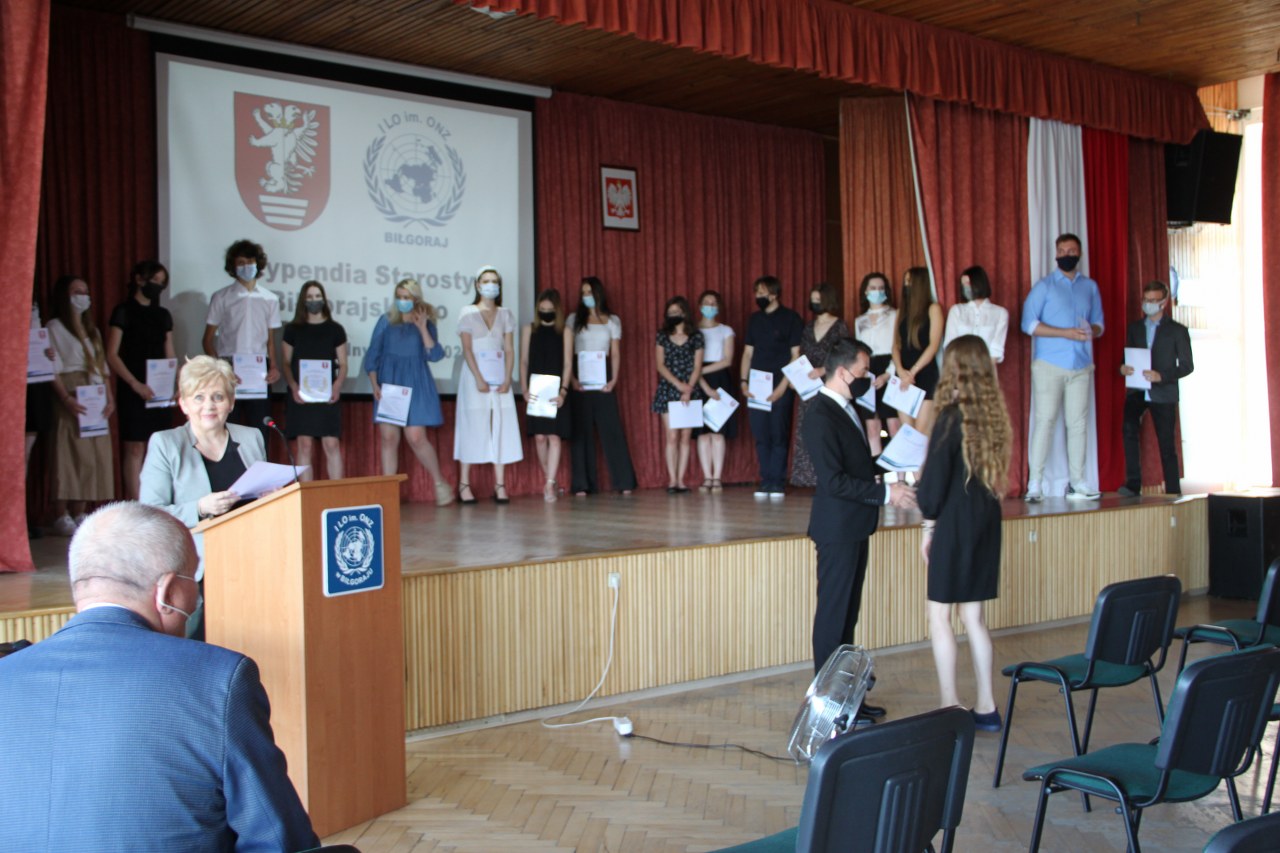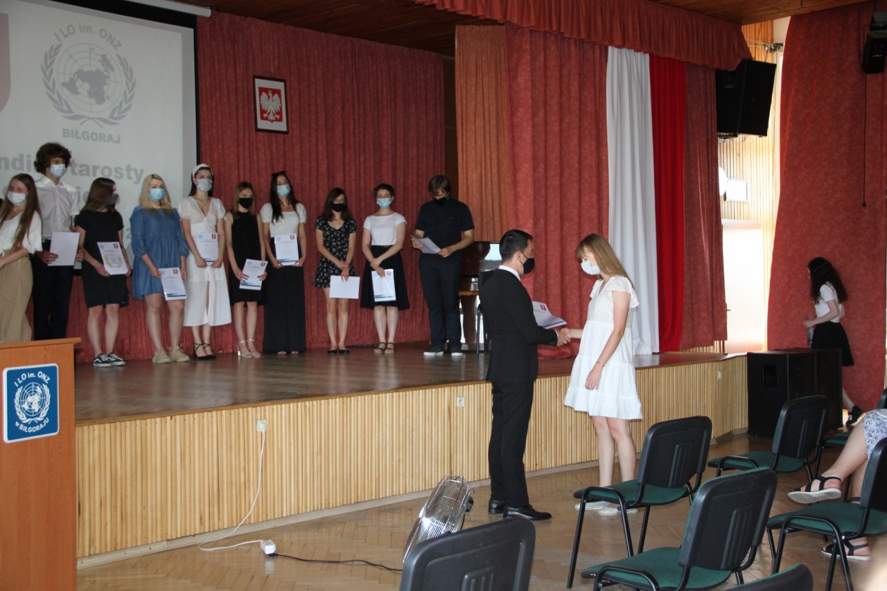 21 czerwca odbył się w auli naszej szkoły Dzień Olimpijczyka. Wzięli w nim udział: Starosta biłgorajski pan Andrzej Szarlip, kierownik Wydziału Oświaty, Kultury, Sportu i Turystyki Starostwa Powiatowego pan Jan Koman oraz uczniowie, którzy w roku szkolnym 2020/2021 osiągnęli sukcesy  w olimpiadach i konkursach przedmiotowych z opiekunami. Pan Starosta wręczył wyróżnionym licealistom listy gratulacyjne i karty  podarunkowe. Podziękował także nauczycielom za zaangażowanie i pracę włożoną w przygotowanie uczniów do olimpiad i konkursów oraz pomoc w rozwijaniu pasji i zainteresowań młodzieży. Podczas uroczystości wręczone zostały także stypendia Starosty Biłgorajskiego za bardzo dobre wyniki w nauce w I okresie roku szkolnego 2020/2021.