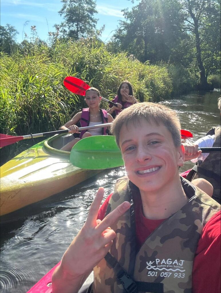 ​22 września 2025 r. uczestniczyliśmy w spływie kajakowym po rzece Wieprz na trasie Obrocz – Zwierzyniec. Przepiękna słoneczna pogoda sprawiła, że poczuliśmy jeszcze odrobinę lata w pierwszym dniu astronomicznej jesieni. Kręta, na szczęście dość płytka rzeka, była pełna wyzwań w postaci mielizn oraz wystających konarów. Podczas spływu obserwowaliśmy wspaniałą przyrodę – przybrzeżne rośliny oraz zwierzęta. Obok nas płynęły kaczki, a na końcu trasy na zalewie Rudka spotkaliśmy rodzinę łabędzi. Wyprawę zakończyliśmy wspólnym posiłkiem przy ognisku.​