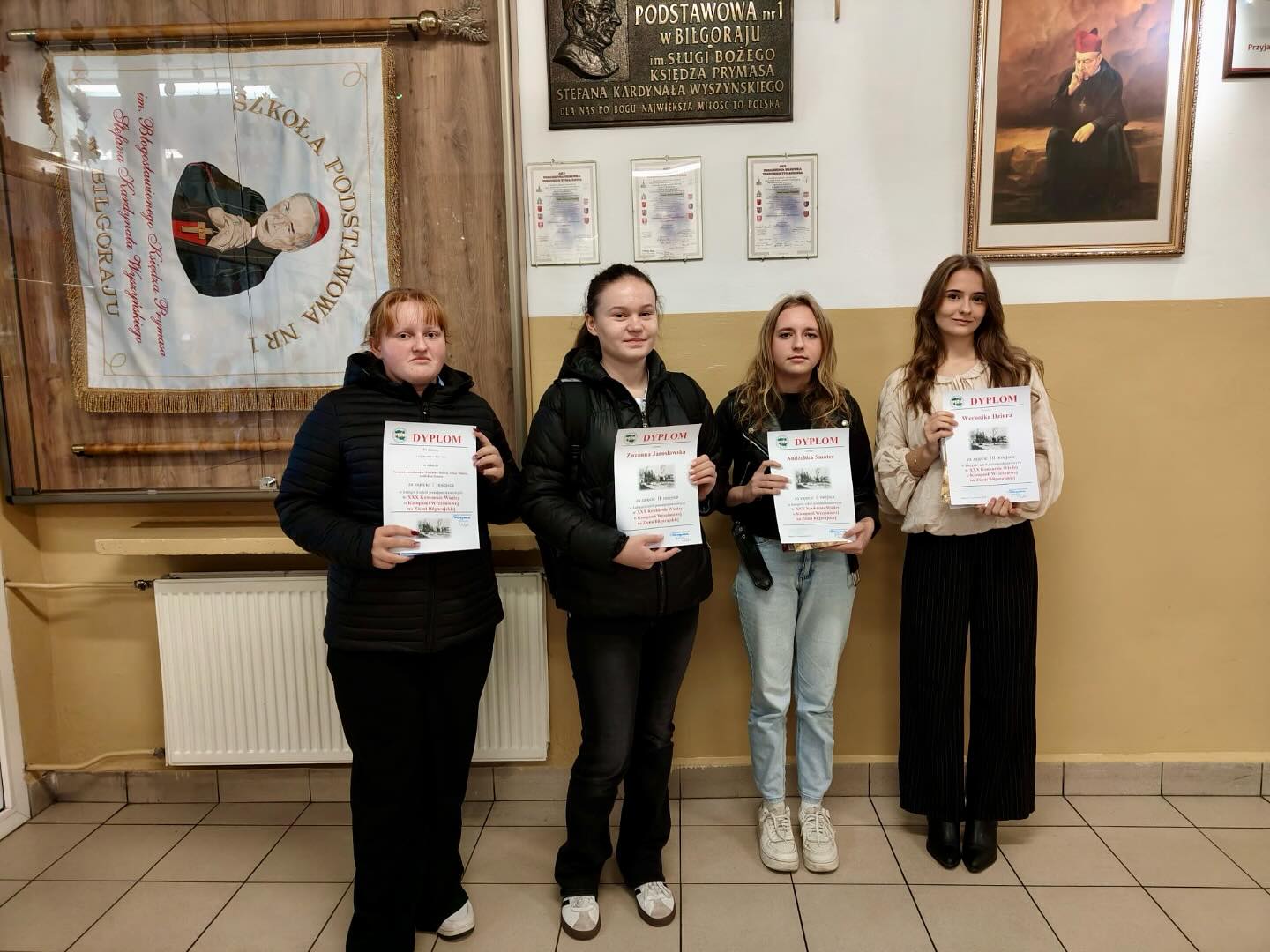 admin 5 miesięcy temu Konkursy , Organizacyjne , OsiągnięciaNasze licealistki odniosły sukcesy w XXX Konkursie Wiedzy o Kampanii Wrześniowej na Ziemi Biłgorajskiej, który odbył się 23 października 2025 roku w Szkole Podstawowej nr 1 w Biłgoraju. W kategorii szkół ponadpodstawowych drużyna w składzie: Weronika Dziura, Alicja Małysz, Zuzanna Jarosławska, Andżelika Smoter zajęła I miejsce. Indywidualnie najwyższą liczbę punktów zdobyła Andżelika Smoter i zwyciężyła w rywalizacji konkursowej, Zuzanna Jarosławska uplasowała się na II miejscu, a Weronika Dziura zajęła III miejsce.