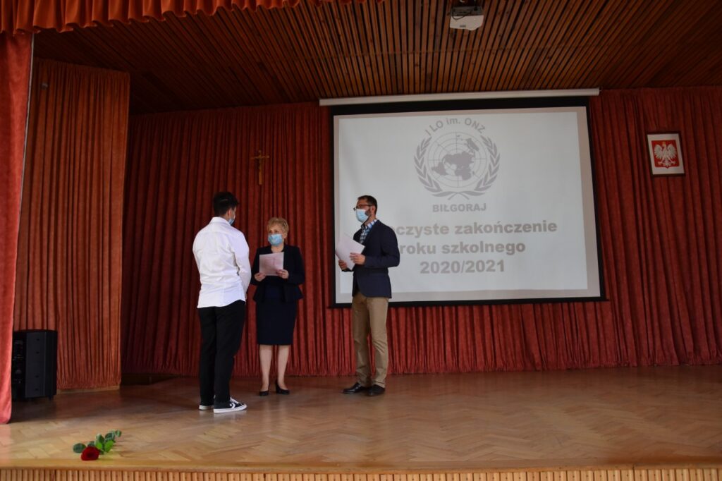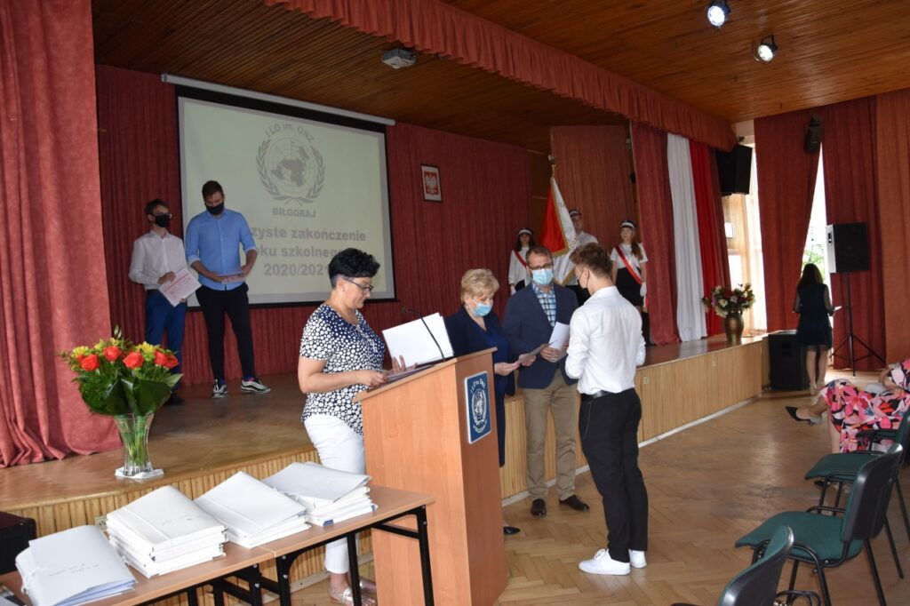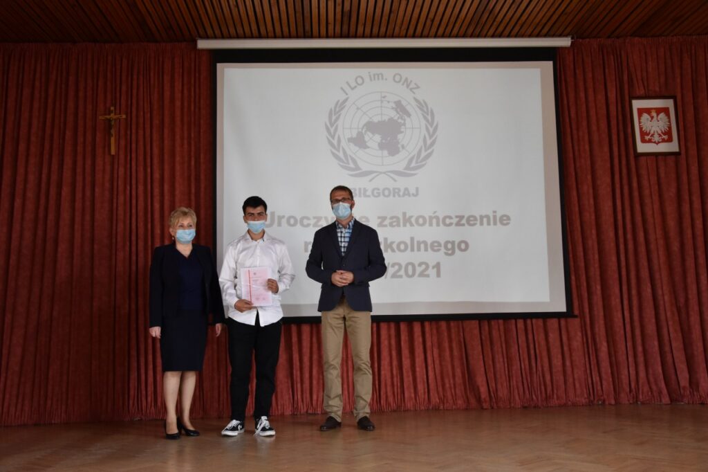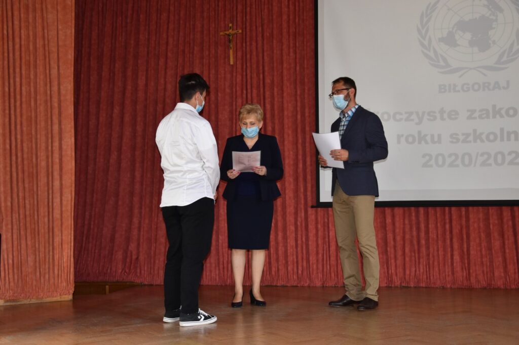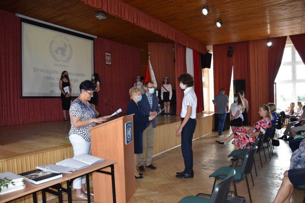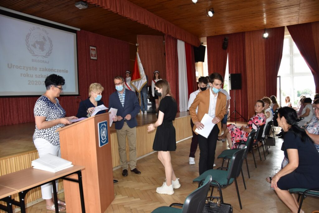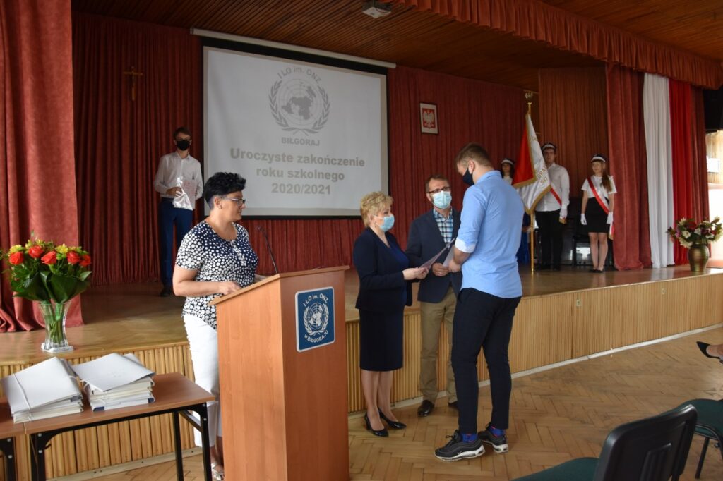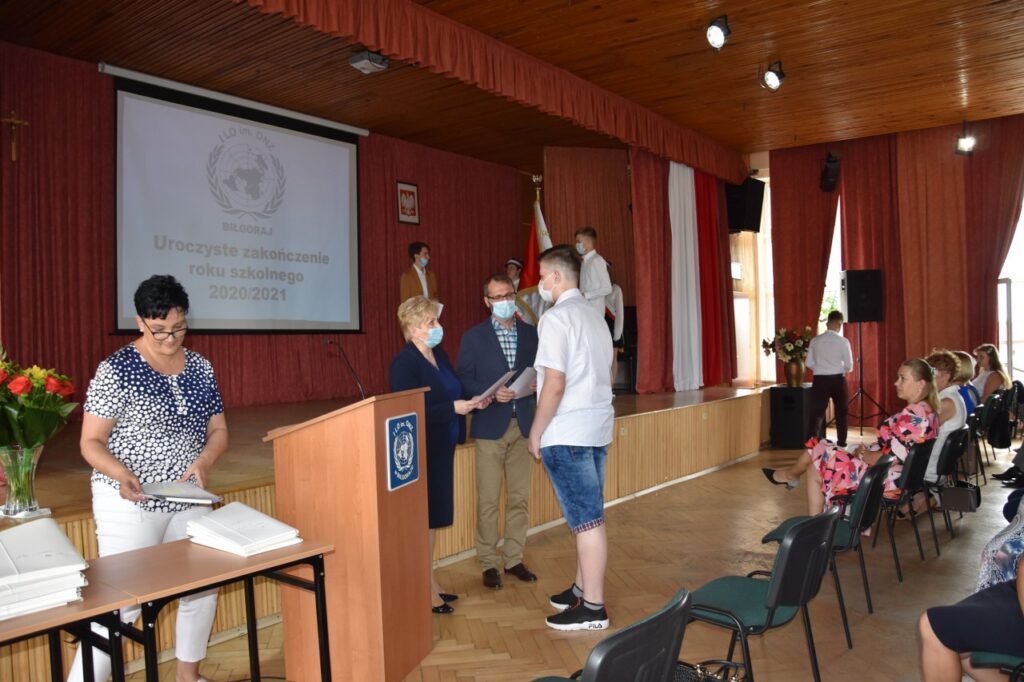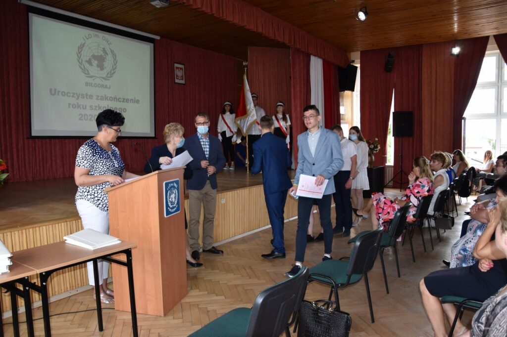 admin 5 lat temu Bez kategorii , Organizacyjne , Uroczystości25 czerwca 2021 roku odbyło się uroczyste zakończenie roku szkolnego. Ze względu na pandemię do auli szkoły zostali zaproszeni tylko ci uczniowie, którzy uzyskali najwyższe wyniki w nauce i 100% frekwencję. Najlepsi licealiści otrzymali świadectwa z czerwonym paskiem, Listy Gratulacyjne i karty podarunkowe. Dodatkową nagrodę przekazaną przez jedną z biłgorajskich firm otrzymał wyróżniający się uczeń szkoły – Piotr Łaba. Zostały również odczytane listy z podziękowaniami i życzeniami skierowane do dyrekcji, nauczycieli i uczniów przesłane przez Lubelskiego Kuratora Oświaty oraz Starostę Biłgorajskiego.