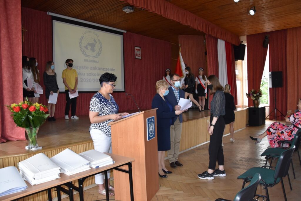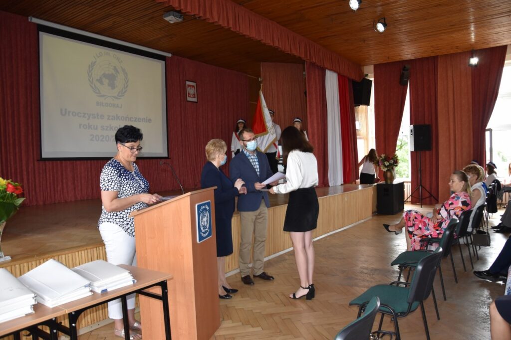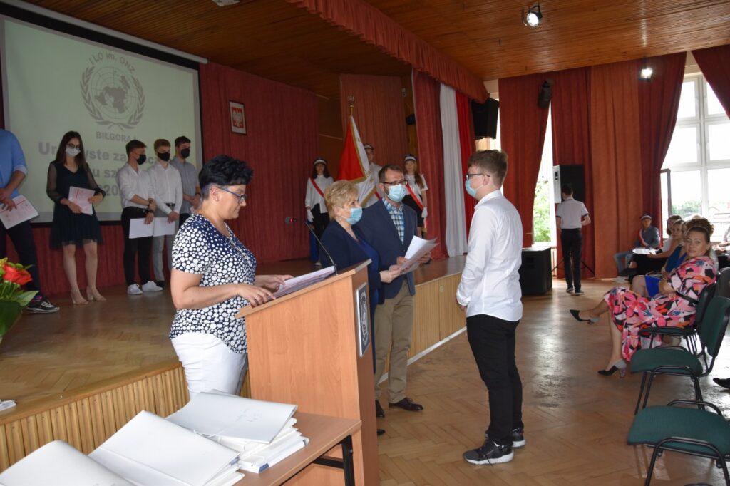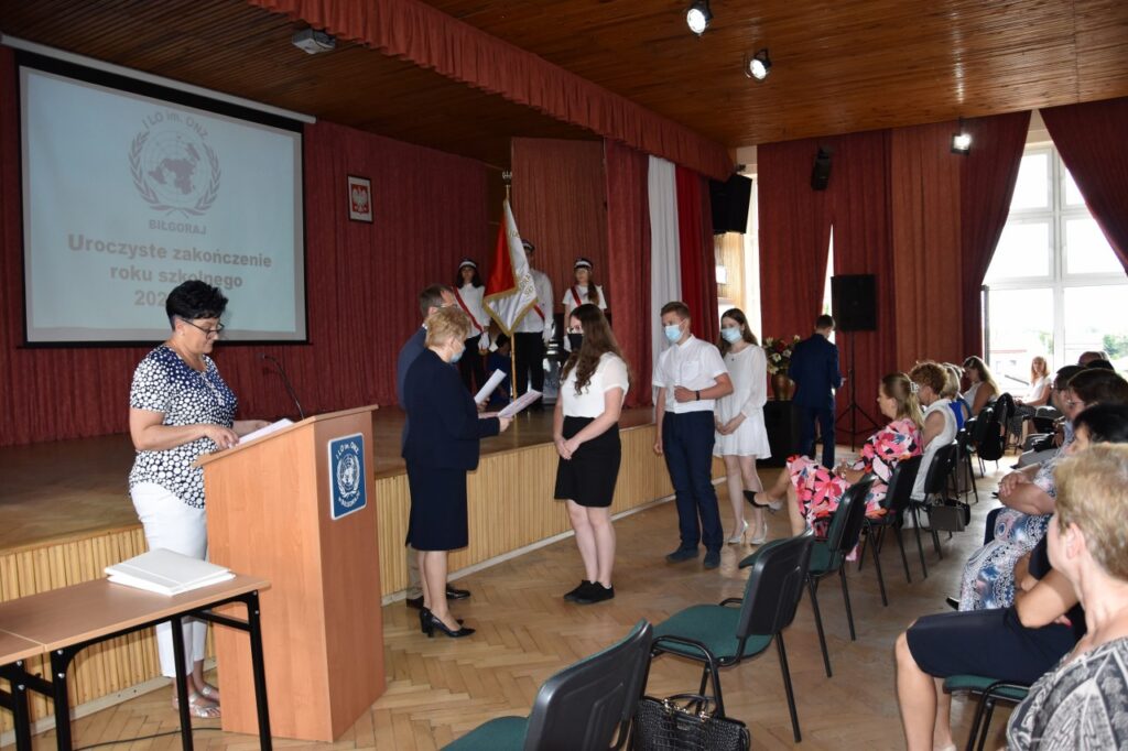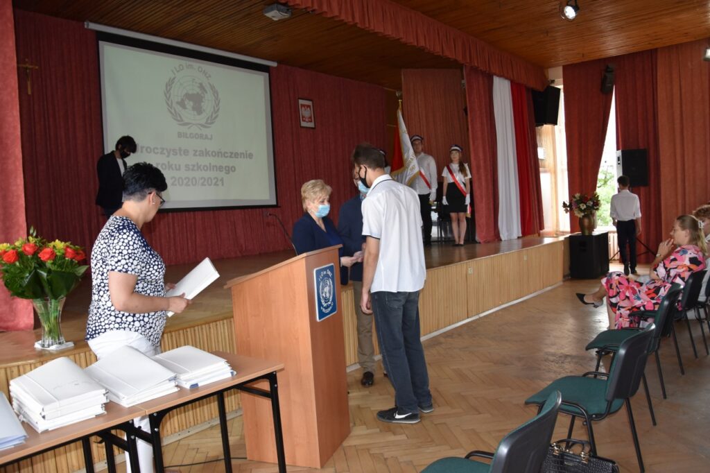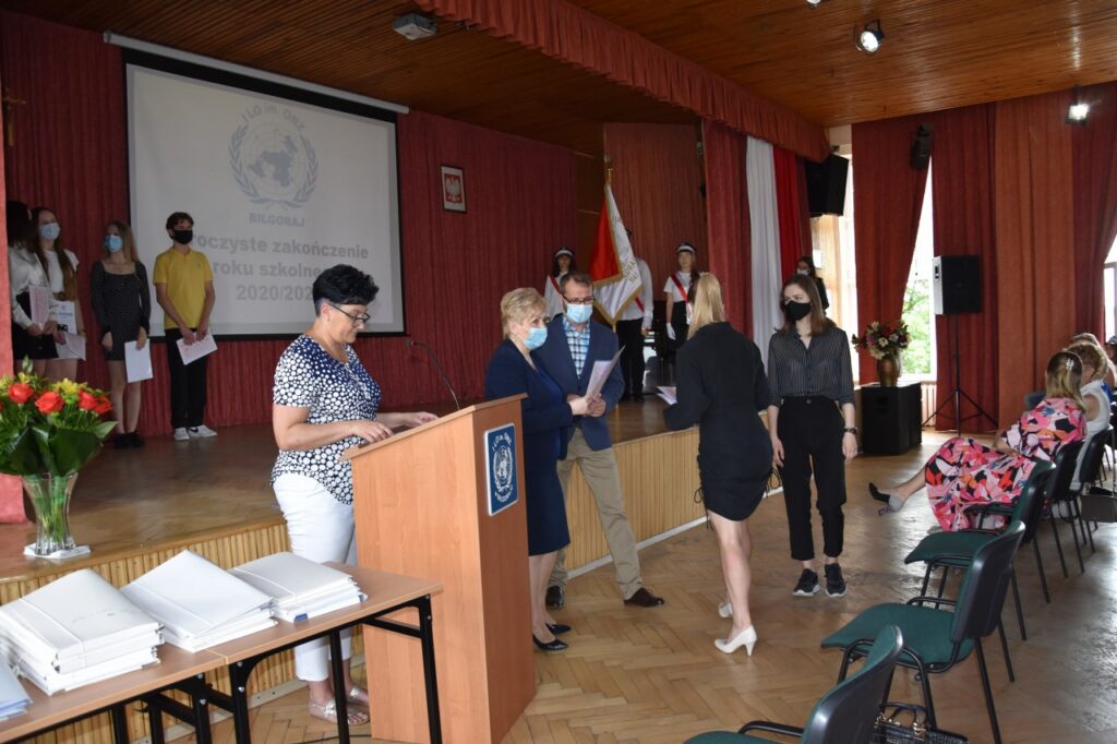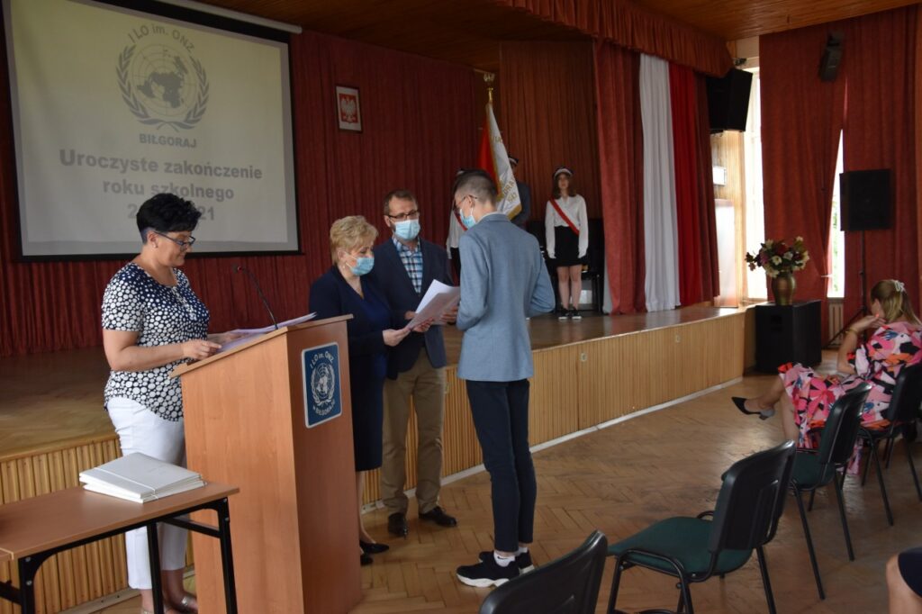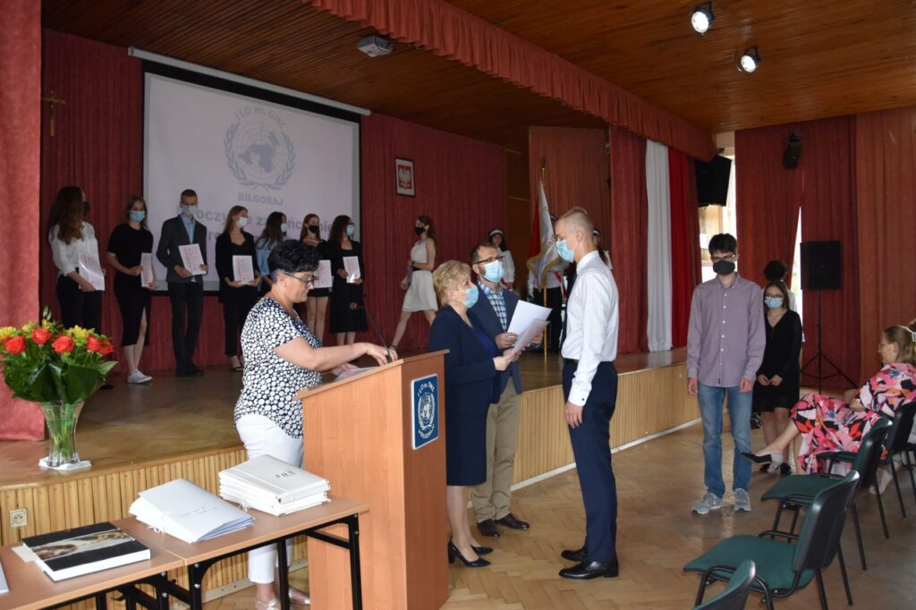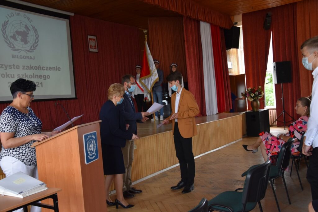 admin 5 lat temu Bez kategorii , Organizacyjne , Uroczystości25 czerwca 2021 roku odbyło się uroczyste zakończenie roku szkolnego. Ze względu na pandemię do auli szkoły zostali zaproszeni tylko ci uczniowie, którzy uzyskali najwyższe wyniki w nauce i 100% frekwencję. Najlepsi licealiści otrzymali świadectwa z czerwonym paskiem, Listy Gratulacyjne i karty podarunkowe. Dodatkową nagrodę przekazaną przez jedną z biłgorajskich firm otrzymał wyróżniający się uczeń szkoły – Piotr Łaba. Zostały również odczytane listy z podziękowaniami i życzeniami skierowane do dyrekcji, nauczycieli i uczniów przesłane przez Lubelskiego Kuratora Oświaty oraz Starostę Biłgorajskiego.